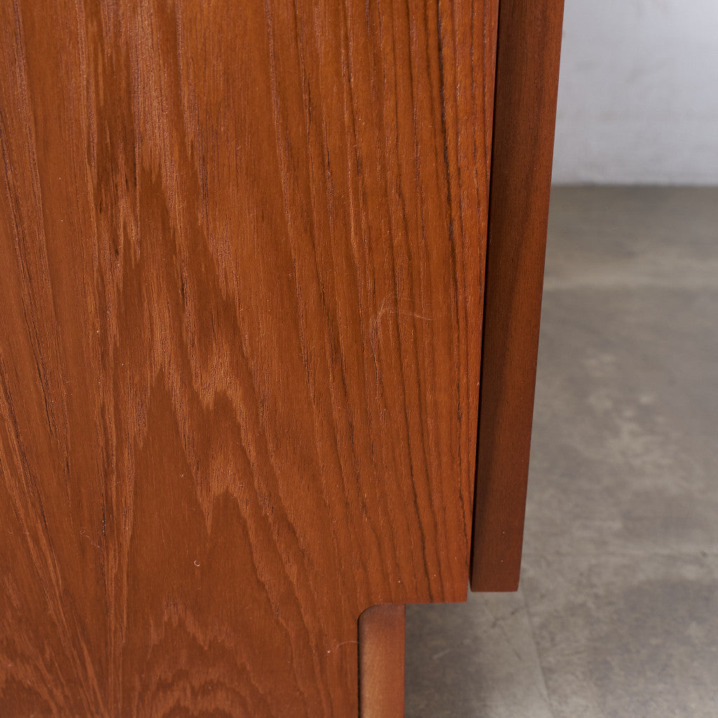 ヴィンテージチークのあたたかな質感と、少しクラシック家具寄りの前面扉框構造が印象的。洗練された手の込んだ英国らしいお品で、G-PLANやMcIntoshと比べて流通が少ないこともコレクター心をくすぐります。