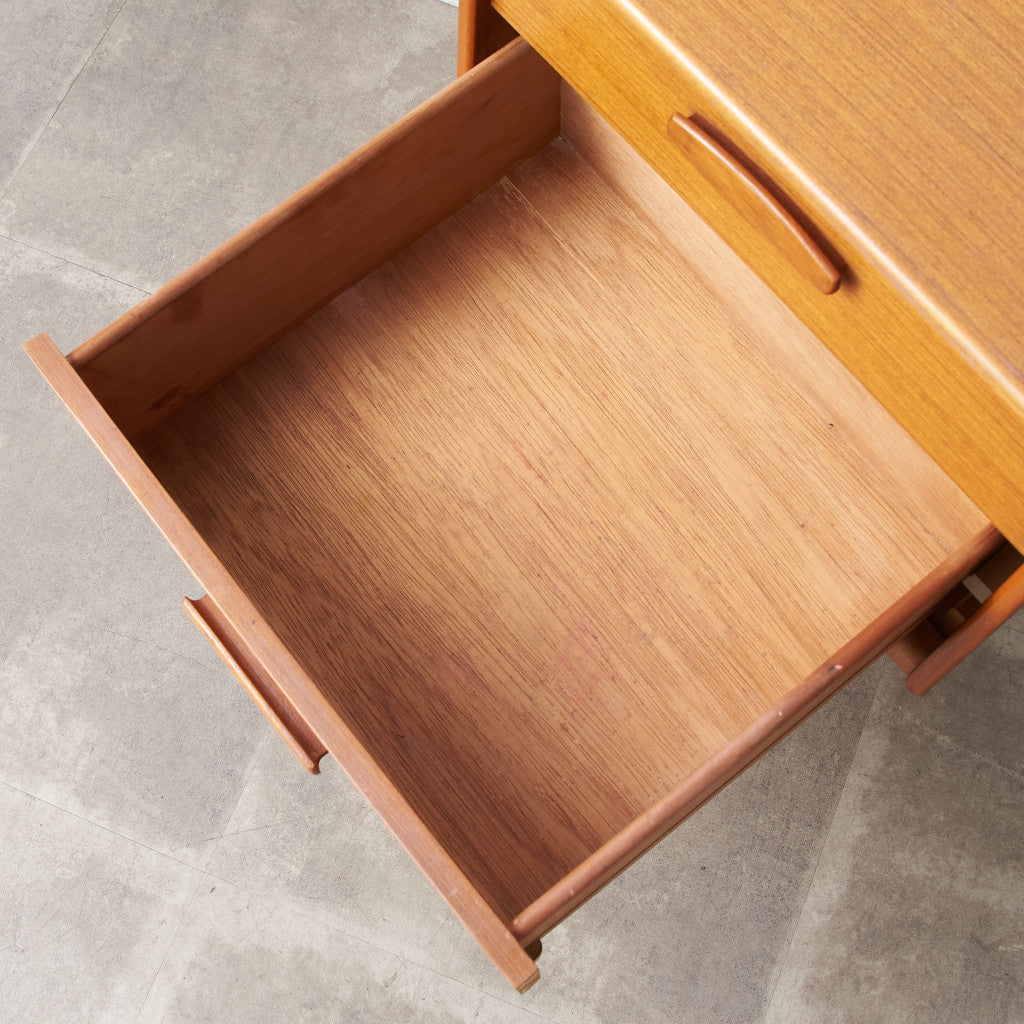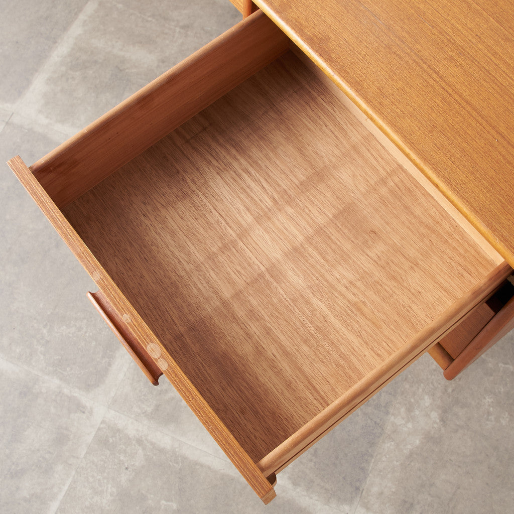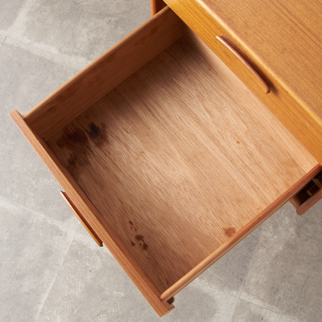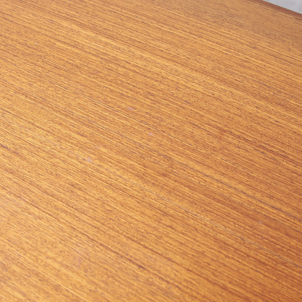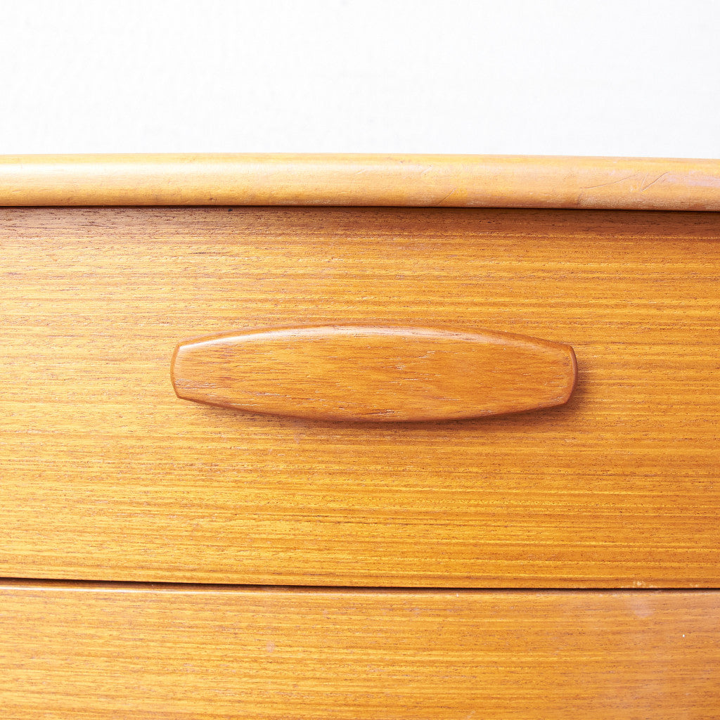 今では希少な高級材であるチーク材を使用した温かみのある褐色の木肌が印象的。研ぎ出された滑らかな取っ手など、実用的でありながらも作り手のこだわりを感じさせるヴィンテージファニチャーです。