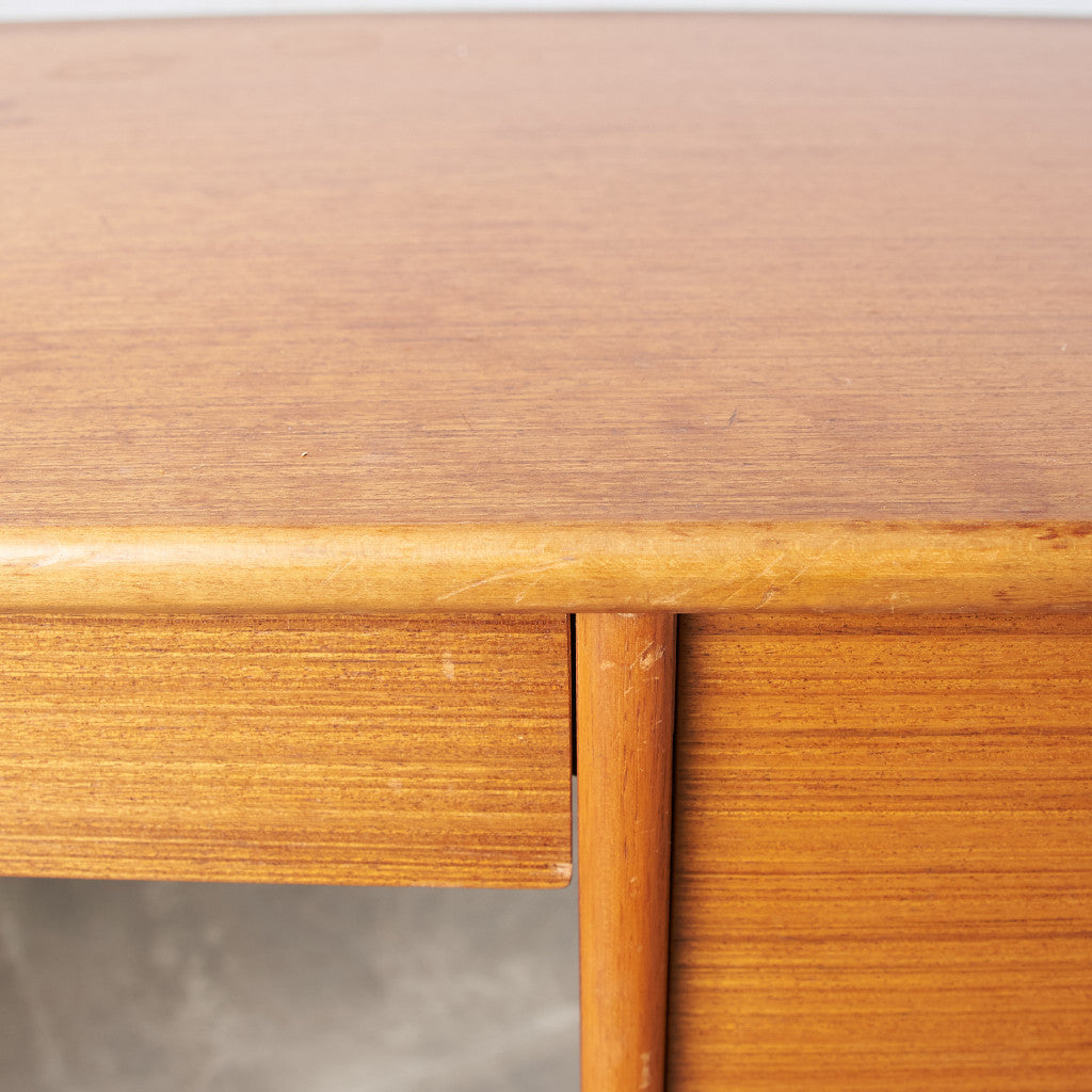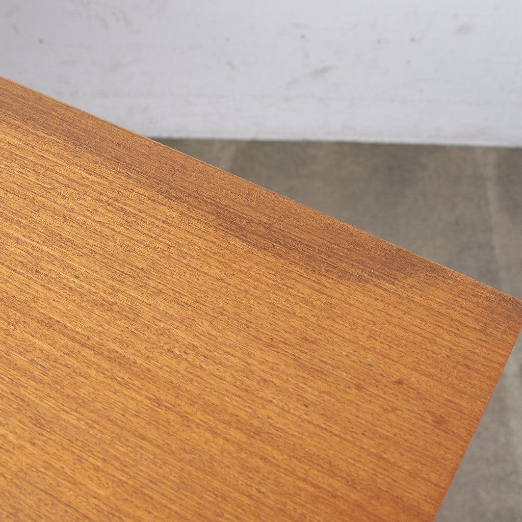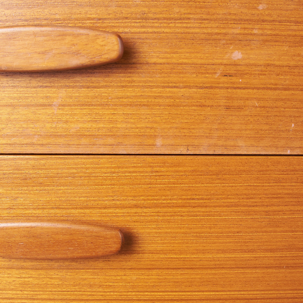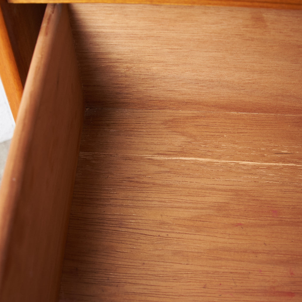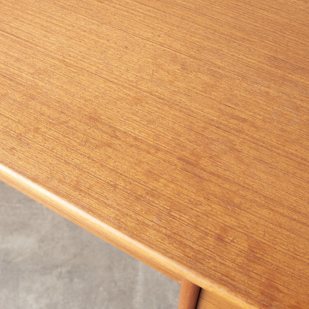 今では希少な高級材であるチーク材を使用した温かみのある褐色の木肌が印象的。研ぎ出された滑らかな取っ手など、実用的でありながらも作り手のこだわりを感じさせるヴィンテージファニチャーです。