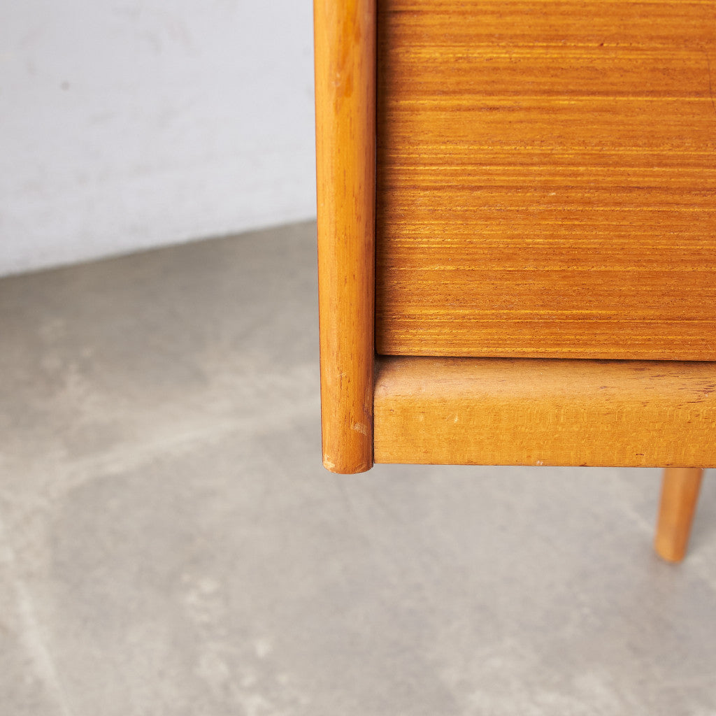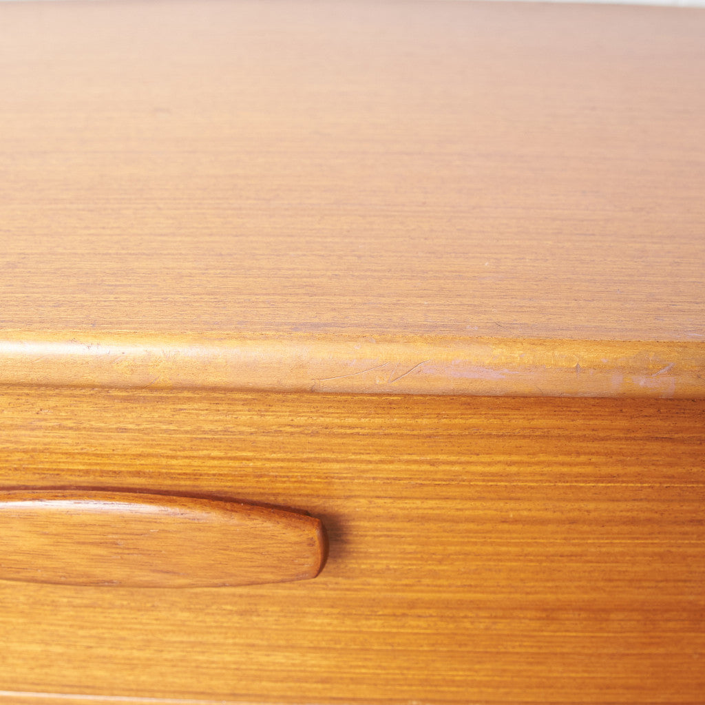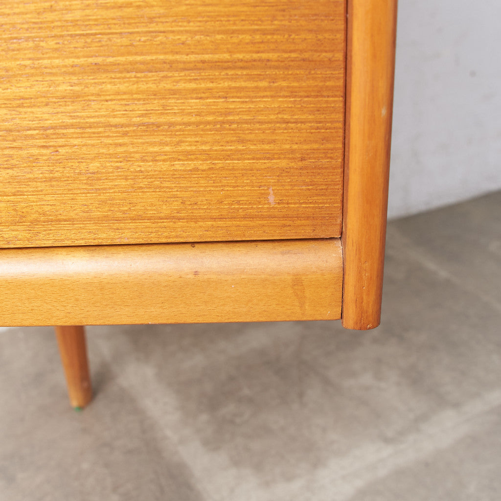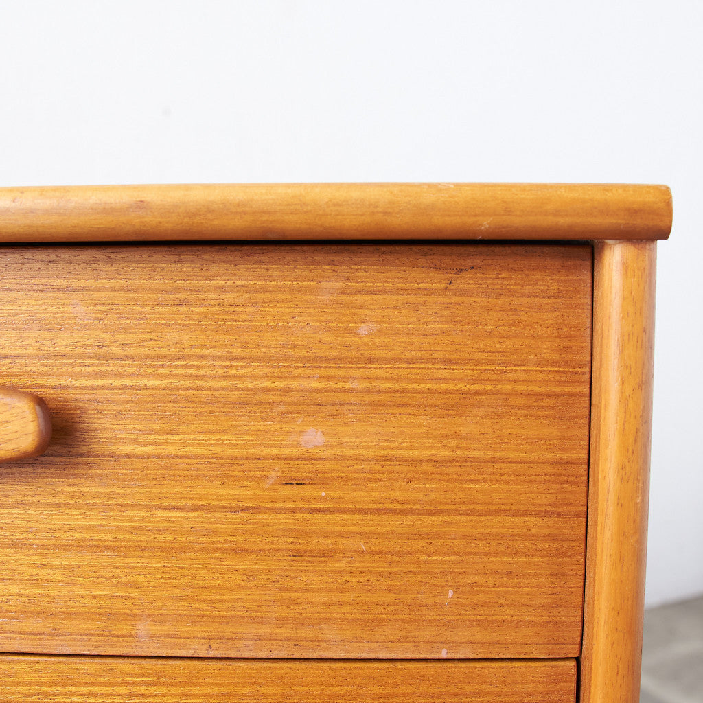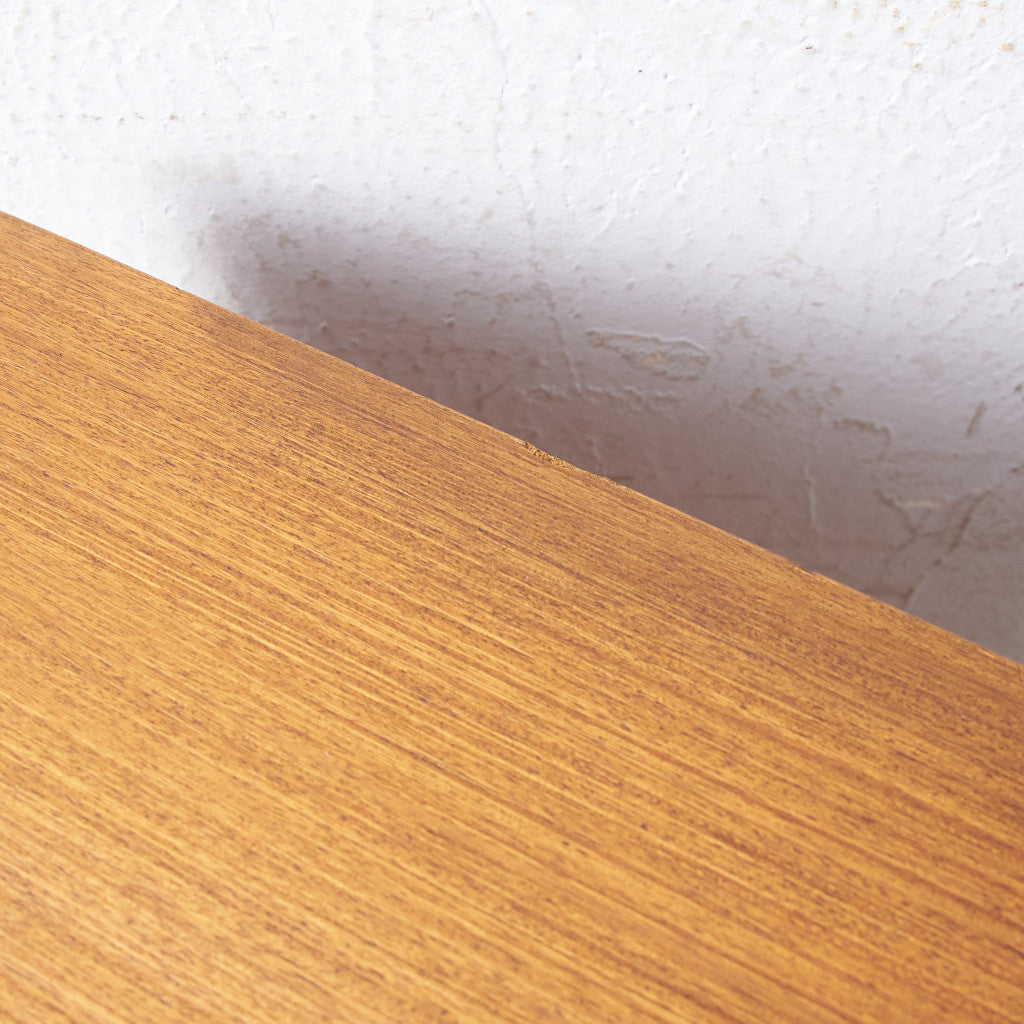 今では希少な高級材であるチーク材を使用した温かみのある褐色の木肌が印象的。研ぎ出された滑らかな取っ手など、実用的でありながらも作り手のこだわりを感じさせるヴィンテージファニチャーです。