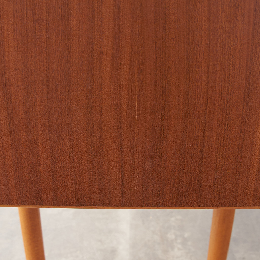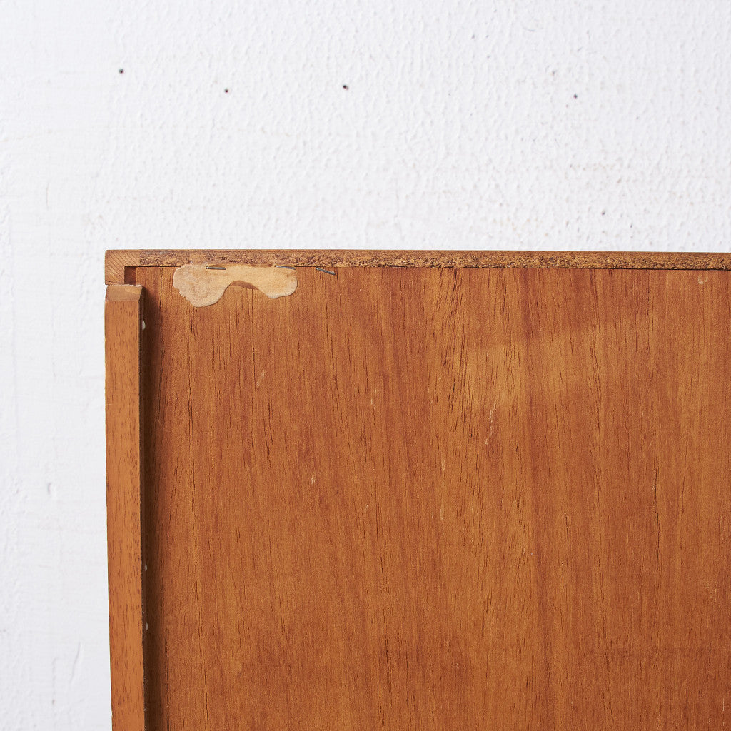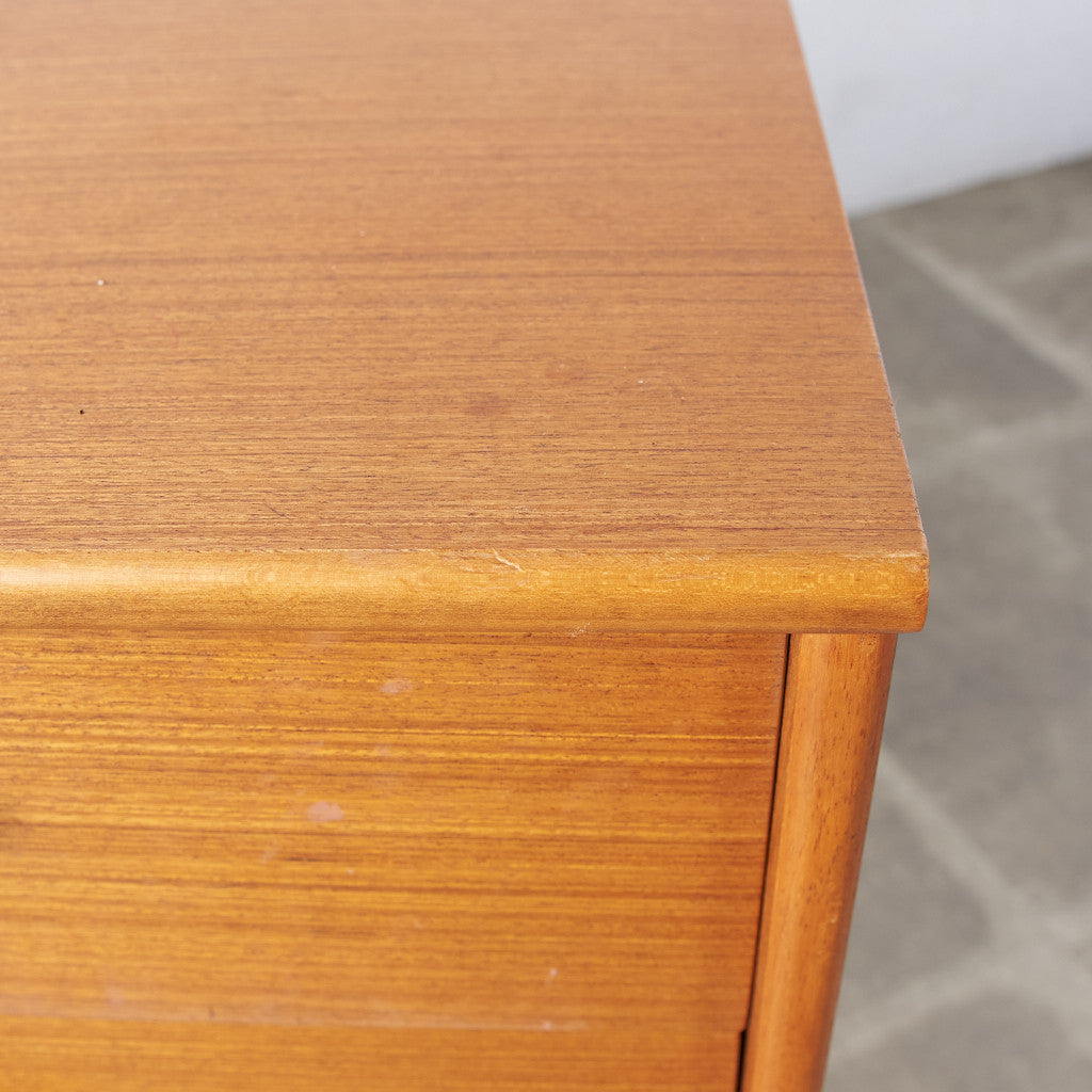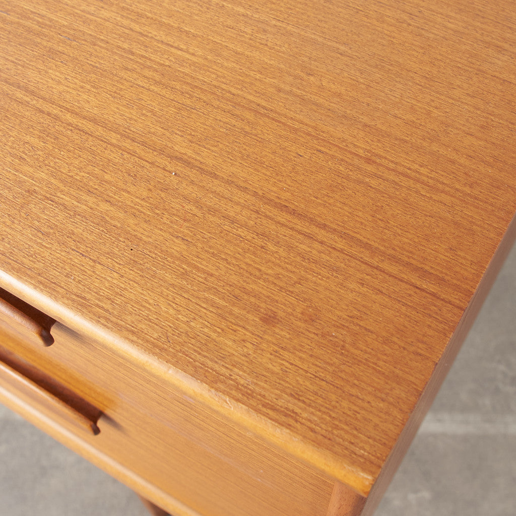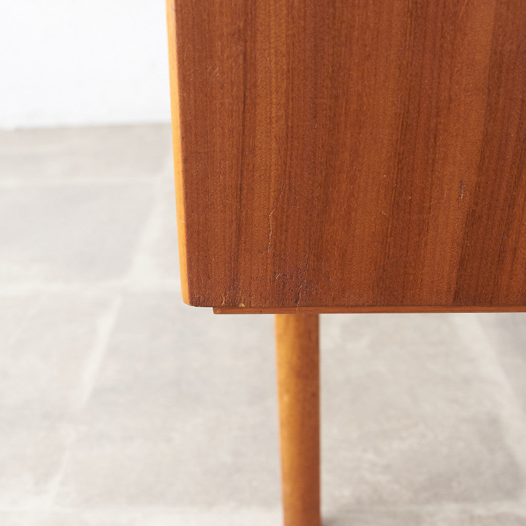 今では希少な高級材であるチーク材を使用した温かみのある褐色の木肌が印象的。研ぎ出された滑らかな取っ手など、実用的でありながらも作り手のこだわりを感じさせるヴィンテージファニチャーです。