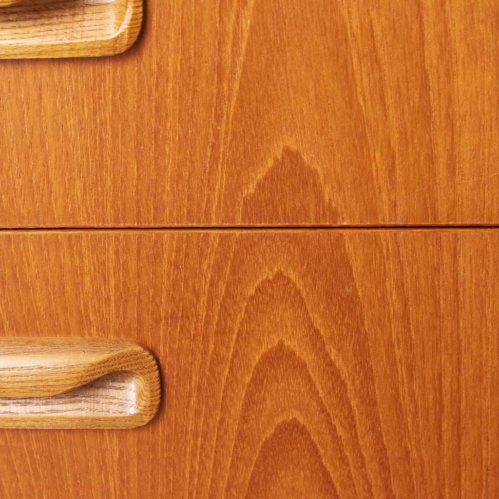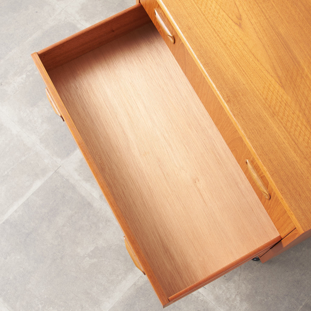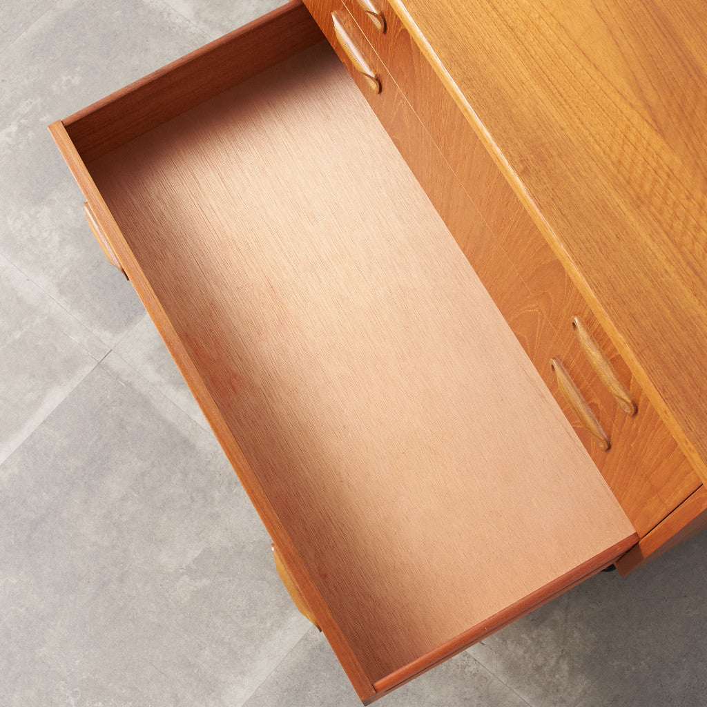 英国ミッドセンチュリーの筆頭ブランド、G-PLAN(ジープラン)による、Victor Bramwell Wilkins(ビクター・ブラムウェル・ウィルキンス)デザイン『Fresco(フレスコ)』シリーズ、カスタム アイアンレッグ 3段チェストです。