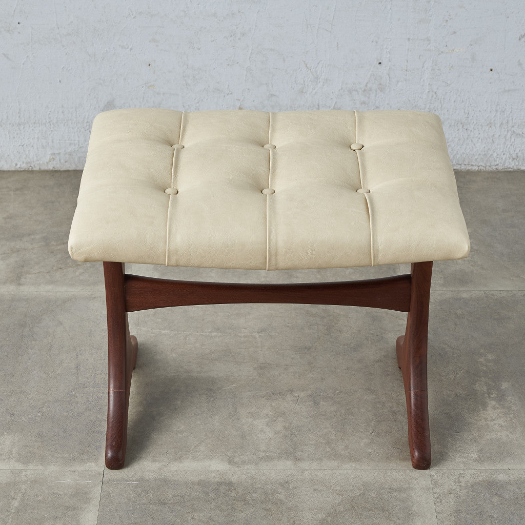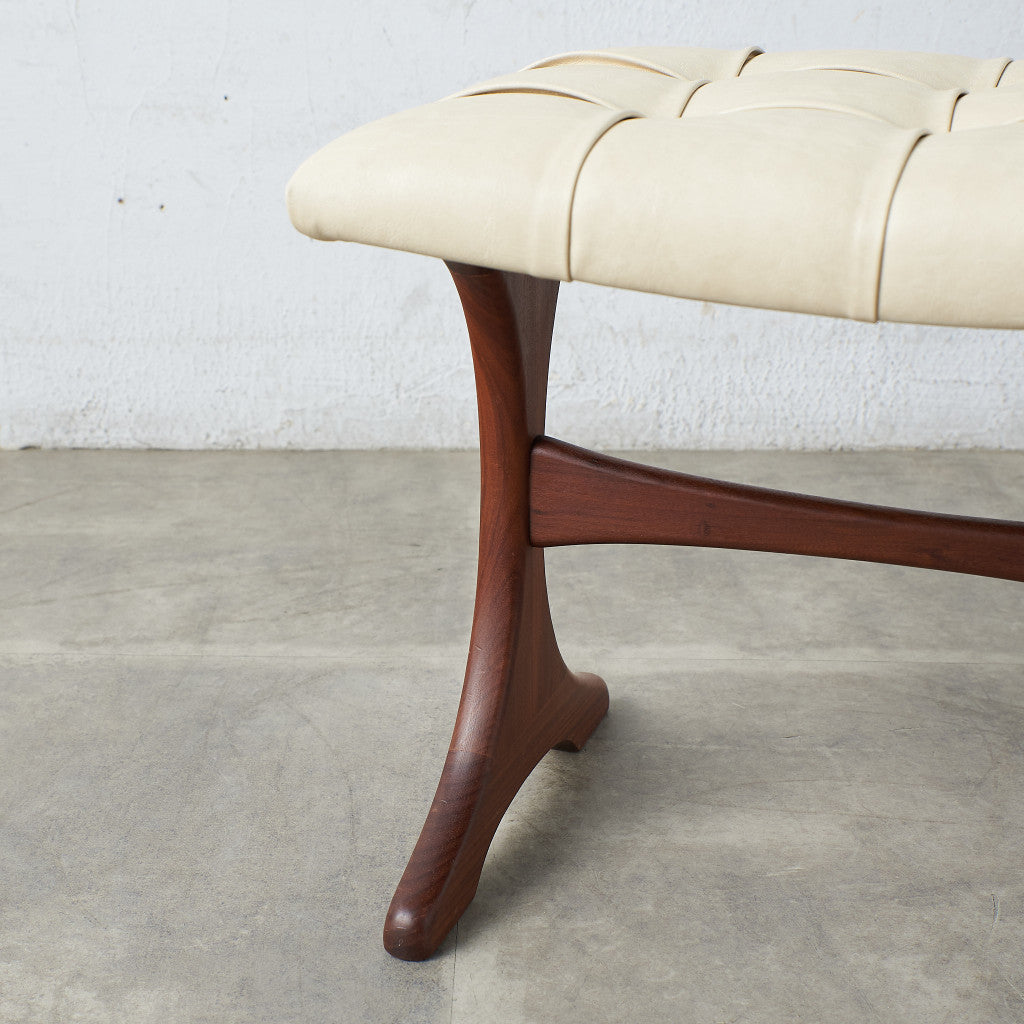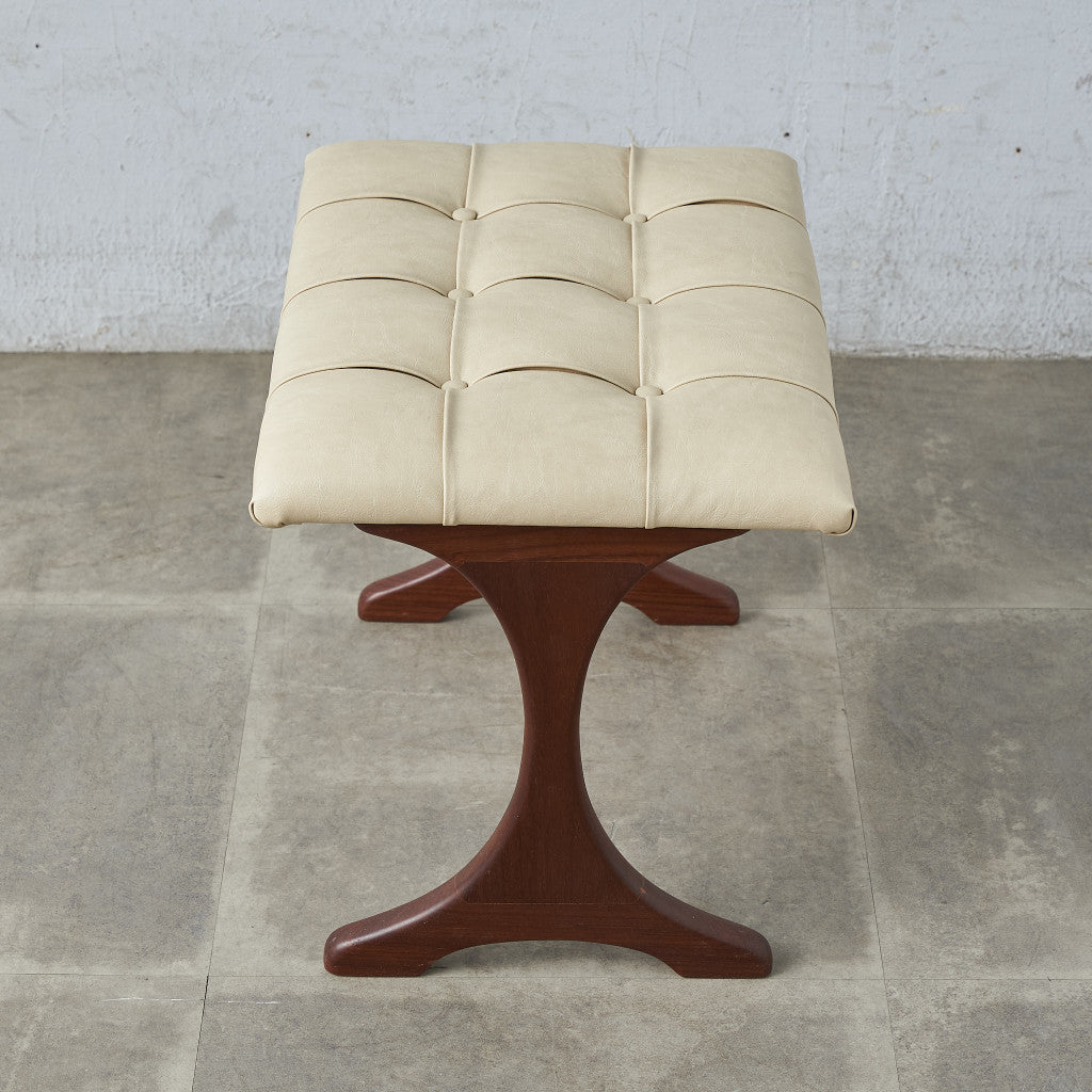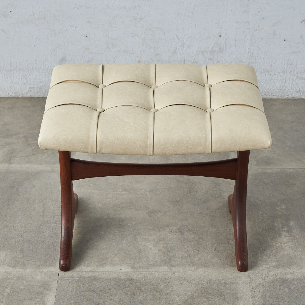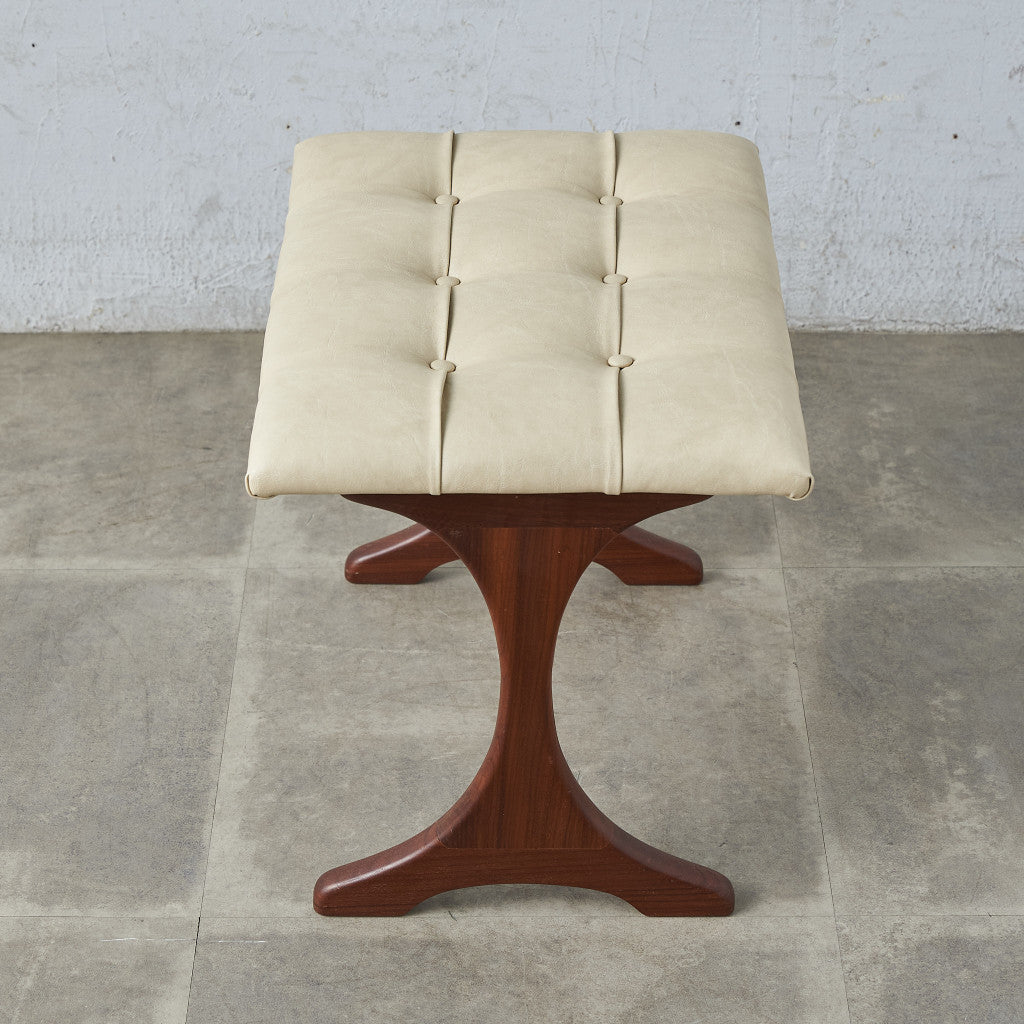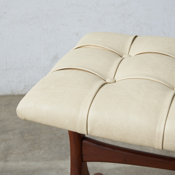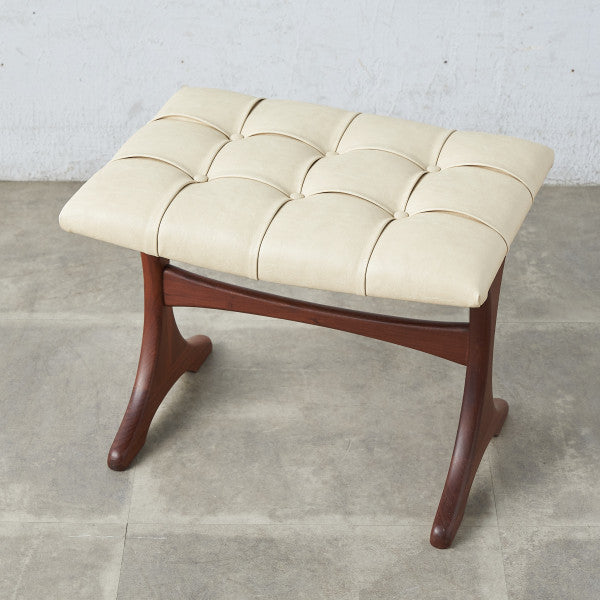 美しくくびれた脚が女性的な印象を与えるFrescoシリーズのドレッシングスツール。デンマーク的な木製フレームとワッフル状のボタン締めのによる英国的なデザインの組み合わせがユニークです。定番のドレッシングデスクとの組み合わせやダイニングの補助椅子、オットマン等、多目的に使いやすいデザインでヴィンテージ市場でも非常に人気が高く流通量が少ないため入手が困難なモデルです。