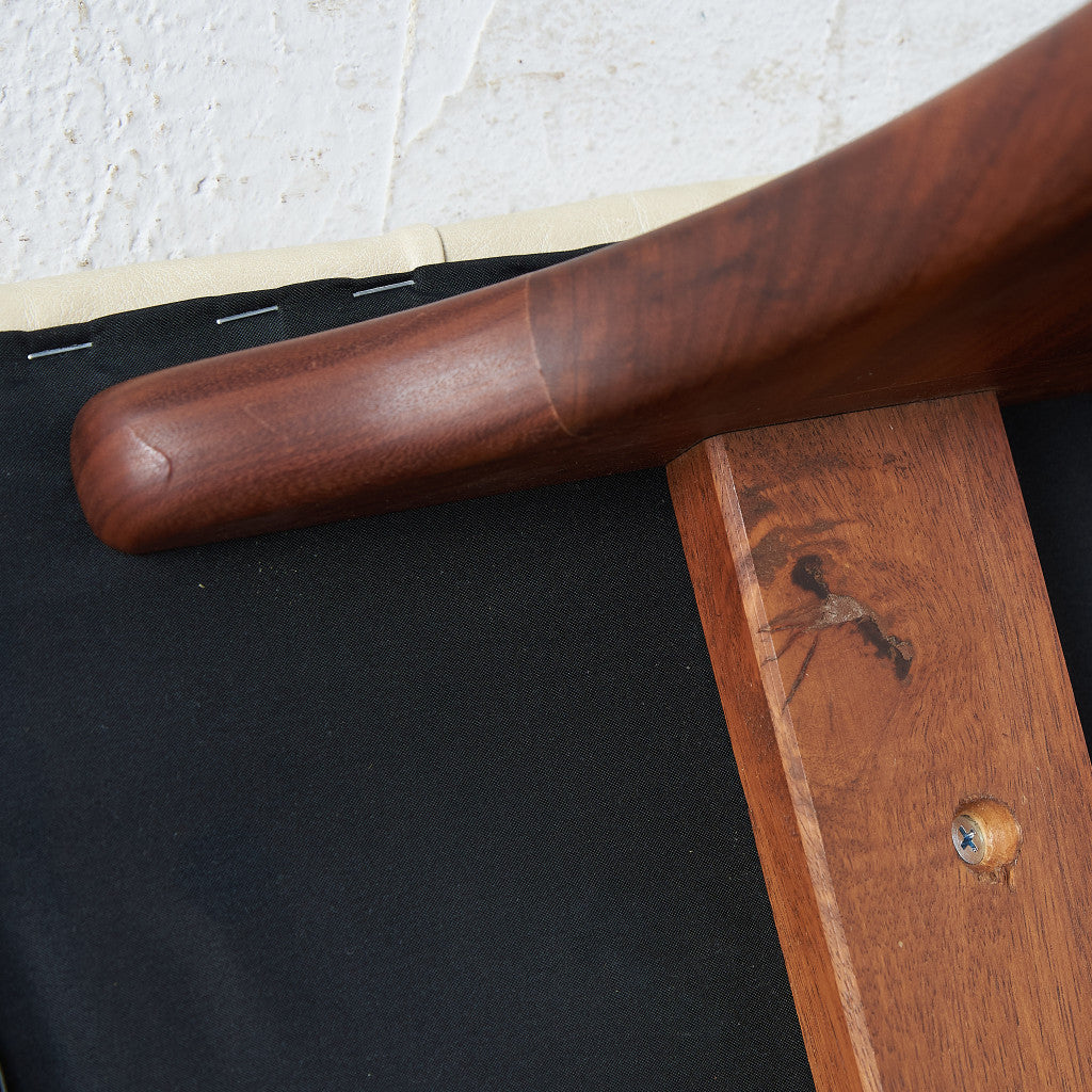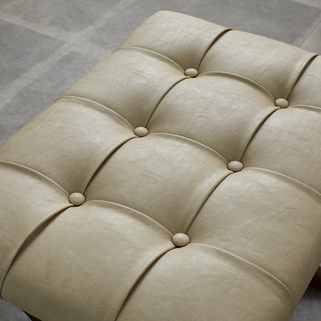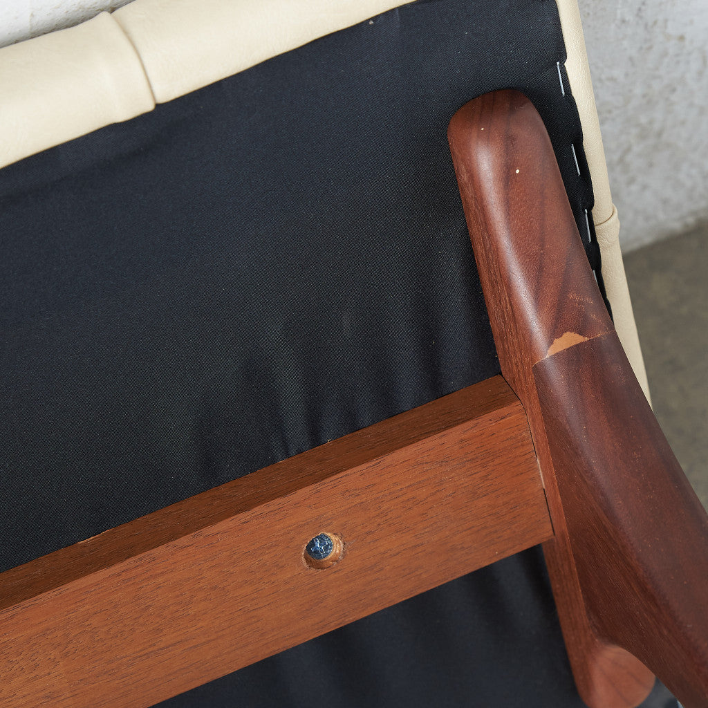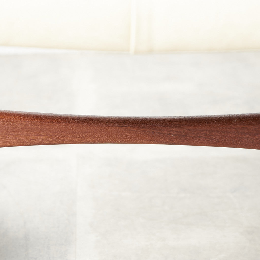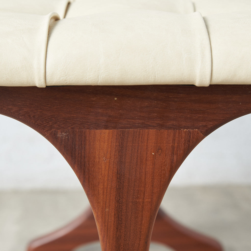 美しくくびれた脚が女性的な印象を与えるFrescoシリーズのドレッシングスツール。デンマーク的な木製フレームとワッフル状のボタン締めのによる英国的なデザインの組み合わせがユニークです。定番のドレッシングデスクとの組み合わせやダイニングの補助椅子、オットマン等、多目的に使いやすいデザインでヴィンテージ市場でも非常に人気が高く流通量が少ないため入手が困難なモデルです。