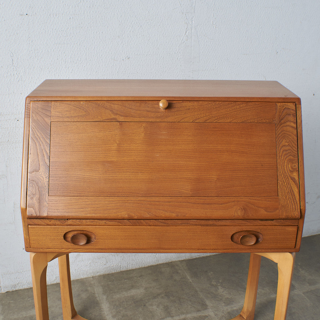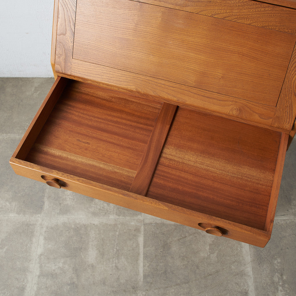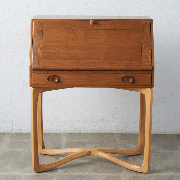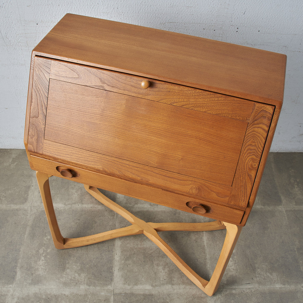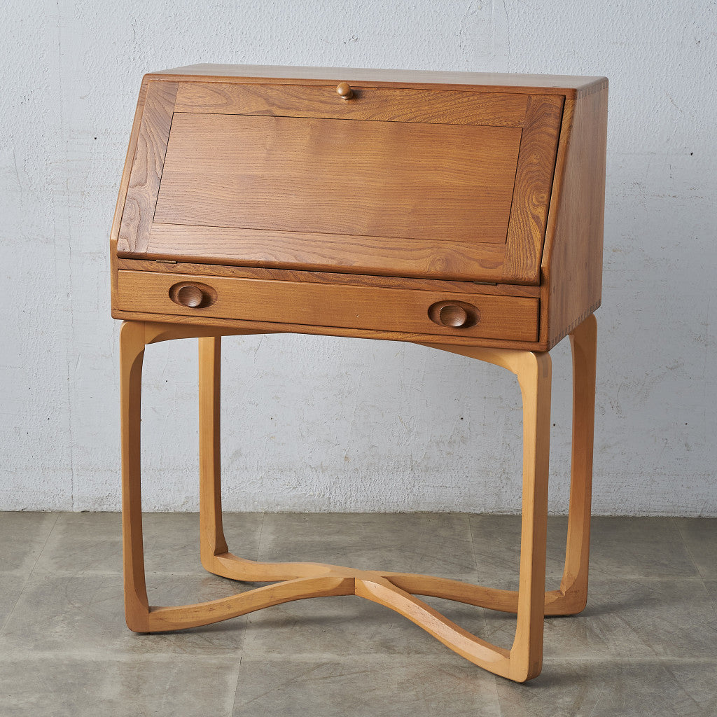 アーコール社は現存するイギリスの老舗家具メーカー。新品家具としてもアンティーク品としても同一のモデルで同様に高い支持を受け続けている稀有なブランドです。20世紀初頭にイギリスに移住してきたイタリア生まれの家具デザイナー "ルシアン・アーコラーニ"によって、1920年にハイ・ワイコムにアーコールファニチャーは設立されました。ERCOL社の成功のポイントとして当時乾燥が難しく歪みが生じるため家具材としては不適格として安価であったエルム材の乾燥方法を編み出したことがあります。ウィンザーチェアーに代表される伝統的な製法と、モダンデザインを融合させたコレクションは、さりげないデザインで軽やかでシンプル。1957年デザインのスタッキングチャイルドチェアーは、小学校などの施設で多く使用され一躍ベストセラーブランドとなりました。近年マーガレット・ハウエル(英国の服飾デザイナー)は、アーコール社スタッキングチャイルドチェアーのヴィンテージ品をロンドンショップで展示し、アーコールチェアーは大好評を得ることになりました。それをきっかけにアーコール社は2002年から同商品の復刻版の製造を開始するまでになります。 その後マーガレット・ハウエルのショップでもこの復刻版は販売されることとなり、たちまち人気が高まりました。イエロー×ゴールドの通称ゴールドラベルがついた1960年代〜70年代頃アーコール全盛期の品物は以前よりプレミアム的に価値で取引されておりましたが、近年ではそれ以前のヴィンテージ品ブルーラベルのお品物も含めてイギリス現地で一昔前の倍近くの取引相場にまで高騰しています。