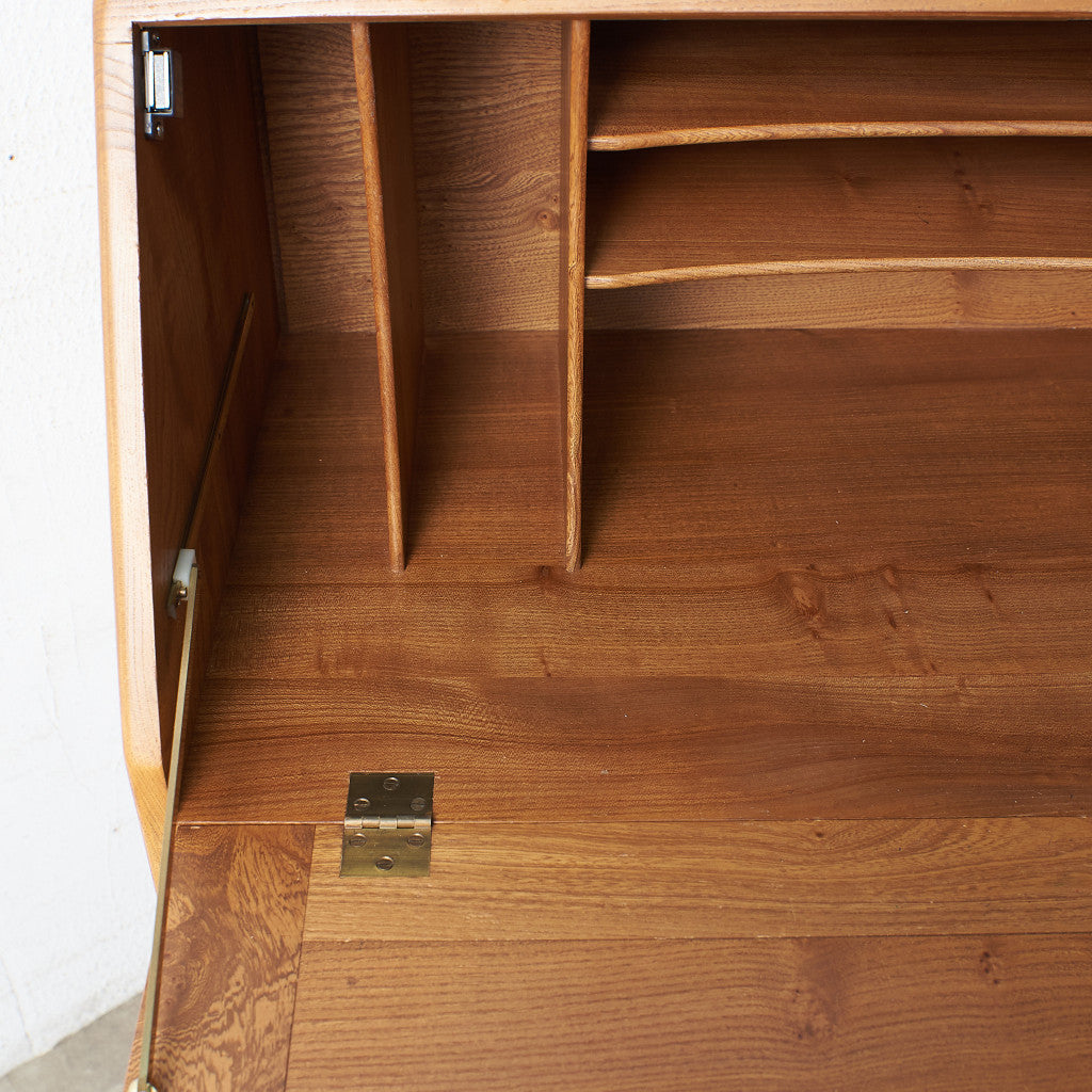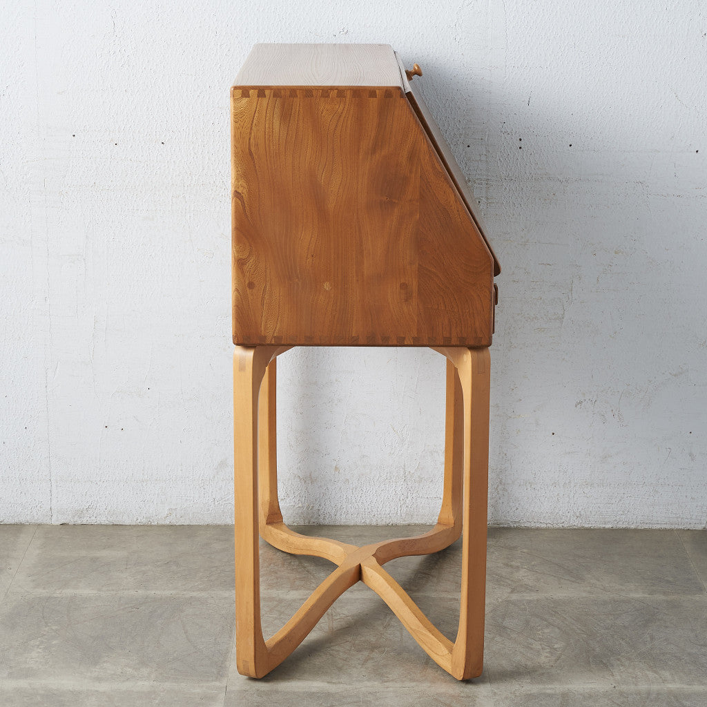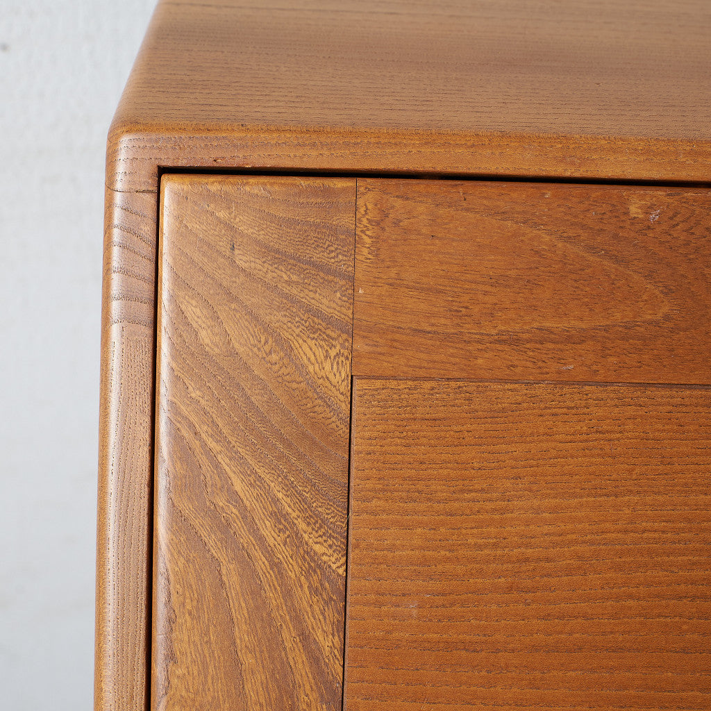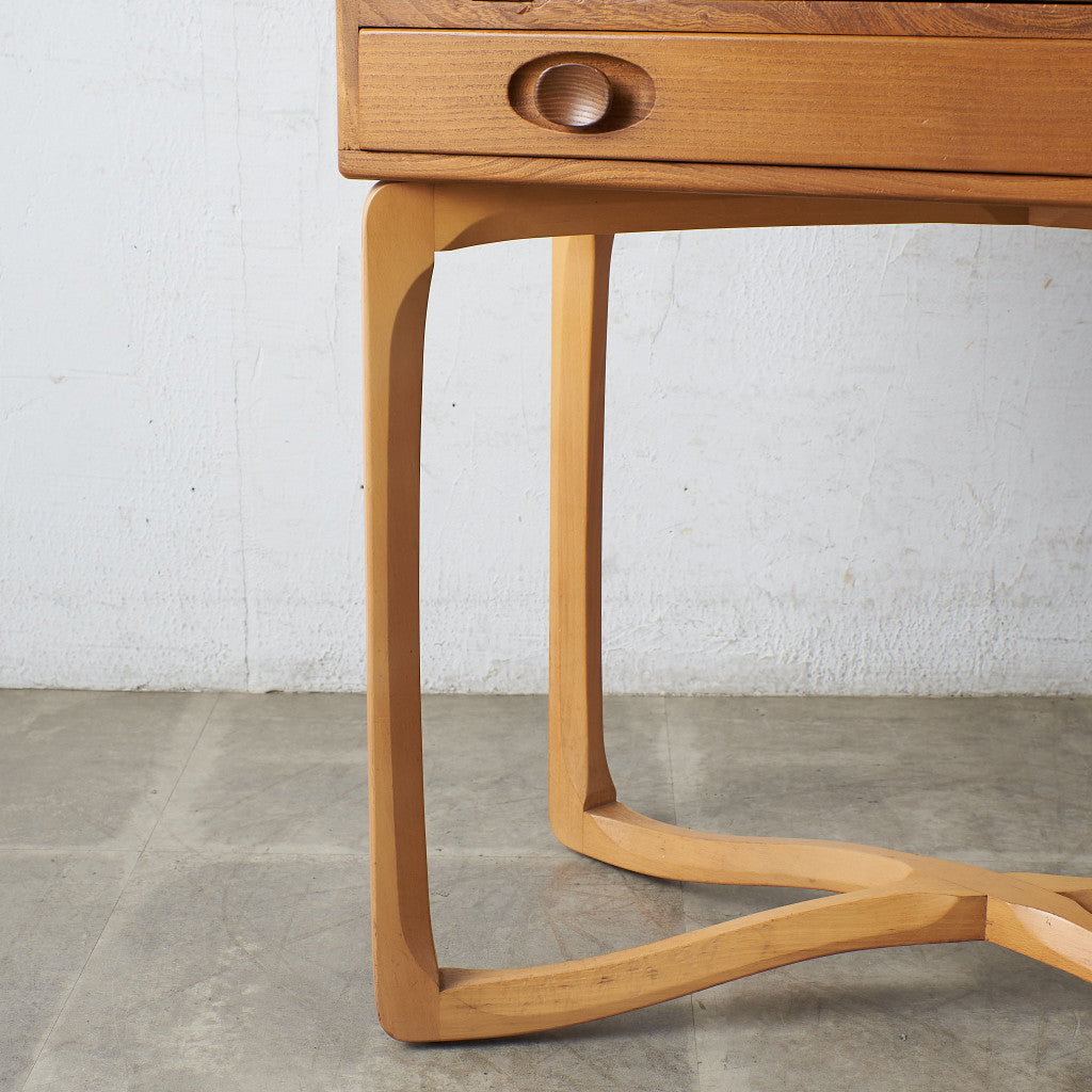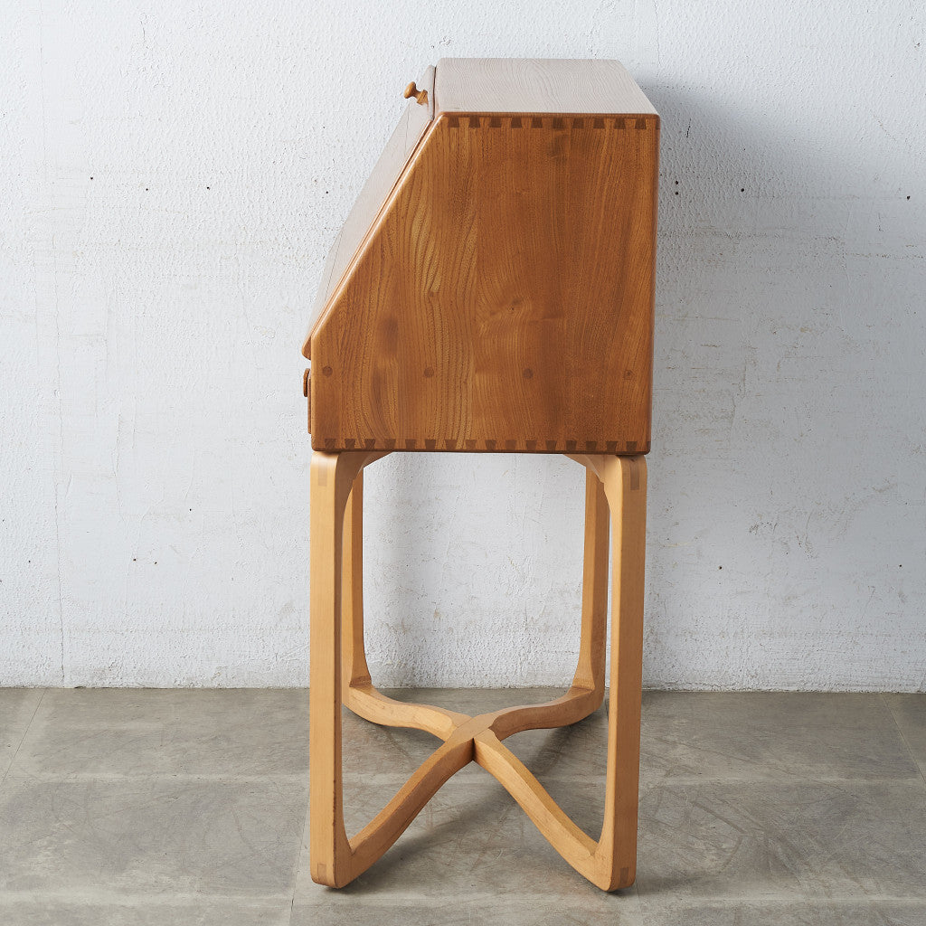 アーコール社は現存するイギリスの老舗家具メーカー。新品家具としてもアンティーク品としても同一のモデルで同様に高い支持を受け続けている稀有なブランドです。20世紀初頭にイギリスに移住してきたイタリア生まれの家具デザイナー "ルシアン・アーコラーニ"によって、1920年にハイ・ワイコムにアーコールファニチャーは設立されました。ERCOL社の成功のポイントとして当時乾燥が難しく歪みが生じるため家具材としては不適格として安価であったエルム材の乾燥方法を編み出したことがあります。ウィンザーチェアーに代表される伝統的な製法と、モダンデザインを融合させたコレクションは、さりげないデザインで軽やかでシンプル。1957年デザインのスタッキングチャイルドチェアーは、小学校などの施設で多く使用され一躍ベストセラーブランドとなりました。近年マーガレット・ハウエル(英国の服飾デザイナー)は、アーコール社スタッキングチャイルドチェアーのヴィンテージ品をロンドンショップで展示し、アーコールチェアーは大好評を得ることになりました。それをきっかけにアーコール社は2002年から同商品の復刻版の製造を開始するまでになります。 その後マーガレット・ハウエルのショップでもこの復刻版は販売されることとなり、たちまち人気が高まりました。イエロー×ゴールドの通称ゴールドラベルがついた1960年代〜70年代頃アーコール全盛期の品物は以前よりプレミアム的に価値で取引されておりましたが、近年ではそれ以前のヴィンテージ品ブルーラベルのお品物も含めてイギリス現地で一昔前の倍近くの取引相場にまで高騰しています。