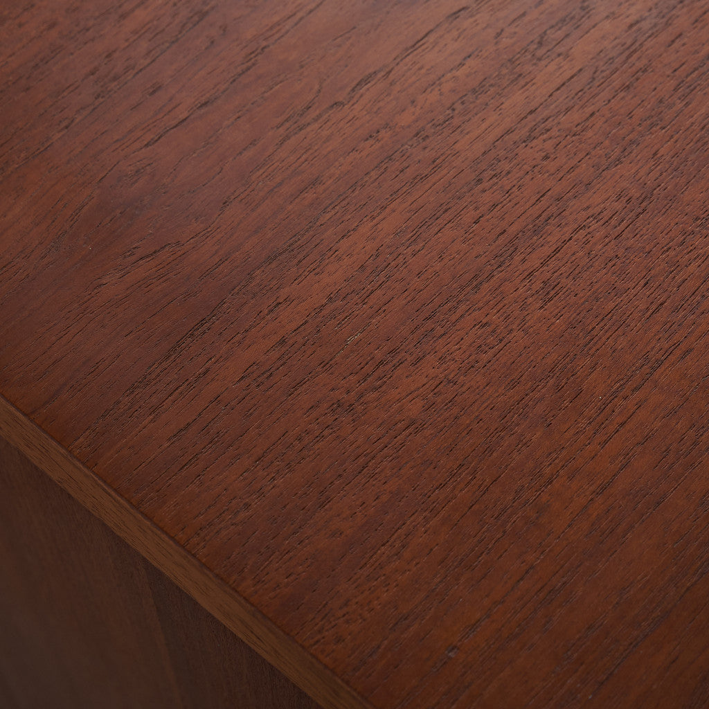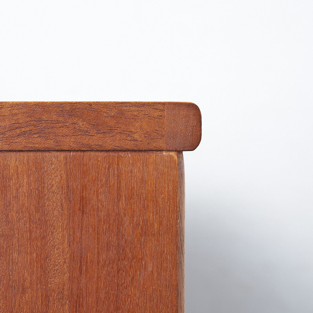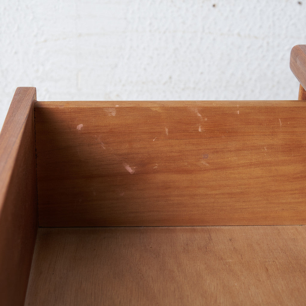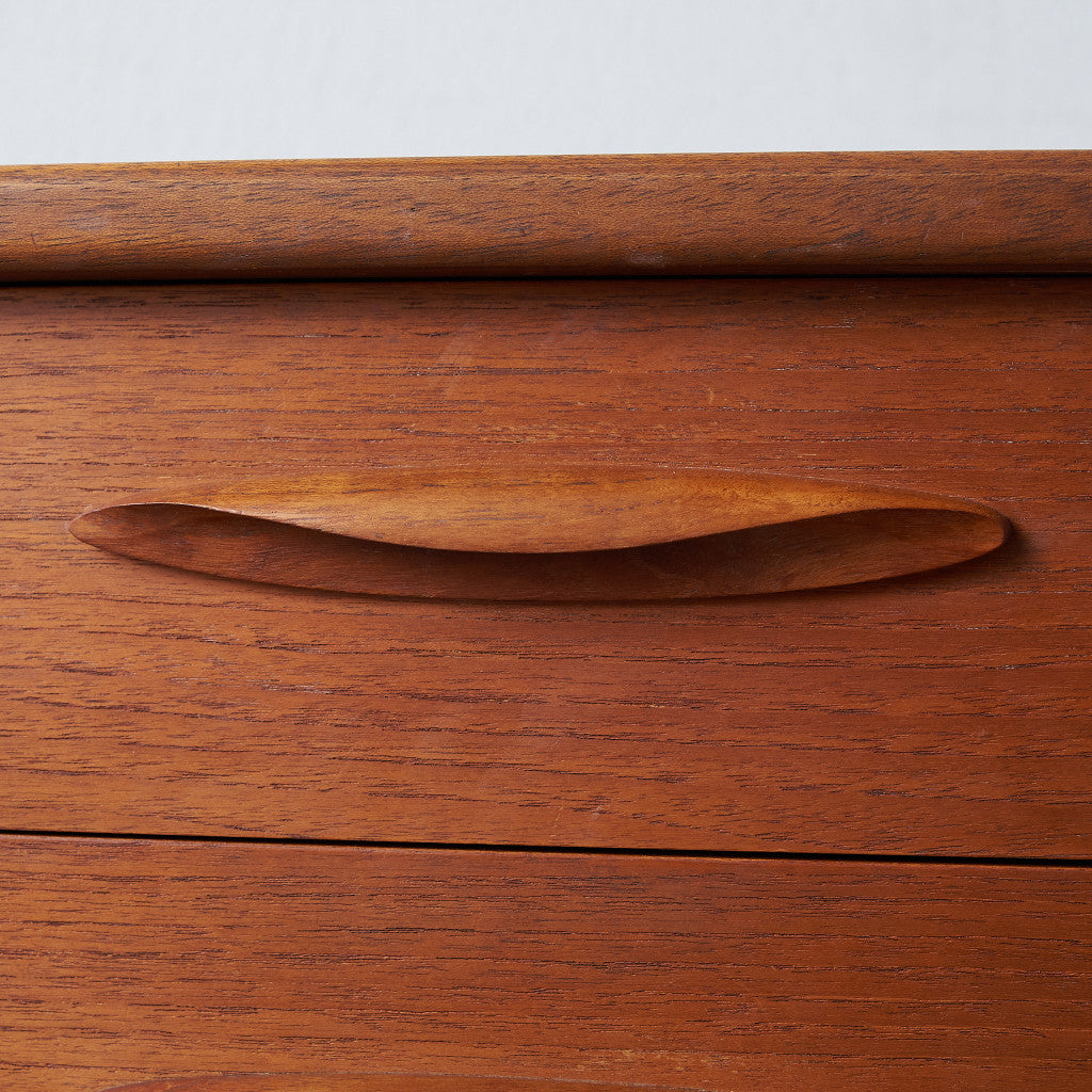 今では希少な高級材であるチーク材を使用した温かみのある褐色の木肌が印象的。ペーパーナイフのように研ぎ出された滑らかな取っ手が美しく、実用的でありながらも作り手のこだわりを感じさせるヴィンテージファニチャーです。