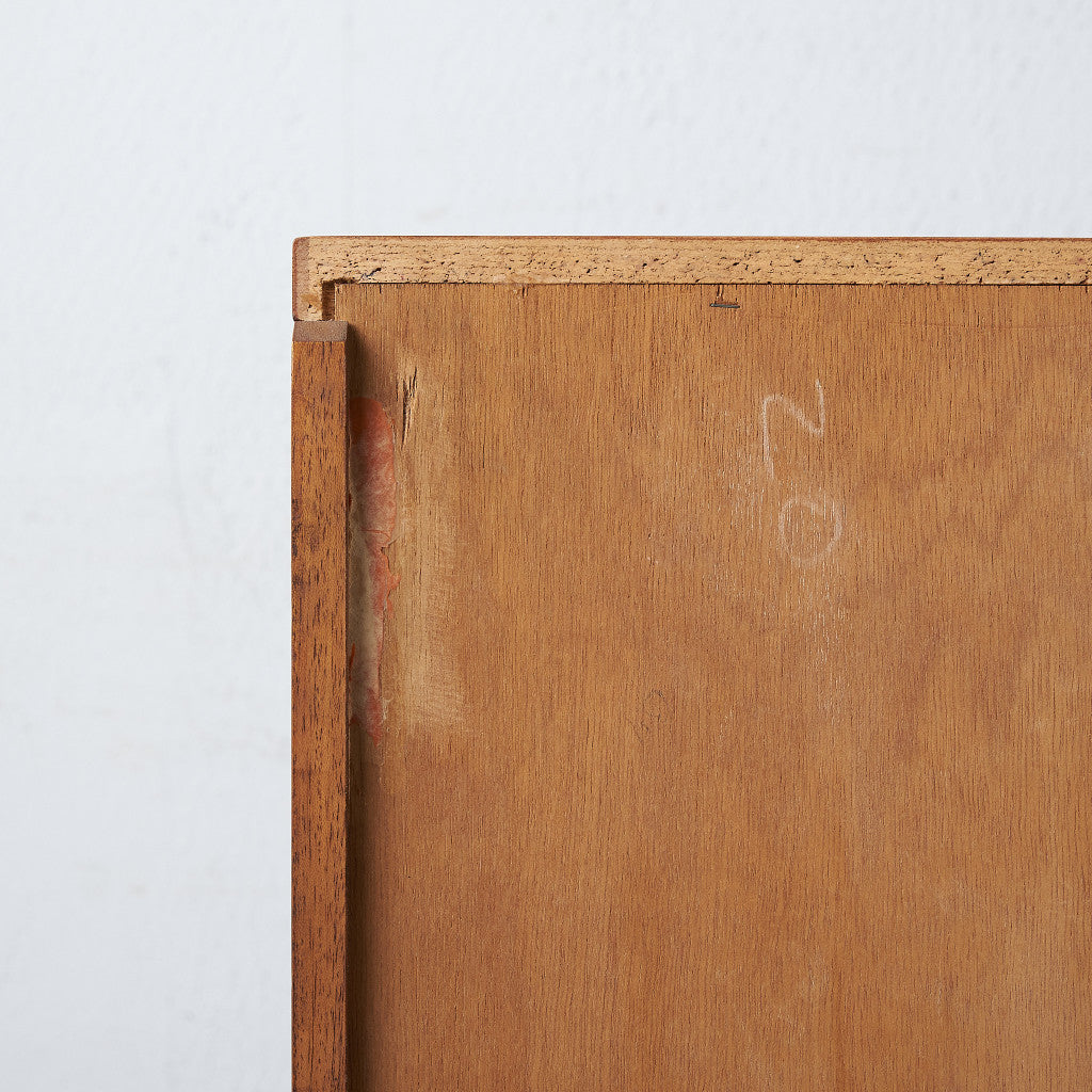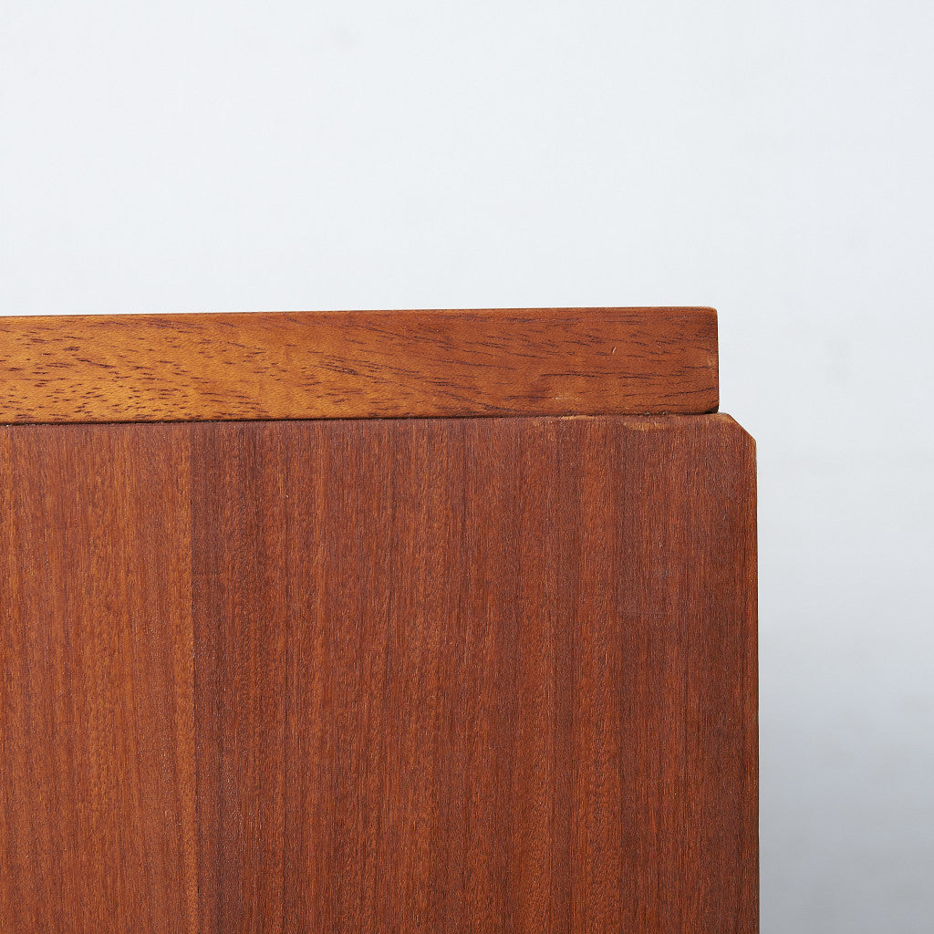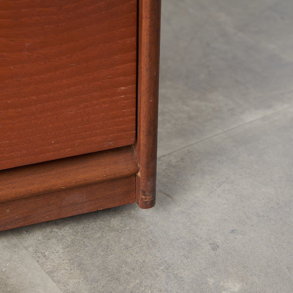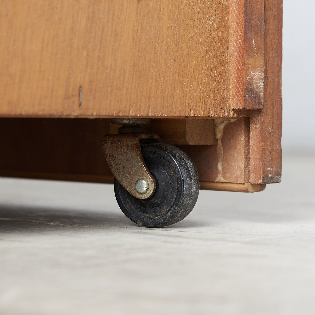 今では希少な高級材であるチーク材を使用した温かみのある褐色の木肌が印象的。ペーパーナイフのように研ぎ出された滑らかな取っ手が美しく、実用的でありながらも作り手のこだわりを感じさせるヴィンテージファニチャーです。