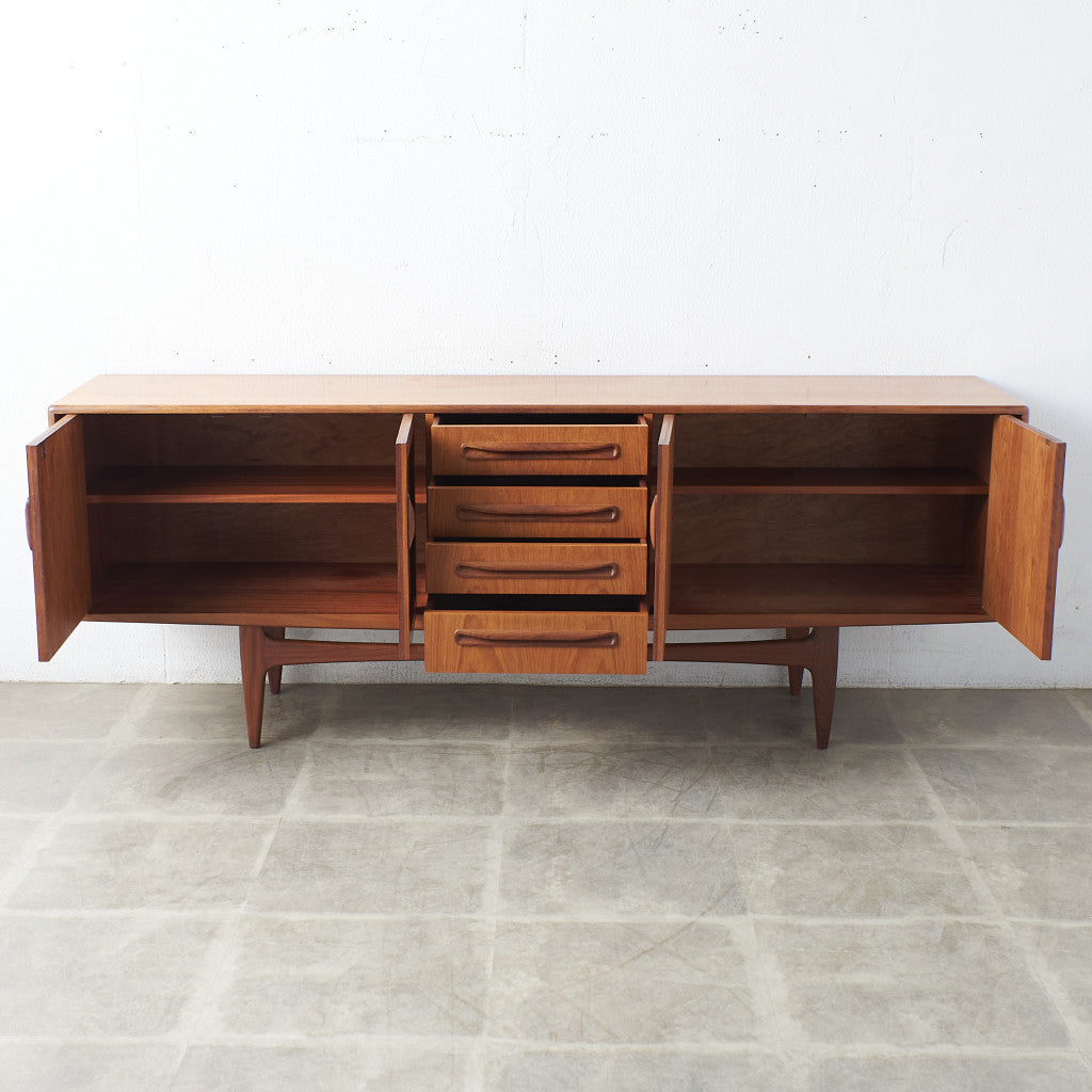 英国ミッドセンチュリー期を代表するブランド G-PLAN(ジープラン) による、Victor Bramwell Wilkins(ビクター・ブラムウェル・ウィルキンス)デザイン『Fresco(フレスコ)』脚付きロングサイドボードです。