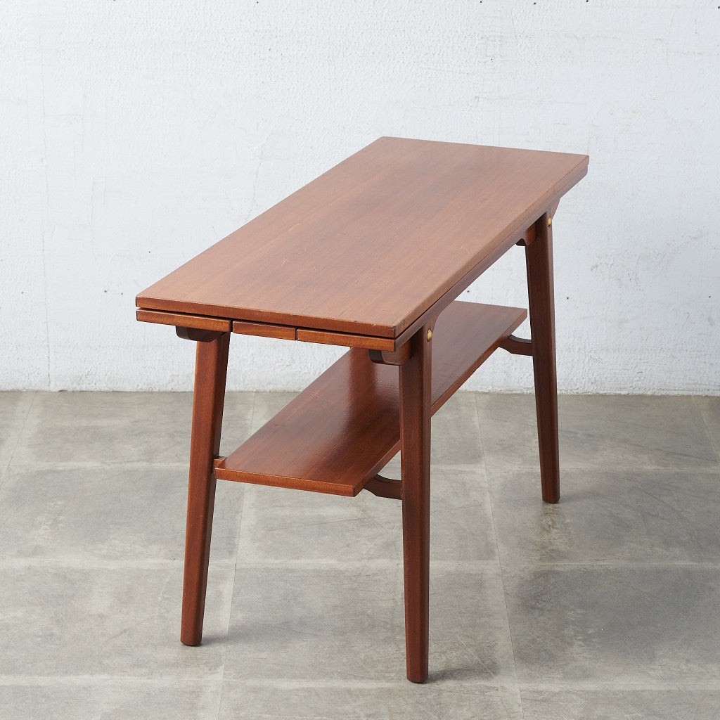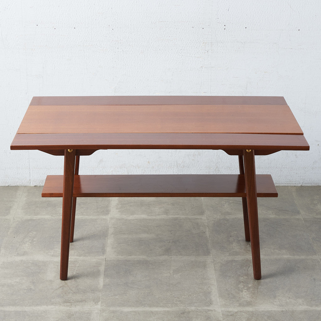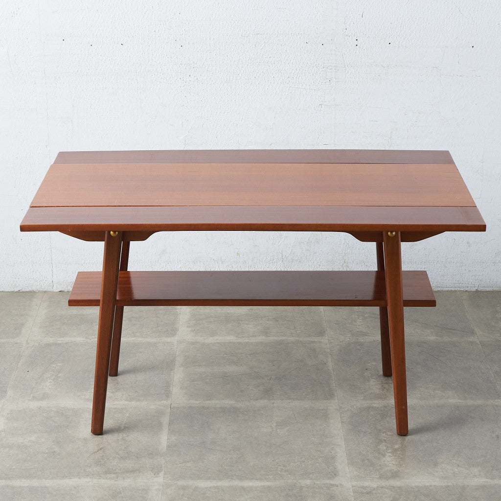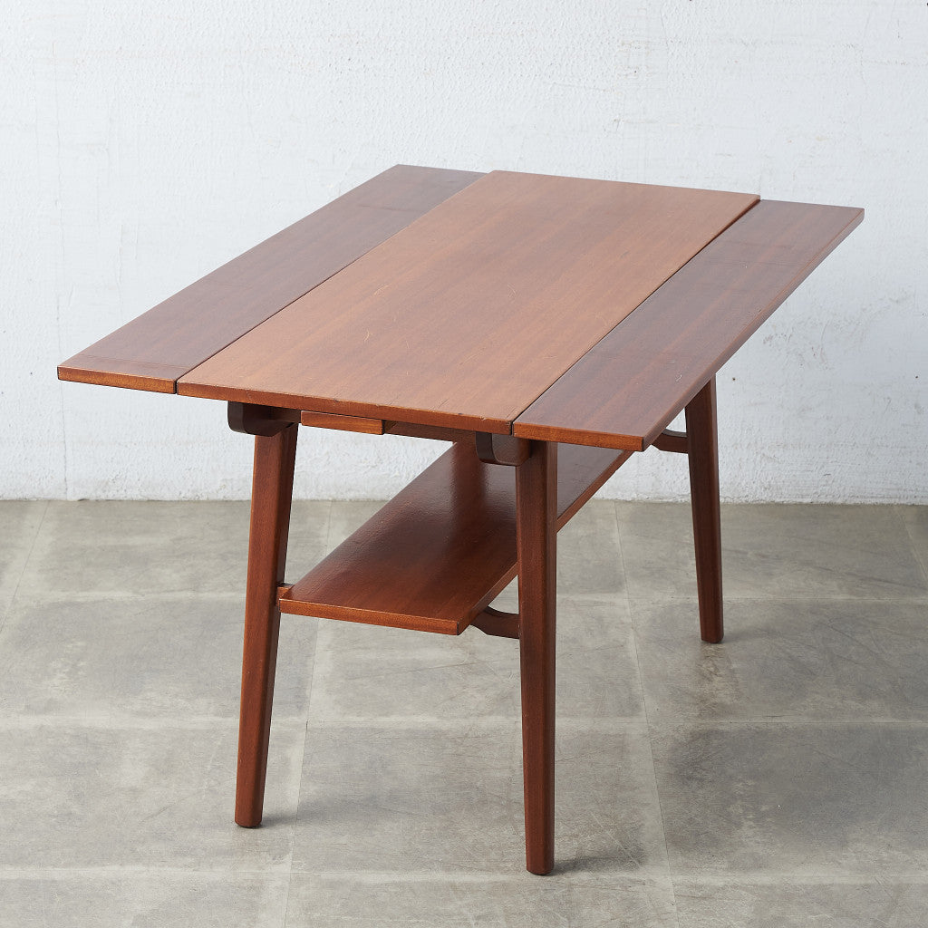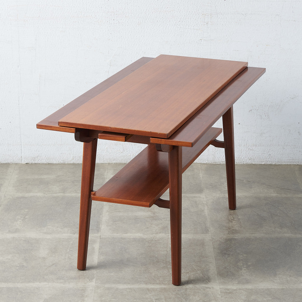 長辺が展開する珍しい仕様のコーヒーテーブル。片側天板だけを引き出して使うなど、必要に応じて便利にお使いいただけます。実用的でありながらも作り手のこだわりを感じさせる北欧の年代物とも相性の良いヴィンテージファニチャーです。