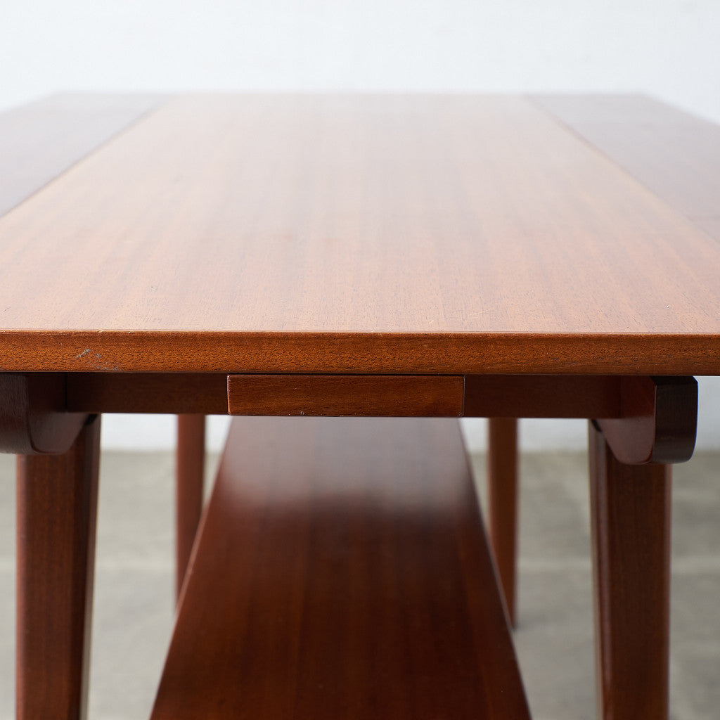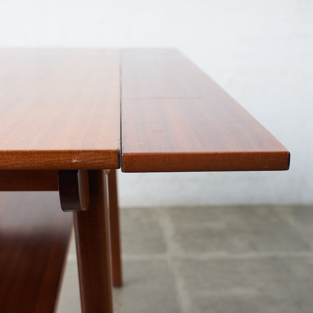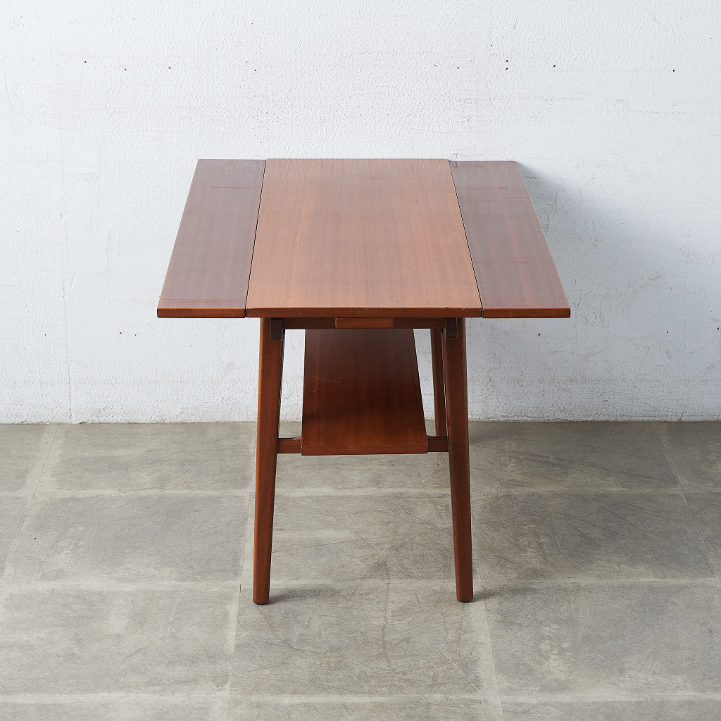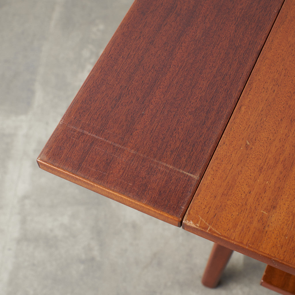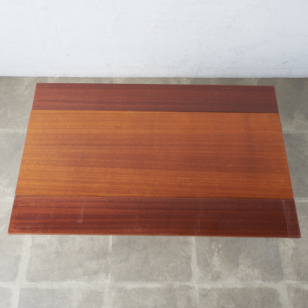 長辺が展開する珍しい仕様のコーヒーテーブル。片側天板だけを引き出して使うなど、必要に応じて便利にお使いいただけます。実用的でありながらも作り手のこだわりを感じさせる北欧の年代物とも相性の良いヴィンテージファニチャーです。
