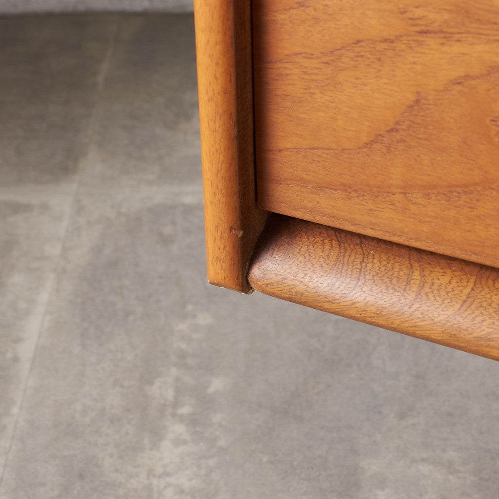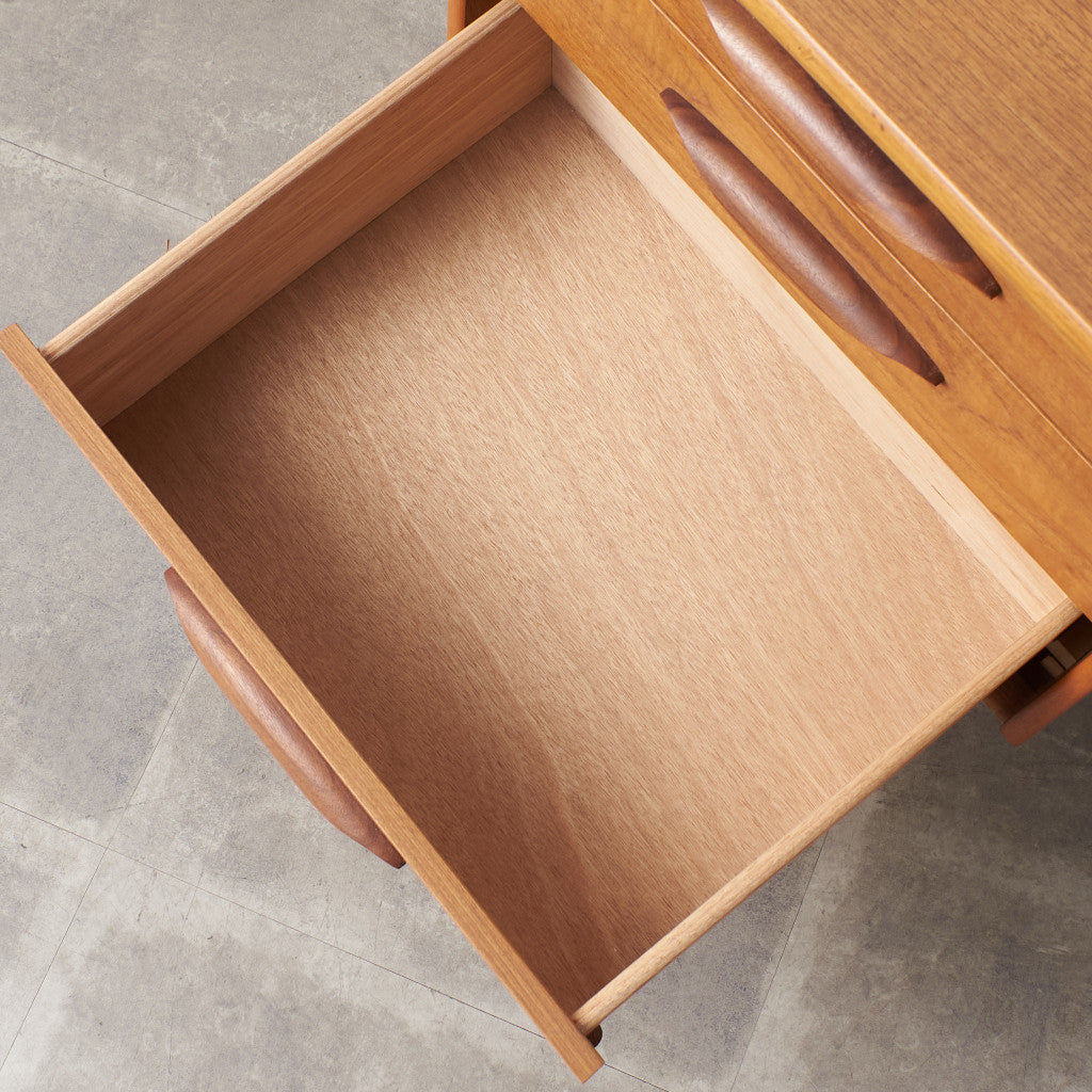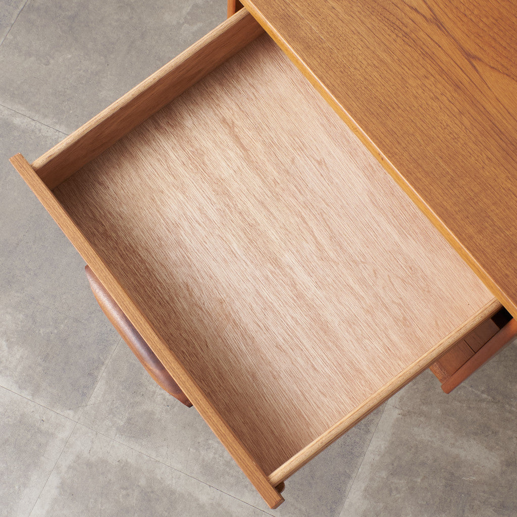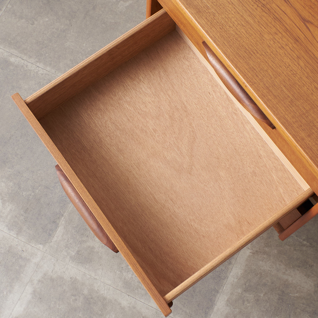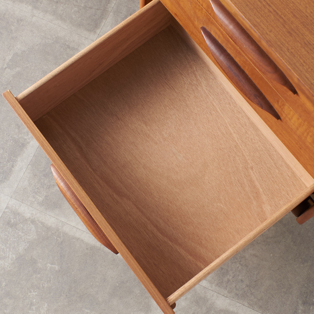 今では希少な高級材であるチーク材を使用した温かみのある褐色の木肌が印象的。研ぎ出された滑らかな取っ手など、実用的でありながらも作り手のこだわりを感じさせるヴィンテージファニチャーです。
