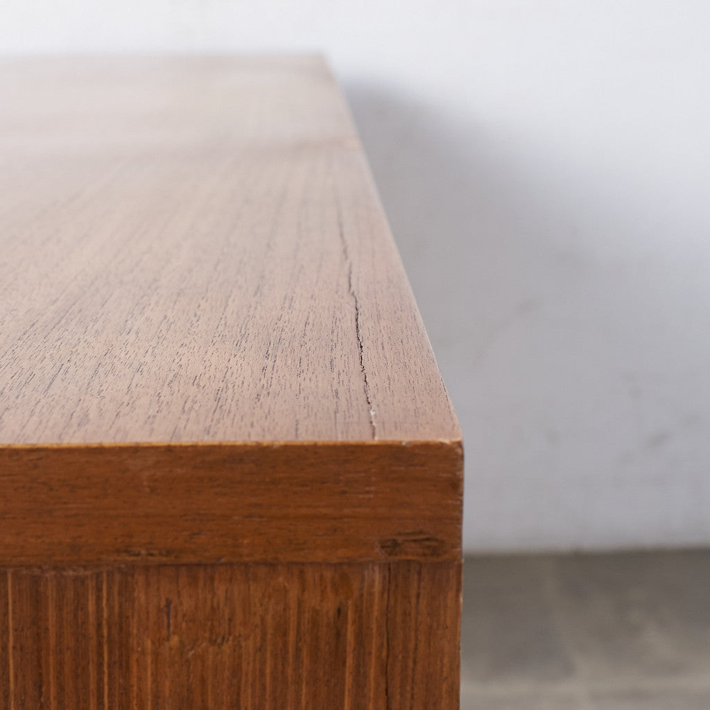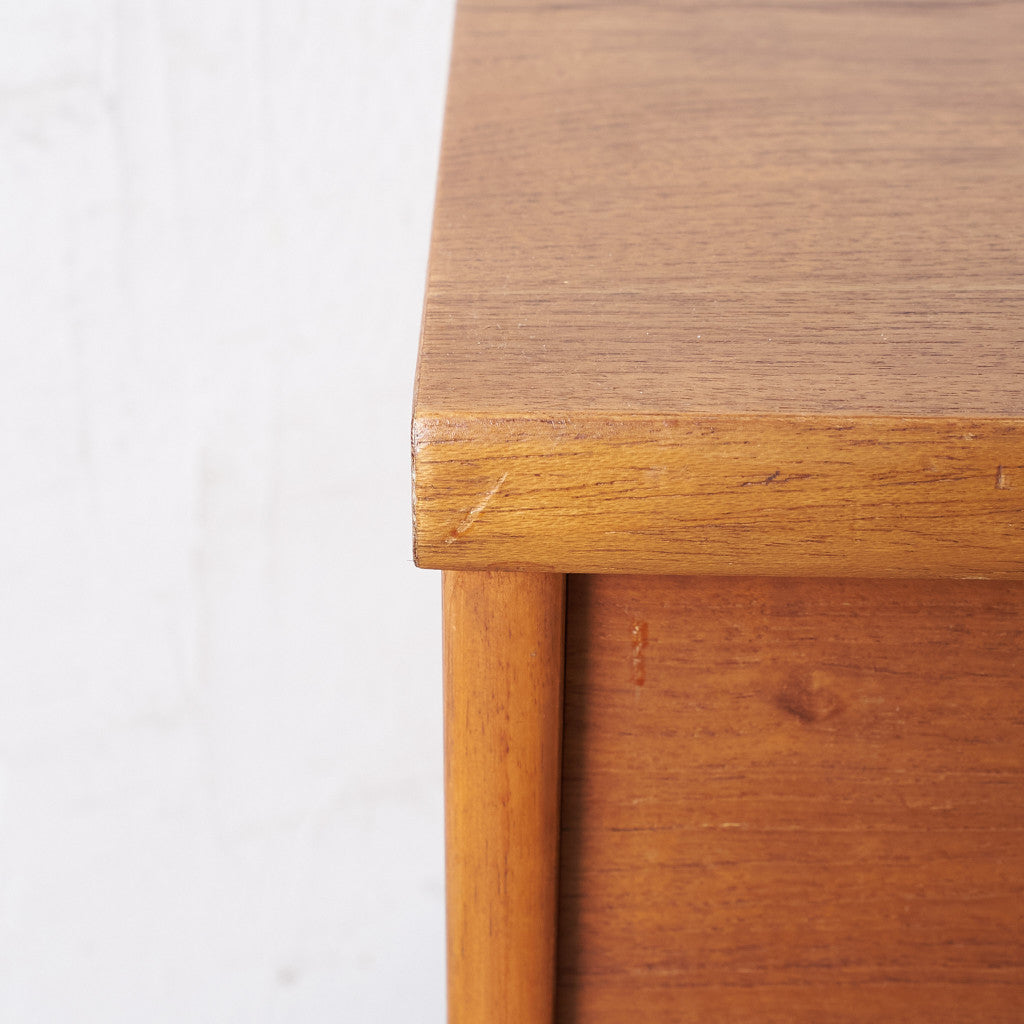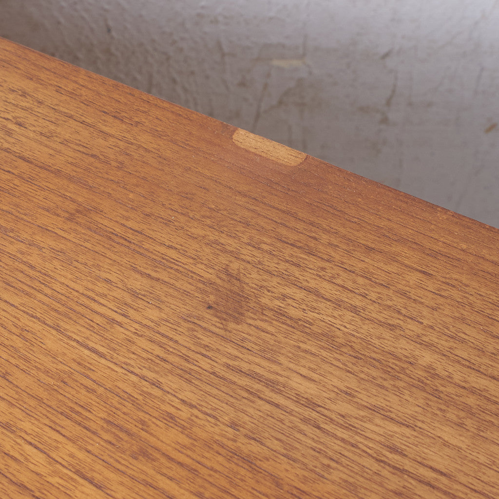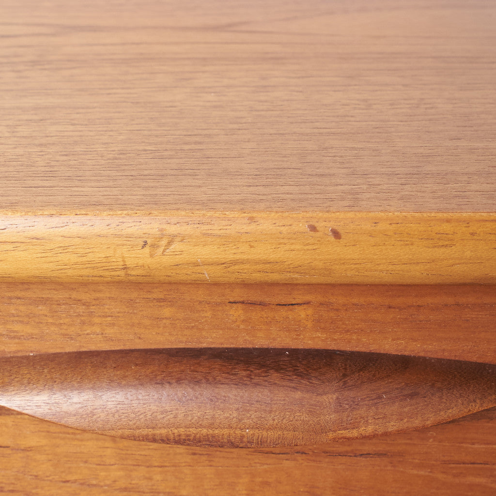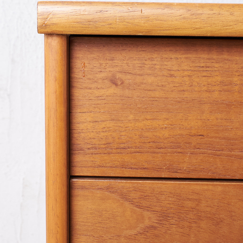今では希少な高級材であるチーク材を使用した温かみのある褐色の木肌が印象的。研ぎ出された滑らかな取っ手など、実用的でありながらも作り手のこだわりを感じさせるヴィンテージファニチャーです。