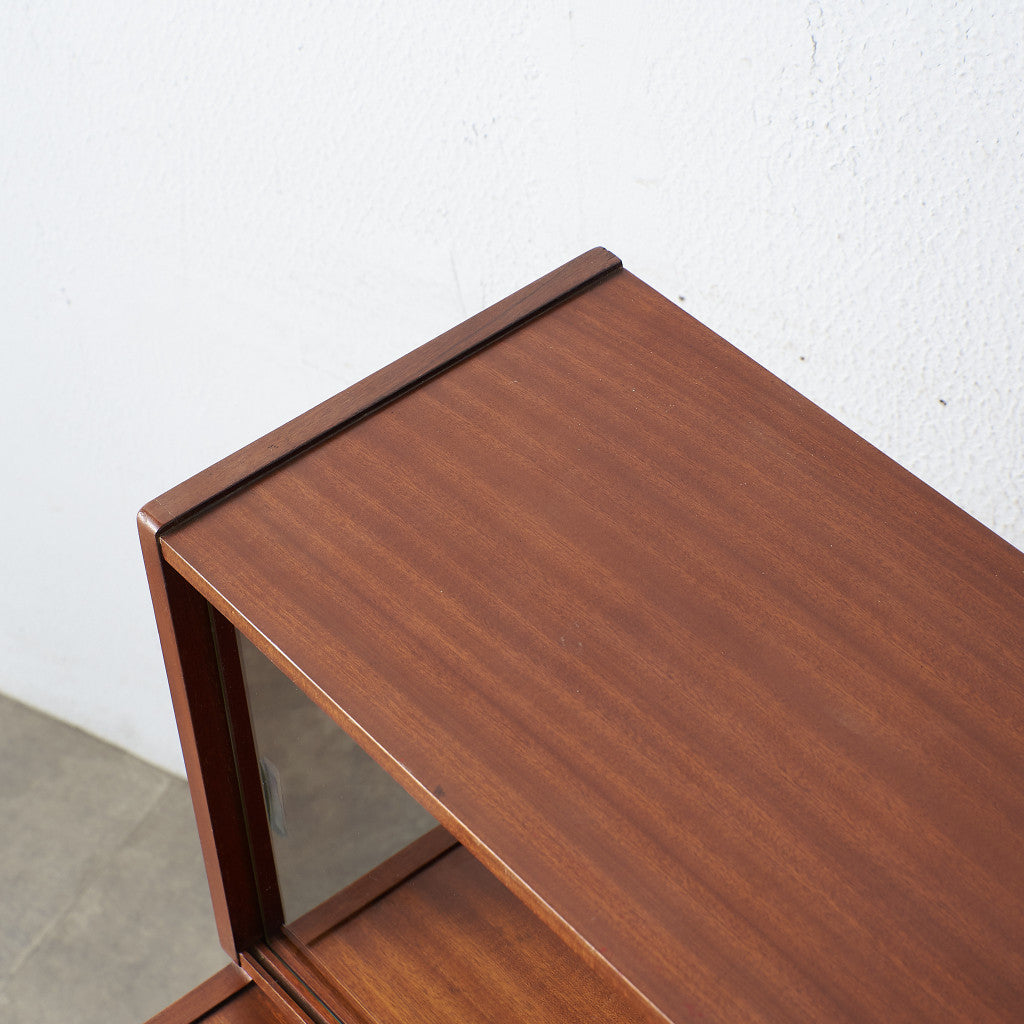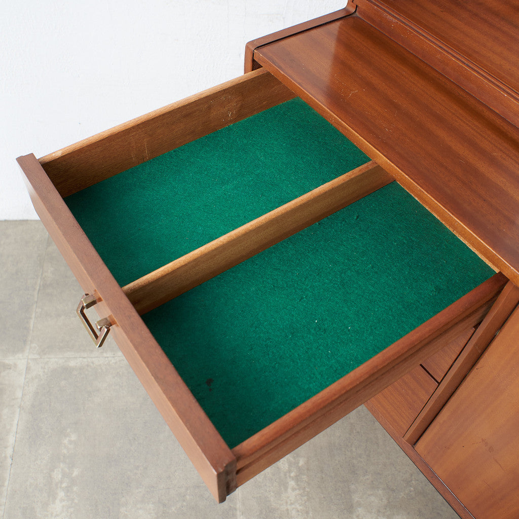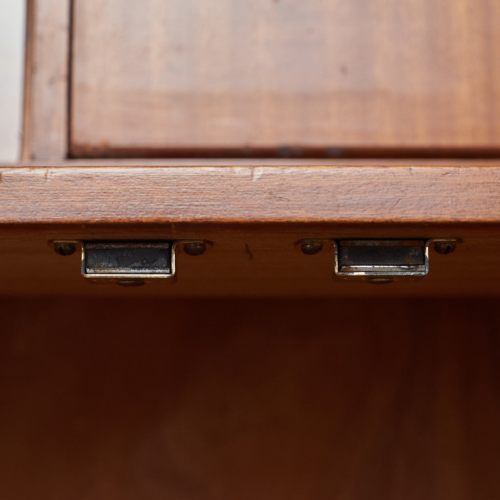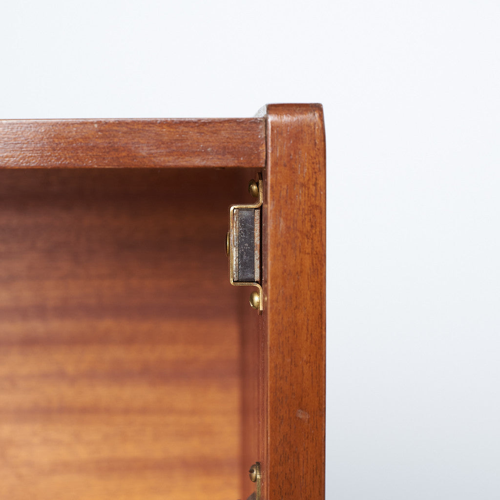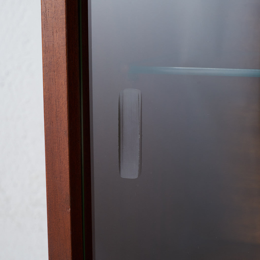 濃淡ある美しい木目が印象的。ヴィンテージならではの味わい深い質感と端正なシルエット、削り出された木製取手のバランスが上品なアクセントを添えています。小ぶりなサイズ感ながら抜群の収納力です。食器棚としてはもちろん飾り棚としてもおすすめです。
