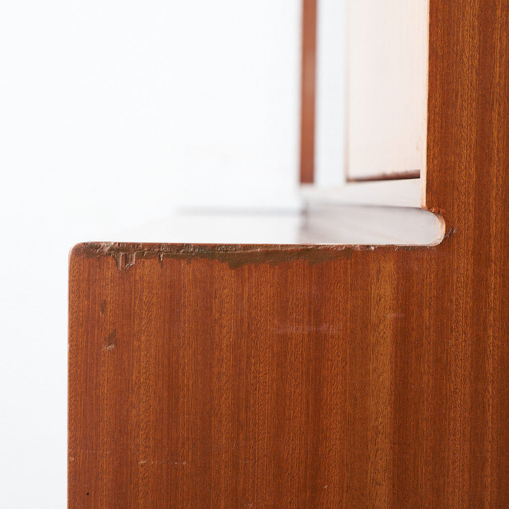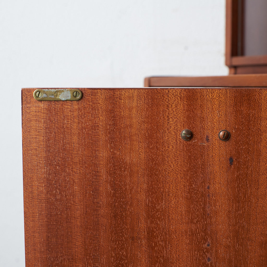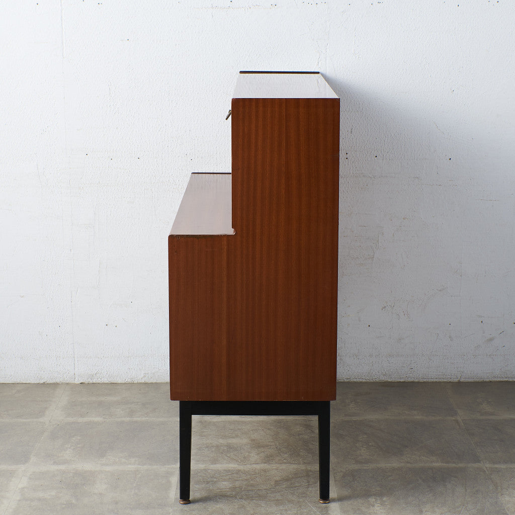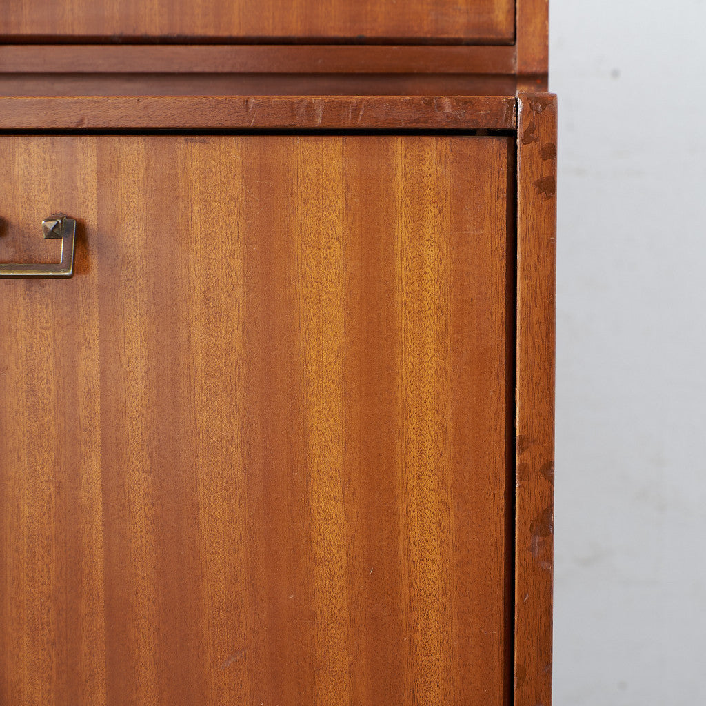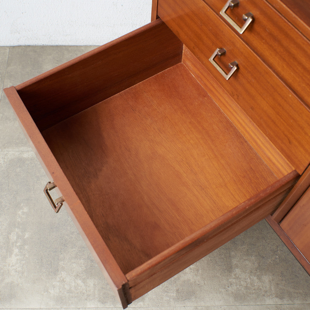 濃淡ある美しい木目が印象的。ヴィンテージならではの味わい深い質感と端正なシルエット、削り出された木製取手のバランスが上品なアクセントを添えています。小ぶりなサイズ感ながら抜群の収納力です。食器棚としてはもちろん飾り棚としてもおすすめです。