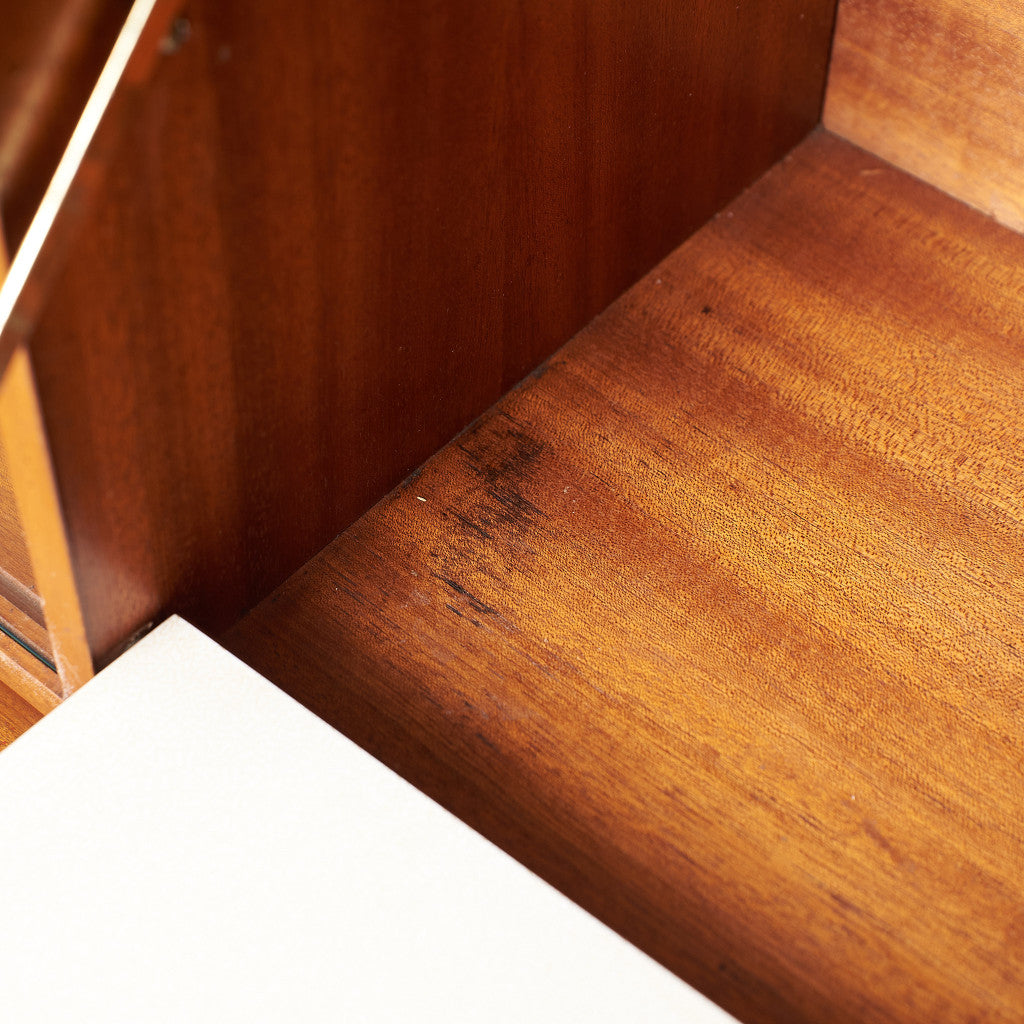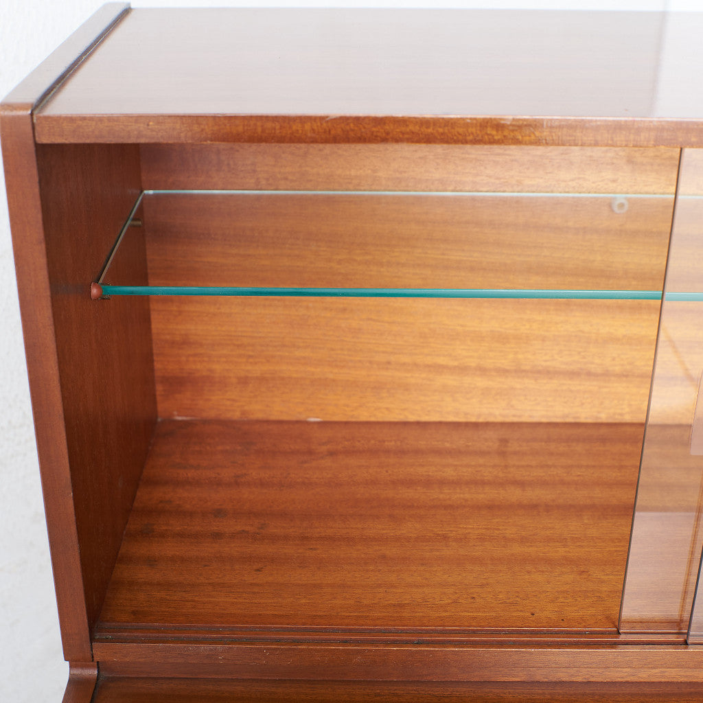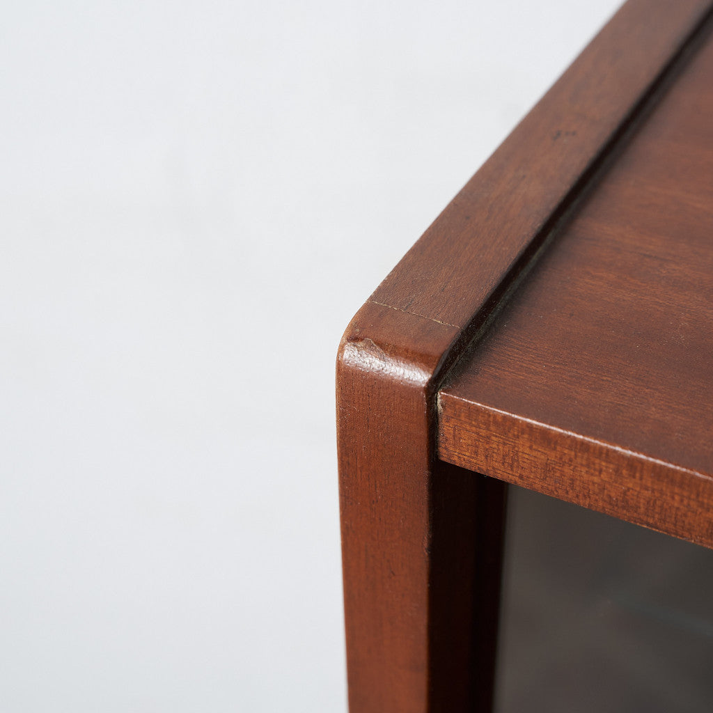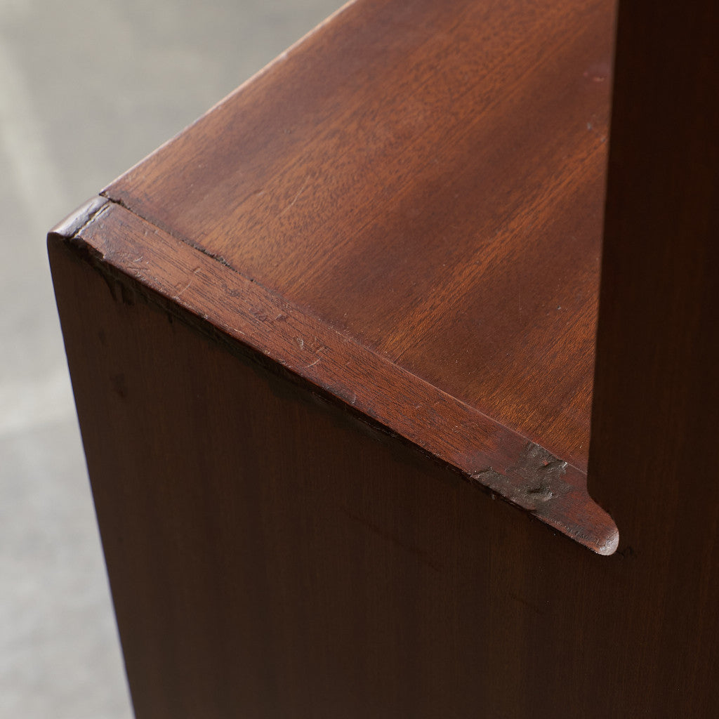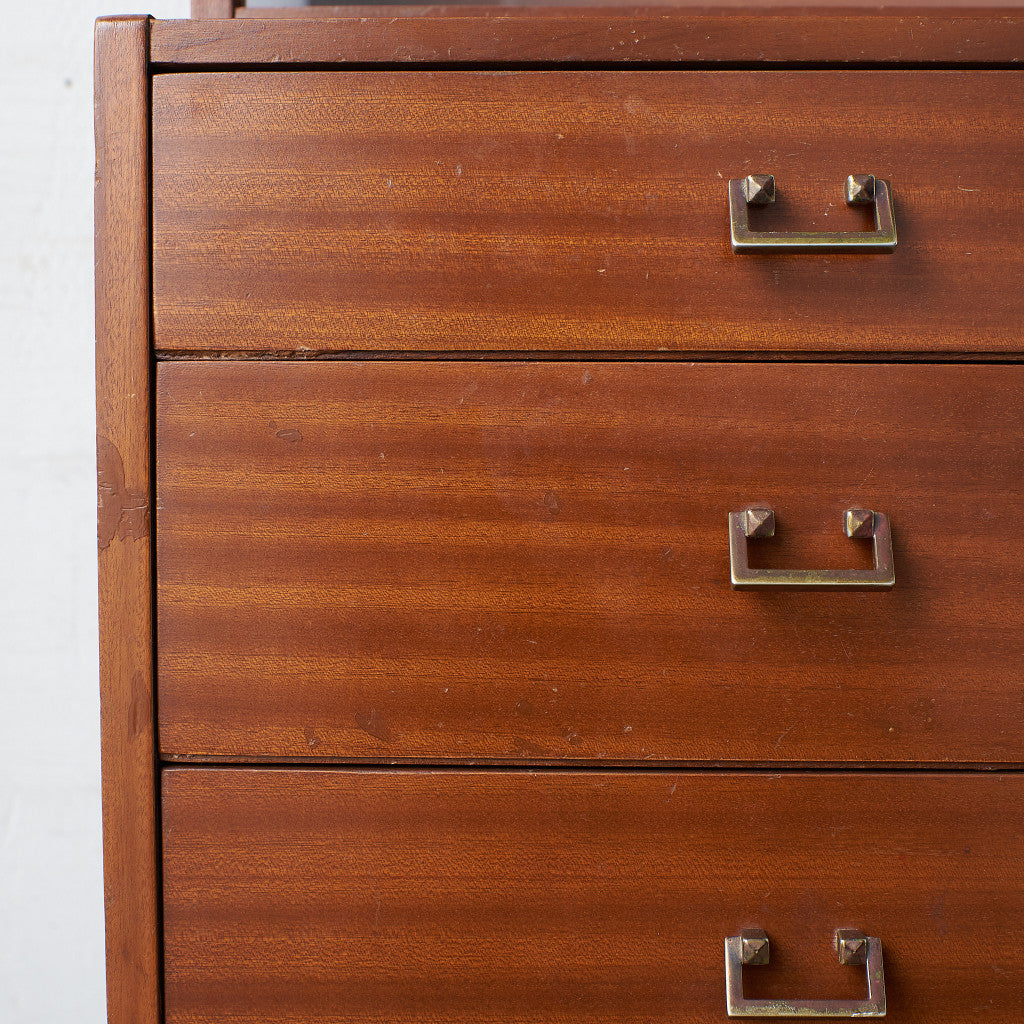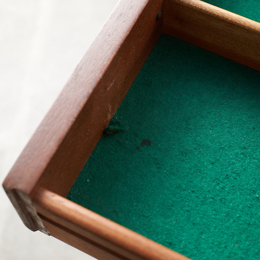 濃淡ある美しい木目が印象的。ヴィンテージならではの味わい深い質感と端正なシルエット、削り出された木製取手のバランスが上品なアクセントを添えています。小ぶりなサイズ感ながら抜群の収納力です。食器棚としてはもちろん飾り棚としてもおすすめです。