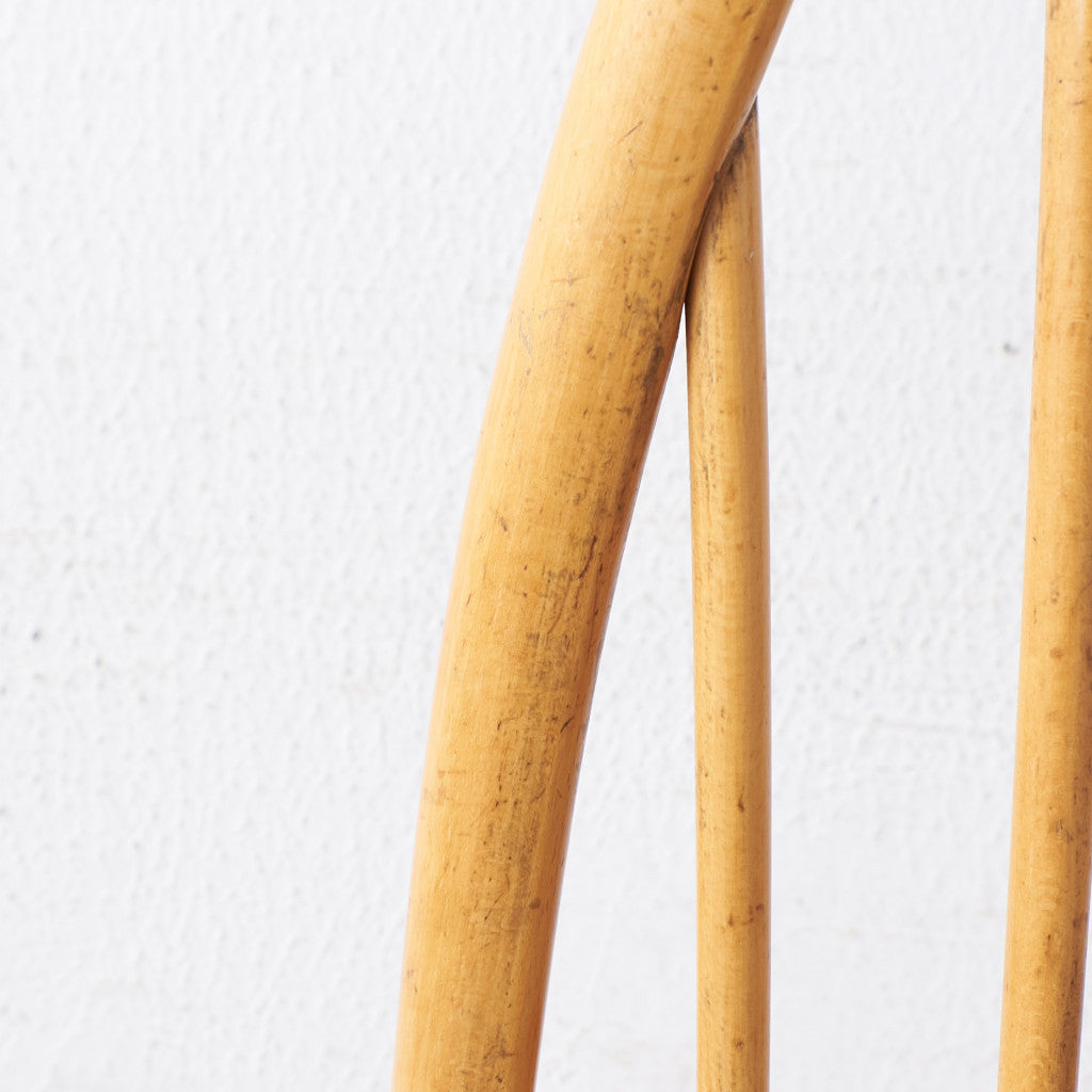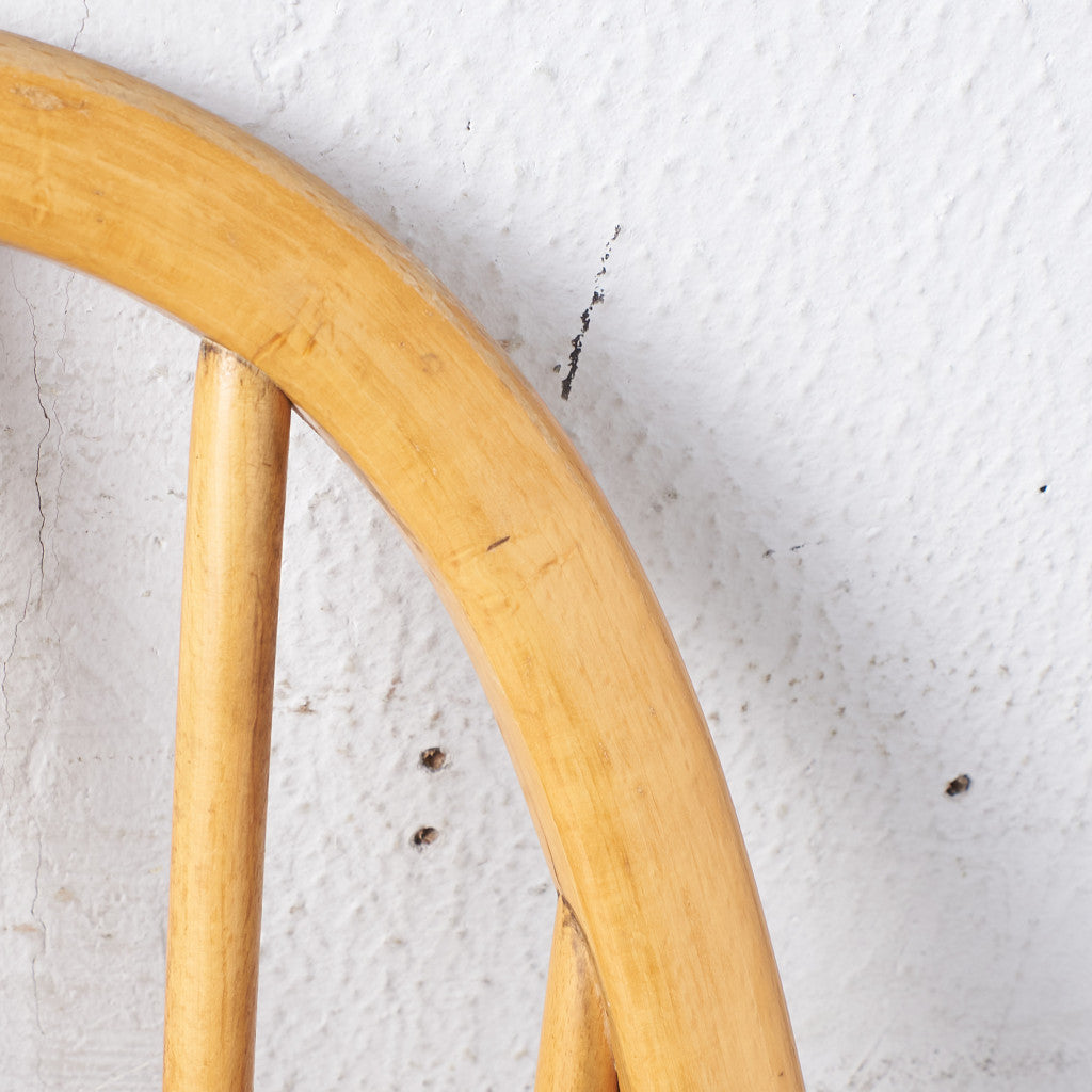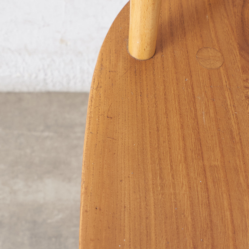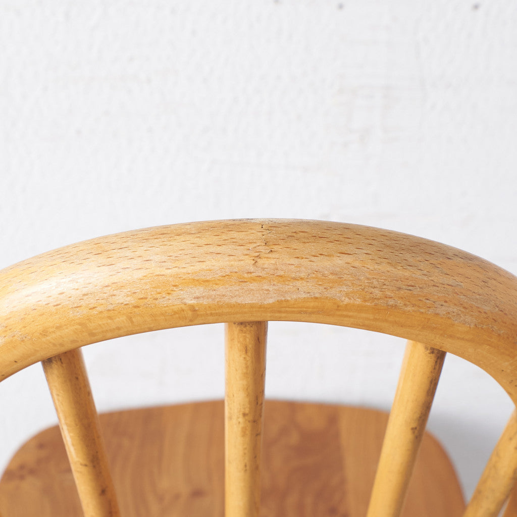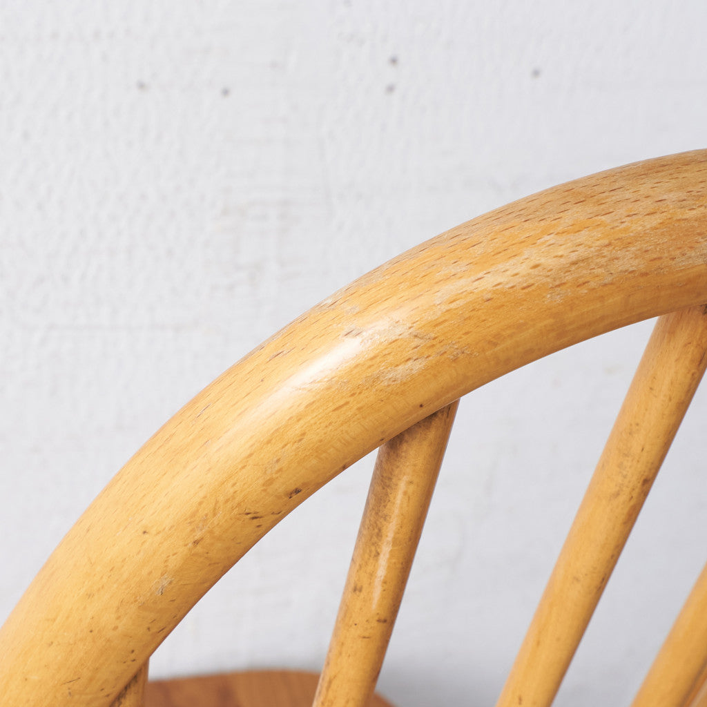伝統的なウィンザーボウバックチェアをリデザインしたシャープな背面のシルエットが印象的なクエーカーチェア。曲げ木加工による美しい一本の曲線が形作る独特のフォルム。背もたれが高く、ゆったりと寛げる座り心地のよい設計で、アーコールの中でもロングセラーのデザインです。復刻品とヴィンテージ品で背もたれのスポークや材質が異なり、ヴィンテージ品は“スポーク5本でエルム材xブナ材”、現行仕様の一つ前一時期のみ“背もたれ6本仕様エルム材xブナ材“のヴィンテージと現行の中庸に当たるモデルが製造されていました。