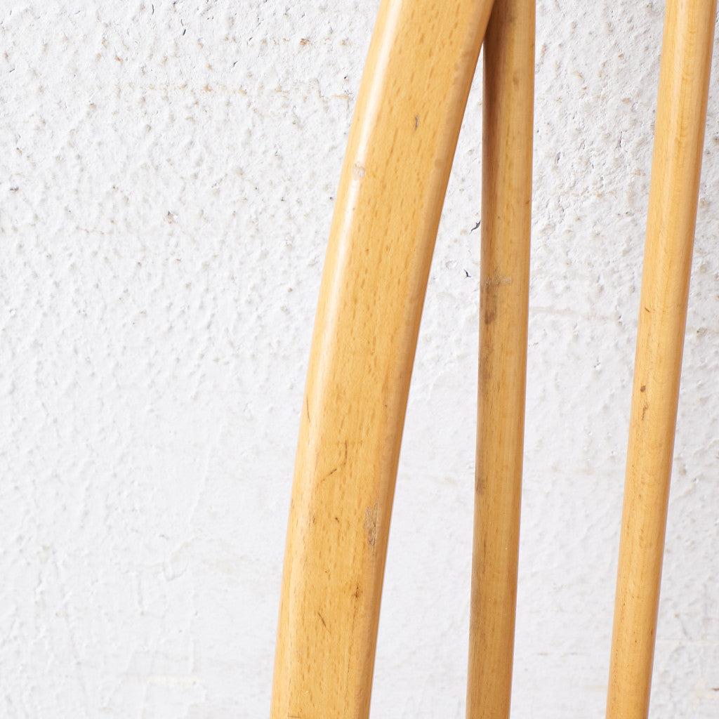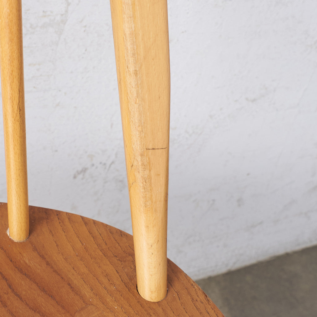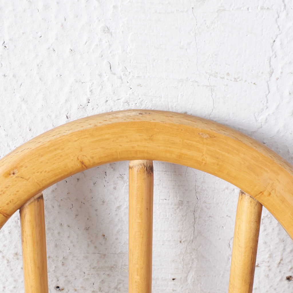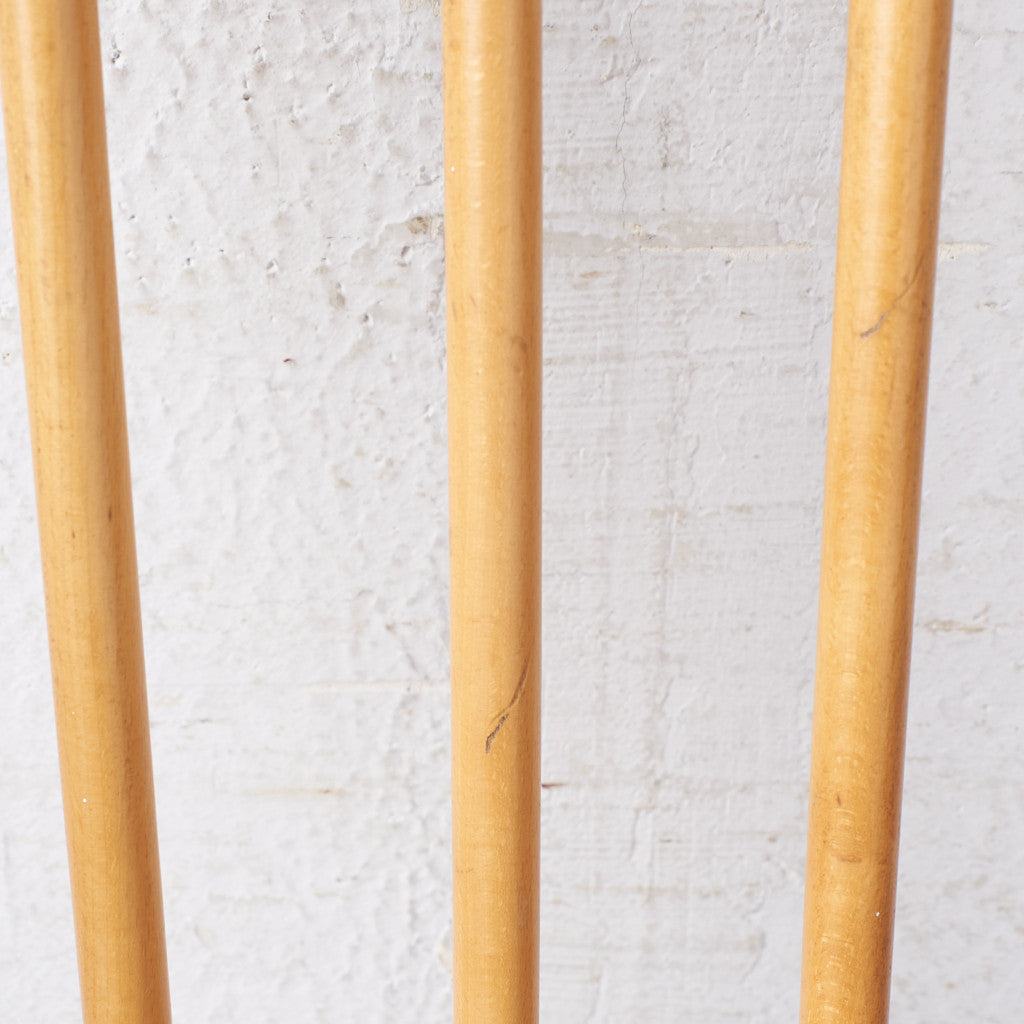 伝統的なウィンザーボウバックチェアをリデザインしたシャープな背面のシルエットが印象的なクエーカーチェア。曲げ木加工による美しい一本の曲線が形作る独特のフォルム。背もたれが高く、ゆったりと寛げる座り心地のよい設計で、アーコールの中でもロングセラーのデザインです。復刻品とヴィンテージ品で背もたれのスポークや材質が異なり、ヴィンテージ品は“スポーク5本でエルム材xブナ材”、現行仕様の一つ前一時期のみ“背もたれ6本仕様エルム材xブナ材“のヴィンテージと現行の中庸に当たるモデルが製造されていました。