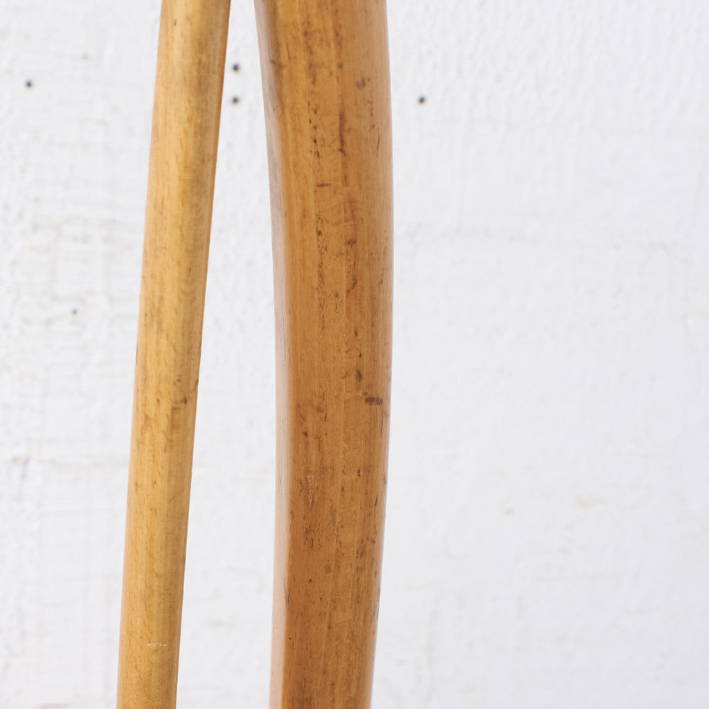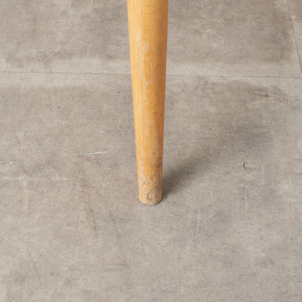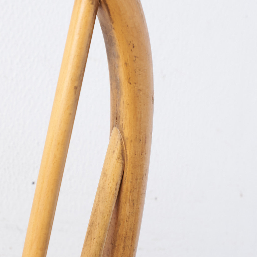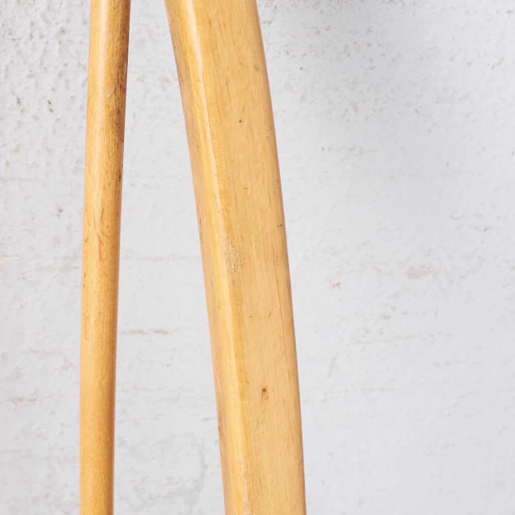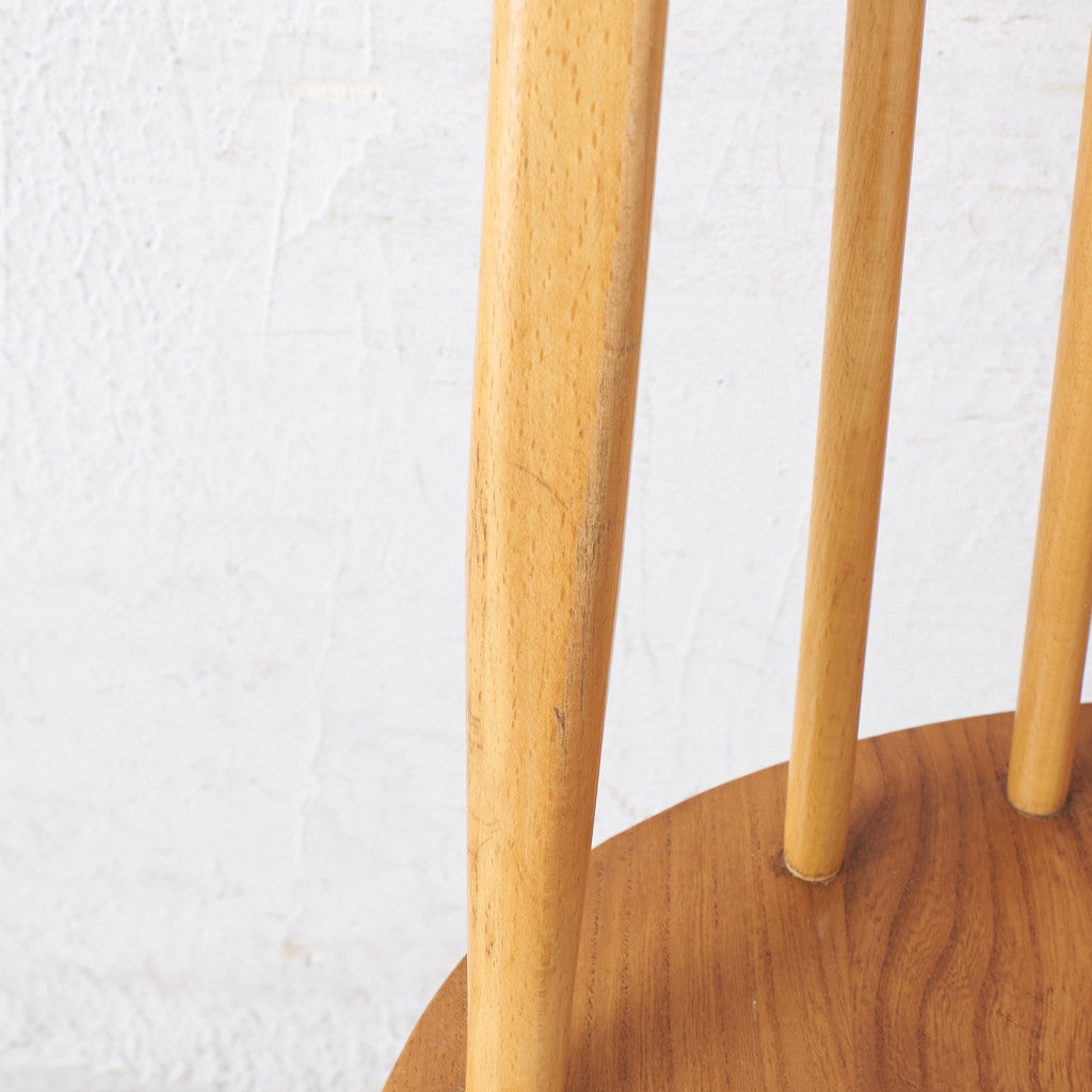 伝統的なウィンザーボウバックチェアをリデザインしたシャープな背面のシルエットが印象的なクエーカーチェア。曲げ木加工による美しい一本の曲線が形作る独特のフォルム。背もたれが高く、ゆったりと寛げる座り心地のよい設計で、アーコールの中でもロングセラーのデザインです。復刻品とヴィンテージ品で背もたれのスポークや材質が異なり、ヴィンテージ品は“スポーク5本でエルム材xブナ材”、現行仕様の一つ前一時期のみ“背もたれ6本仕様エルム材xブナ材“のヴィンテージと現行の中庸に当たるモデルが製造されていました。