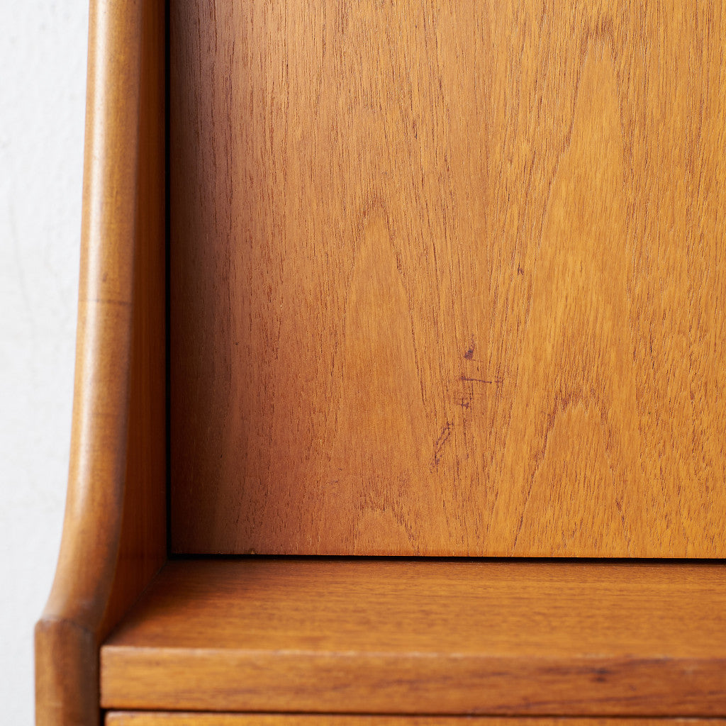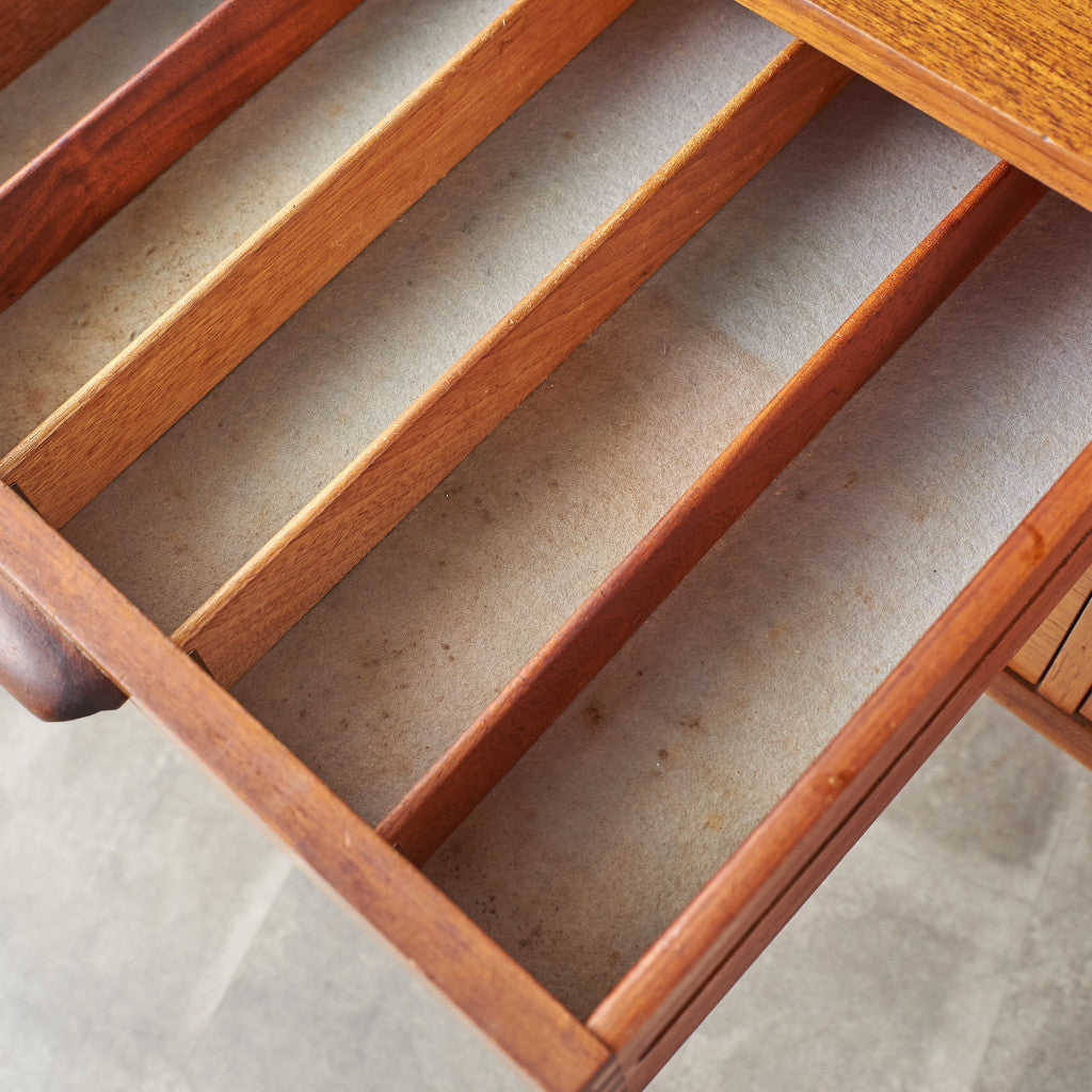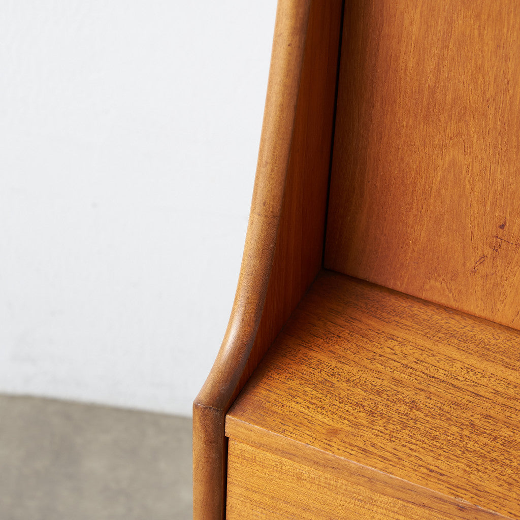 ブラジリアシリーズの中でも人気の高いハイサイドボード。一般的なサイドボードより背の高いハイタイプで、大容量の収納を備えています。開閉式のデスクスペース(ビューロ)、オープンな収納スペースがあるのでディスプレイも楽しむことができ、食器棚、リビングの補助収納、書斎の本棚兼デスクなど、様々な用途に合わせお使いいただけます。艶のある無垢材で作られた巻貝のような削り出し取っ手、脚と脚をつなぐ緩やかなカーブが美しい貫のデザイン、スラリと伸びたテーパードの脚など、シンプルなデザインながら機能性と個性が光る名品です。