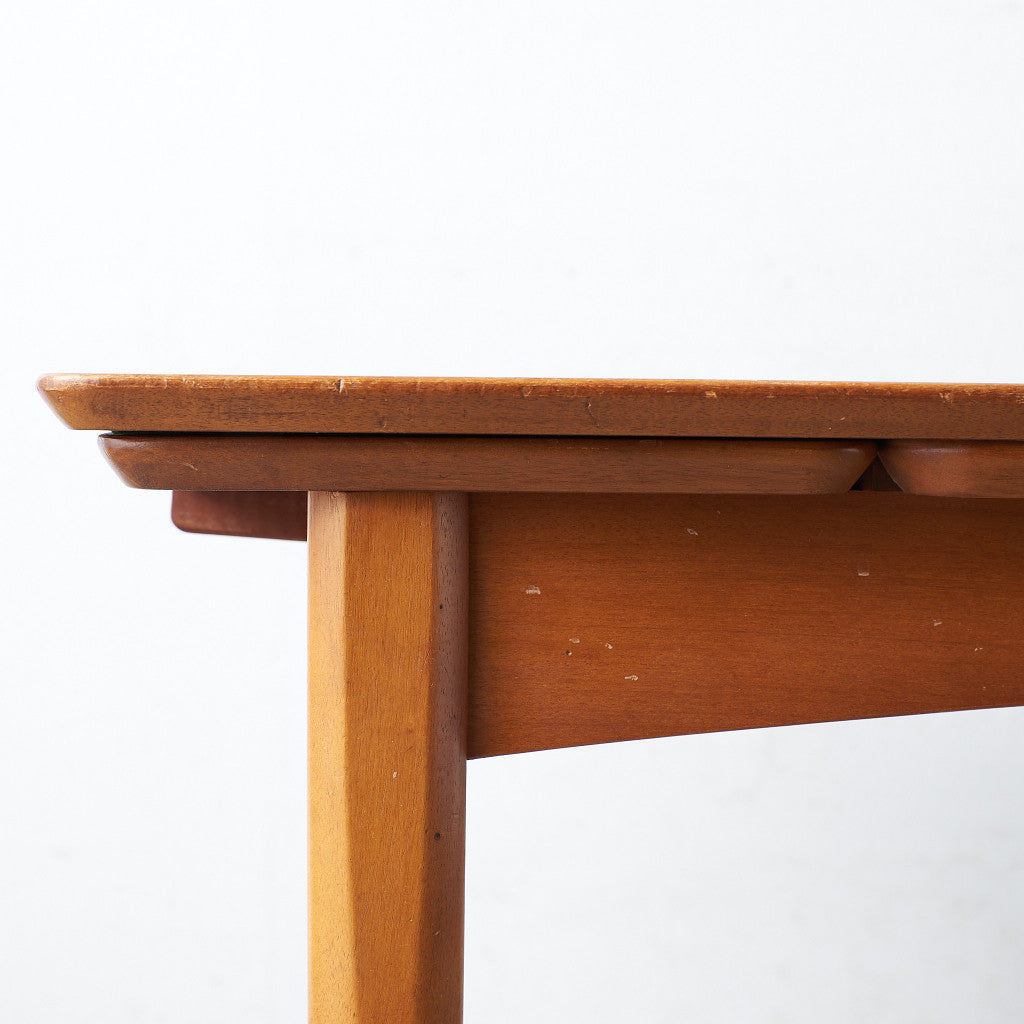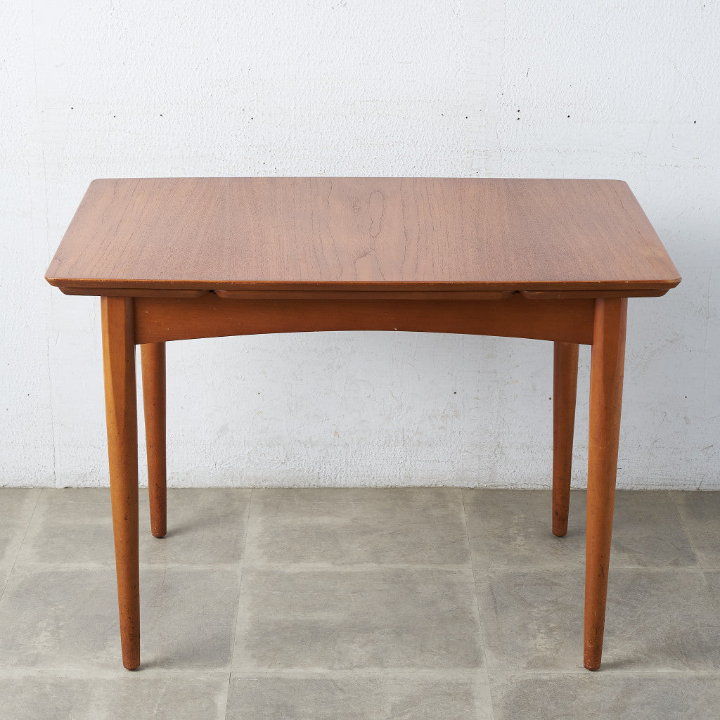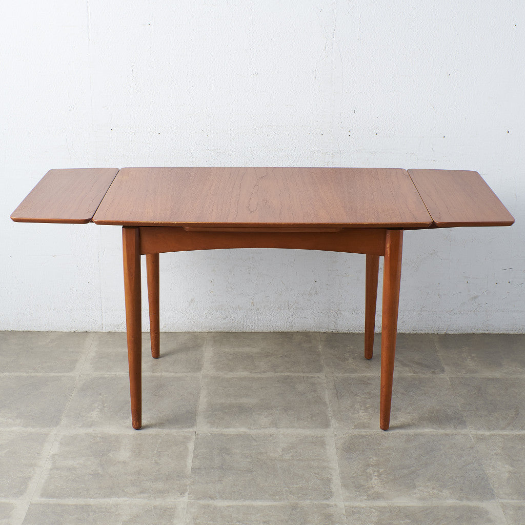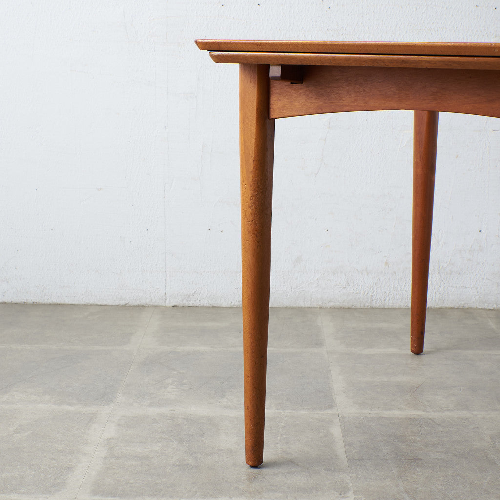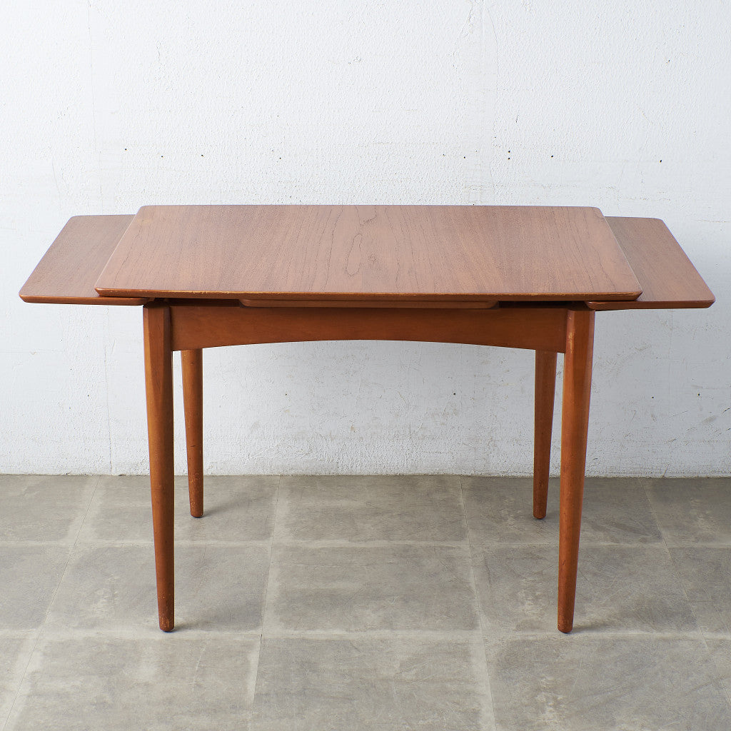 天板下に収納された副天板を両サイドからスライドさせることでテーブルの上はそのままに簡単にサイズの拡張が可能なドローリーフテーブルです。片側天板だけを引き出して使うなど、必要に応じて便利にお使いいただけます。普段は2人〜4人用、来客時などは天板をさっと広げて6人用としてもお使いいただけます。実用的でありながらも作り手のこだわりを感じさせる北欧の年代物とも相性の良いヴィンテージファニチャーです。