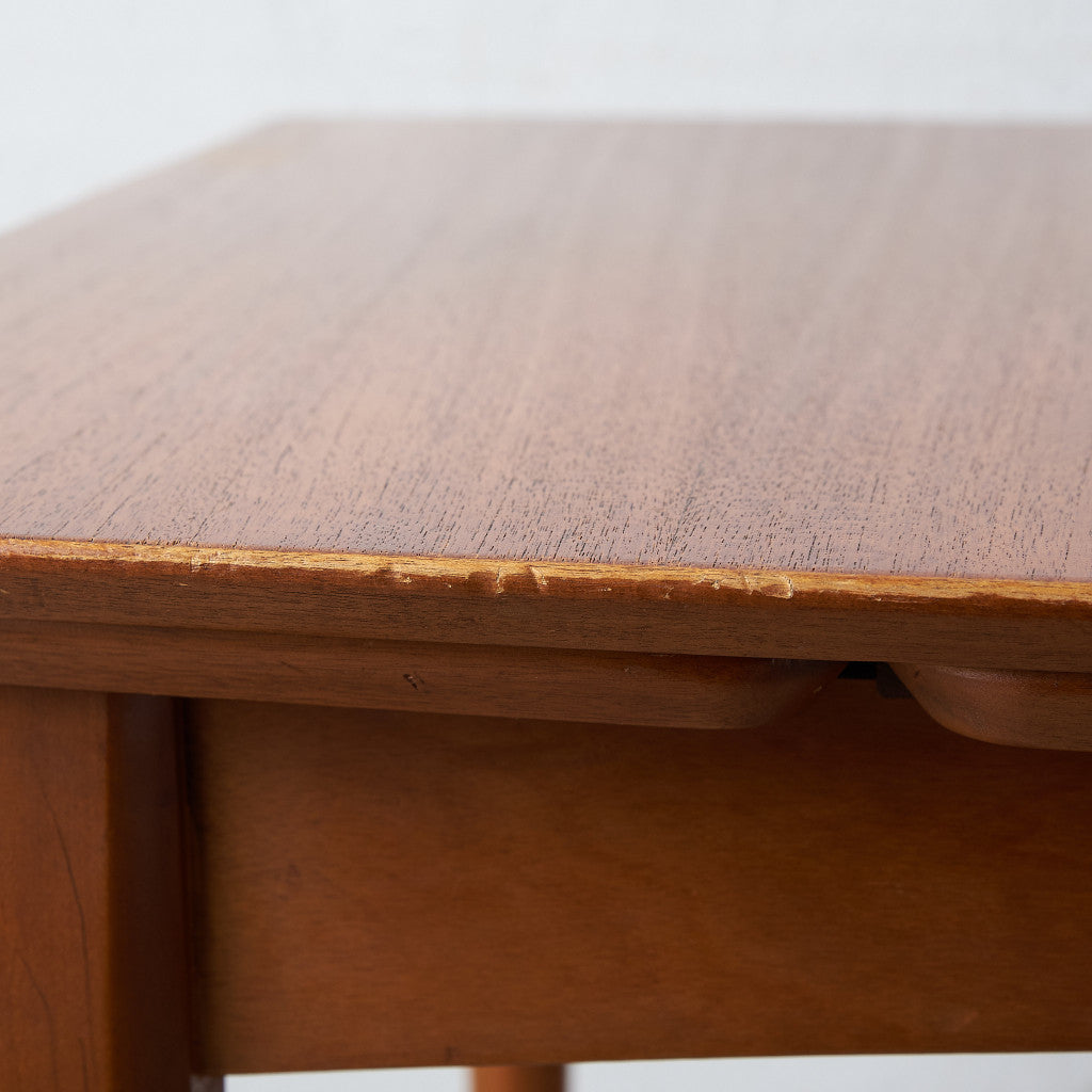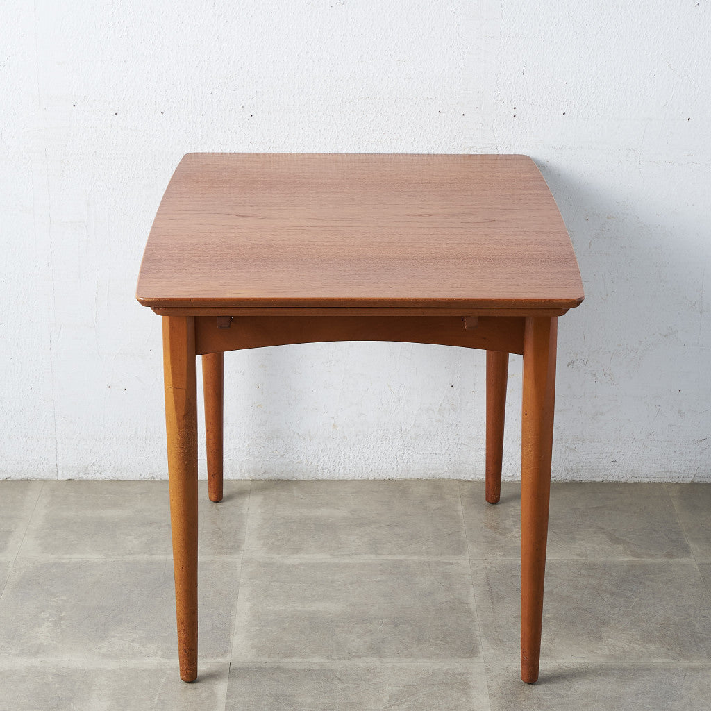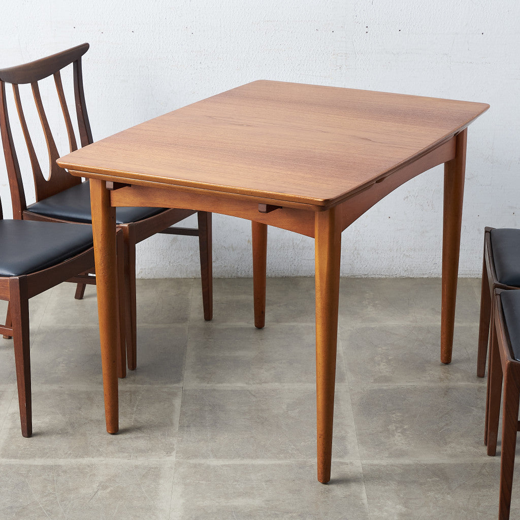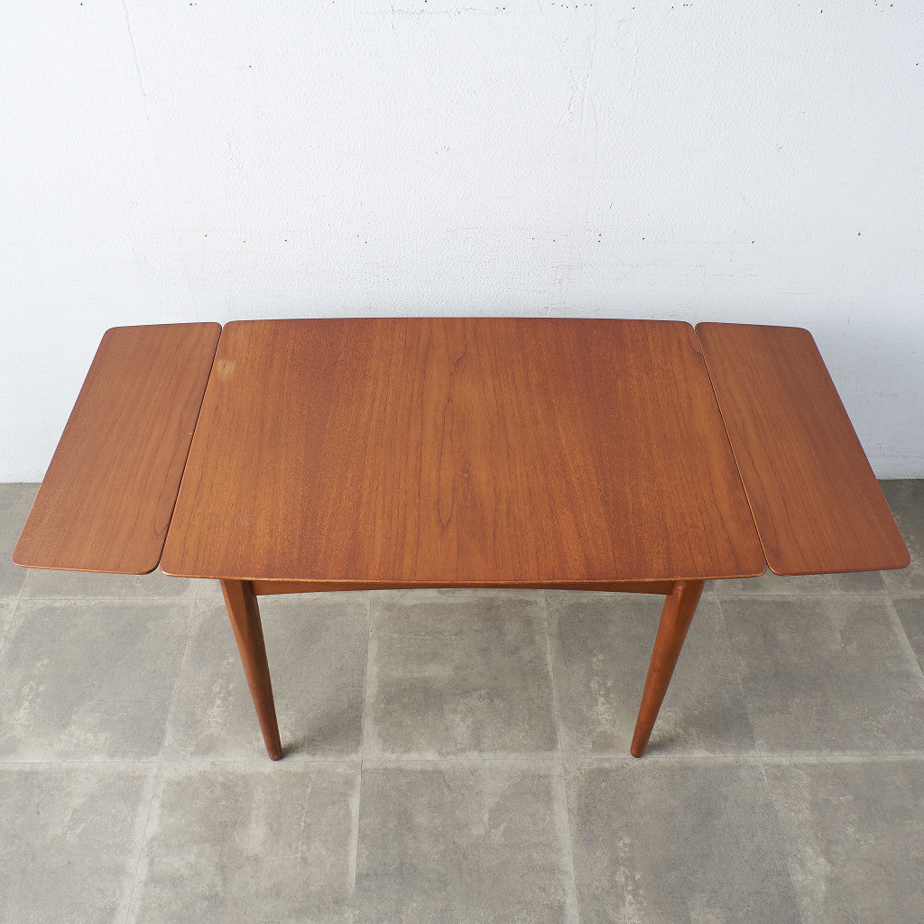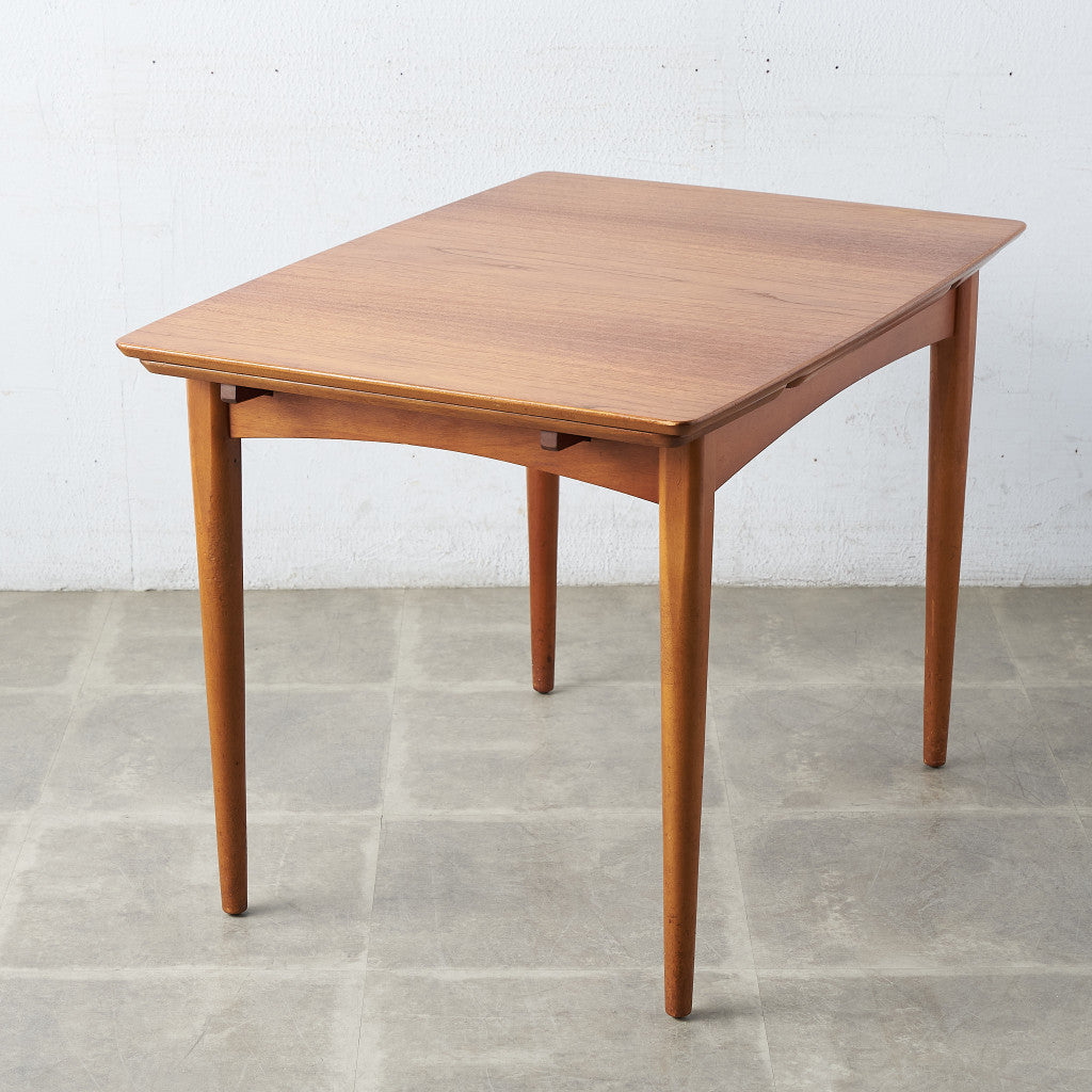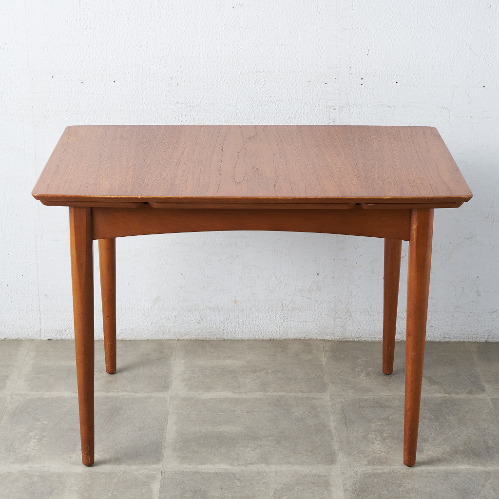 天板下に収納された副天板を両サイドからスライドさせることでテーブルの上はそのままに簡単にサイズの拡張が可能なドローリーフテーブルです。片側天板だけを引き出して使うなど、必要に応じて便利にお使いいただけます。普段は2人〜4人用、来客時などは天板をさっと広げて6人用としてもお使いいただけます。実用的でありながらも作り手のこだわりを感じさせる北欧の年代物とも相性の良いヴィンテージファニチャーです。