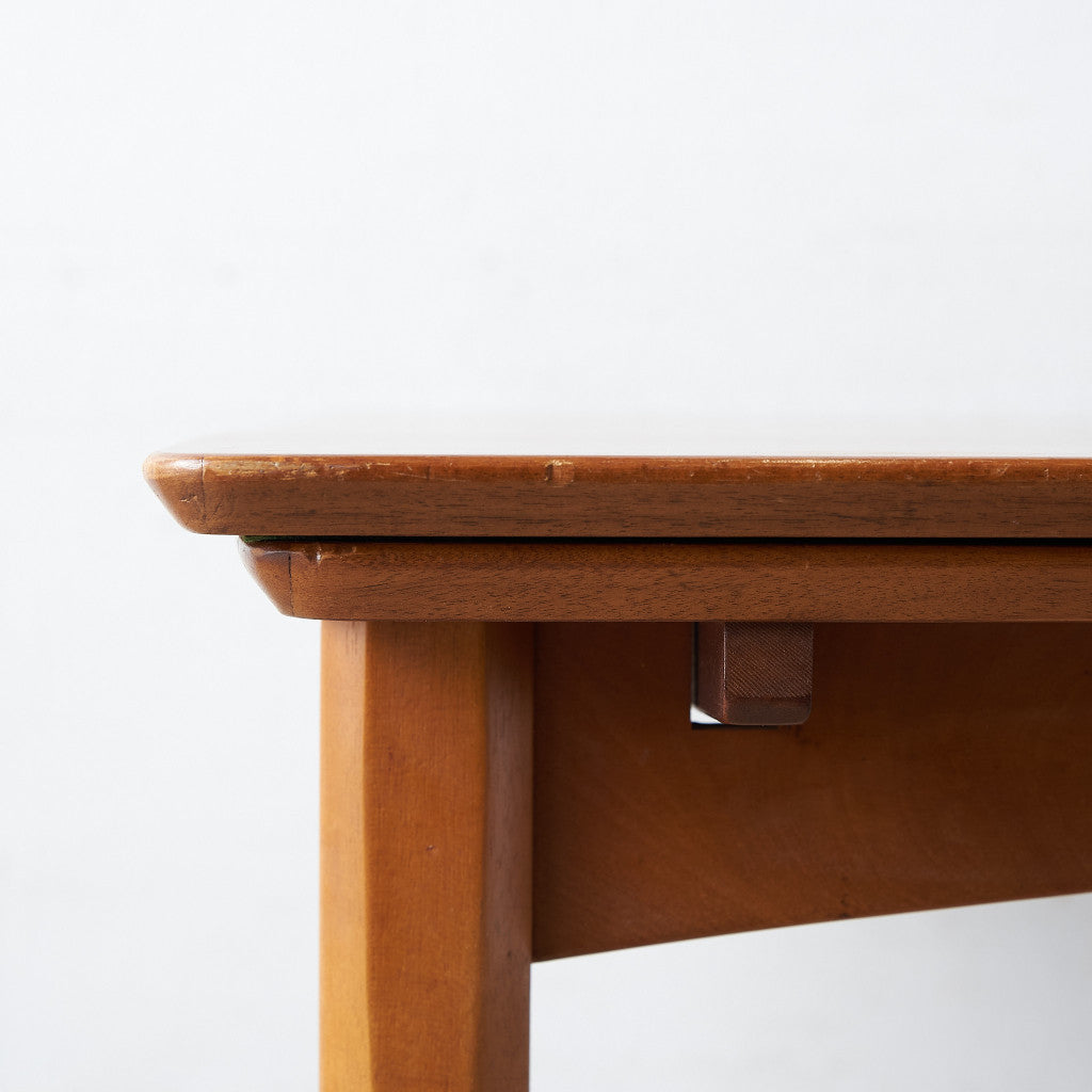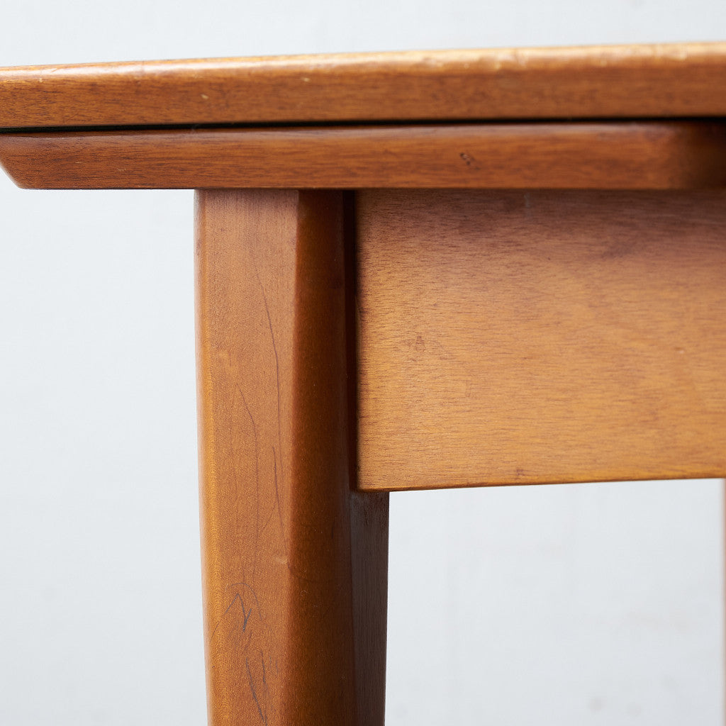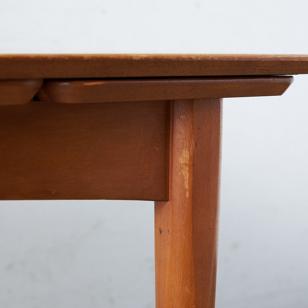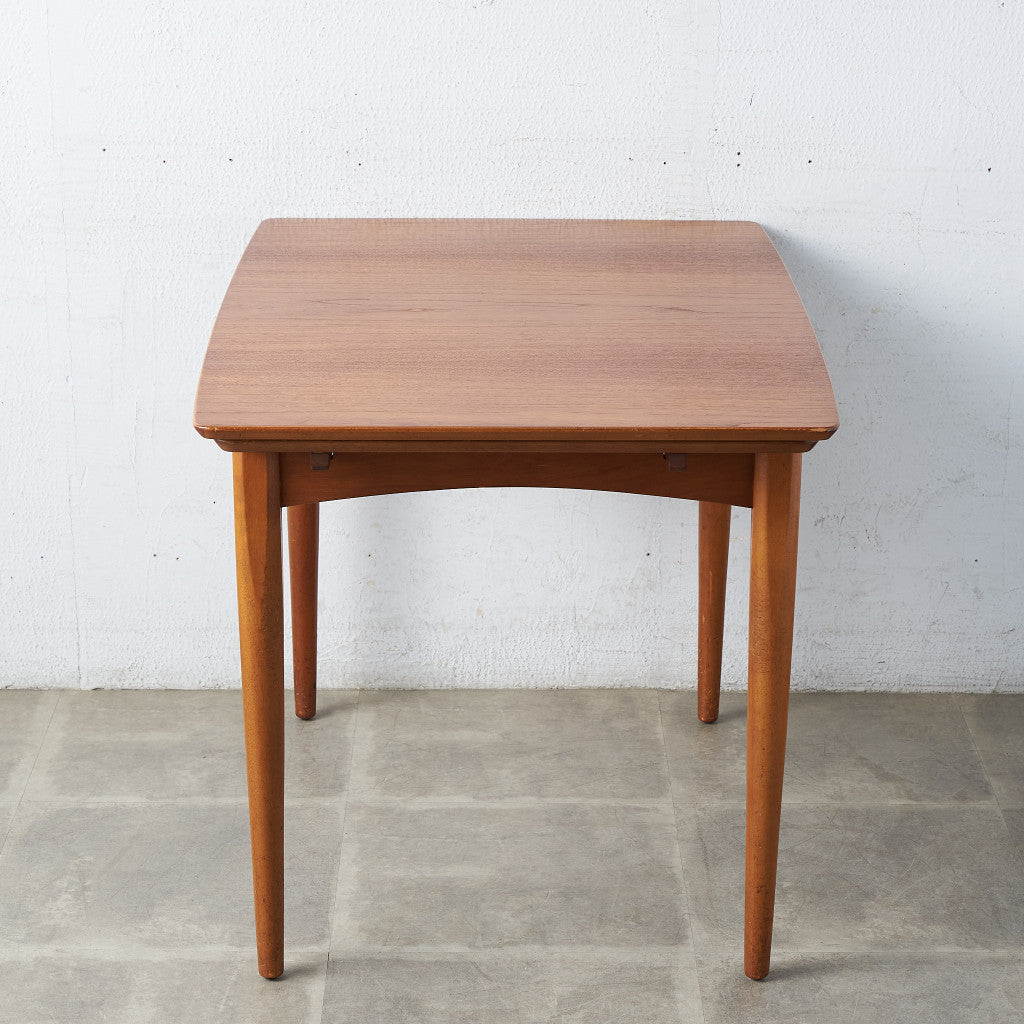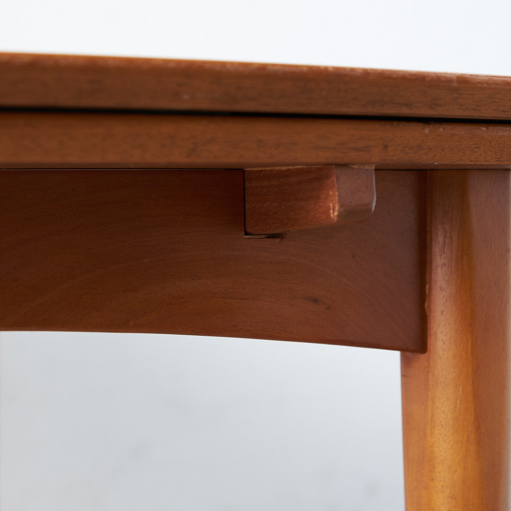 天板下に収納された副天板を両サイドからスライドさせることでテーブルの上はそのままに簡単にサイズの拡張が可能なドローリーフテーブルです。片側天板だけを引き出して使うなど、必要に応じて便利にお使いいただけます。普段は2人〜4人用、来客時などは天板をさっと広げて6人用としてもお使いいただけます。実用的でありながらも作り手のこだわりを感じさせる北欧の年代物とも相性の良いヴィンテージファニチャーです。