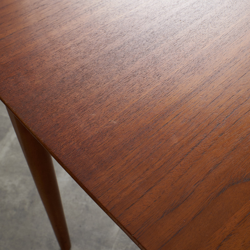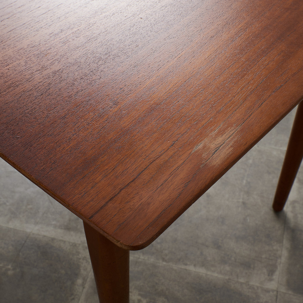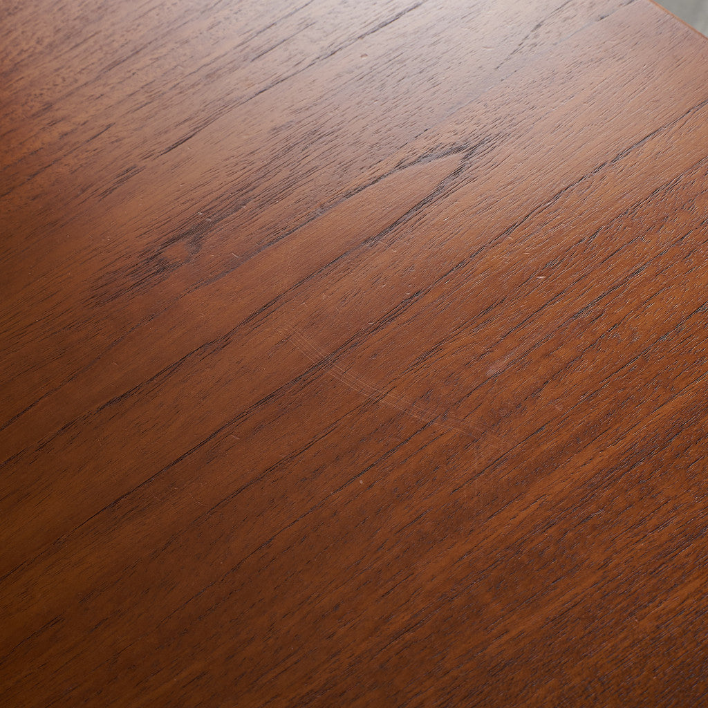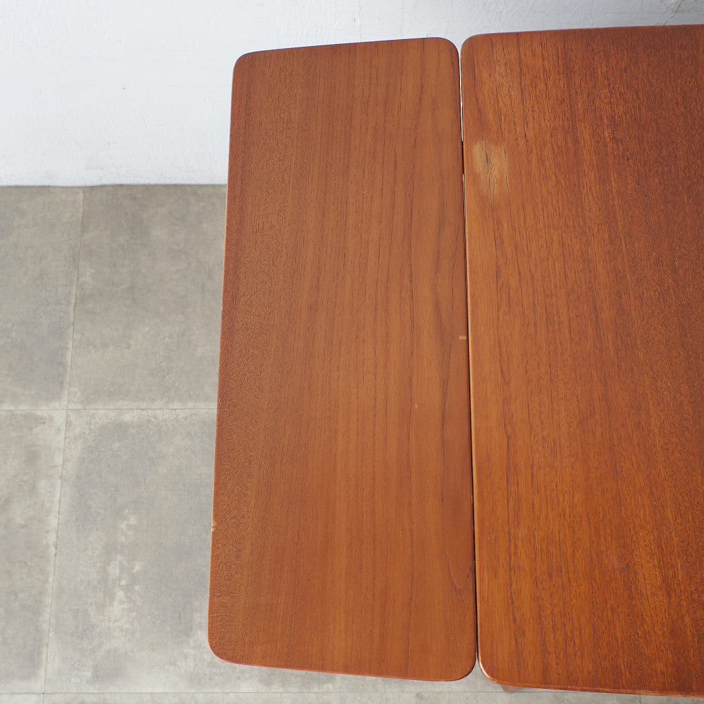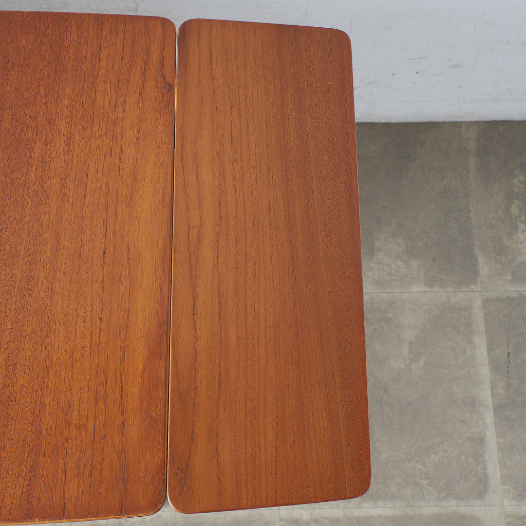 天板下に収納された副天板を両サイドからスライドさせることでテーブルの上はそのままに簡単にサイズの拡張が可能なドローリーフテーブルです。片側天板だけを引き出して使うなど、必要に応じて便利にお使いいただけます。普段は2人〜4人用、来客時などは天板をさっと広げて6人用としてもお使いいただけます。実用的でありながらも作り手のこだわりを感じさせる北欧の年代物とも相性の良いヴィンテージファニチャーです。