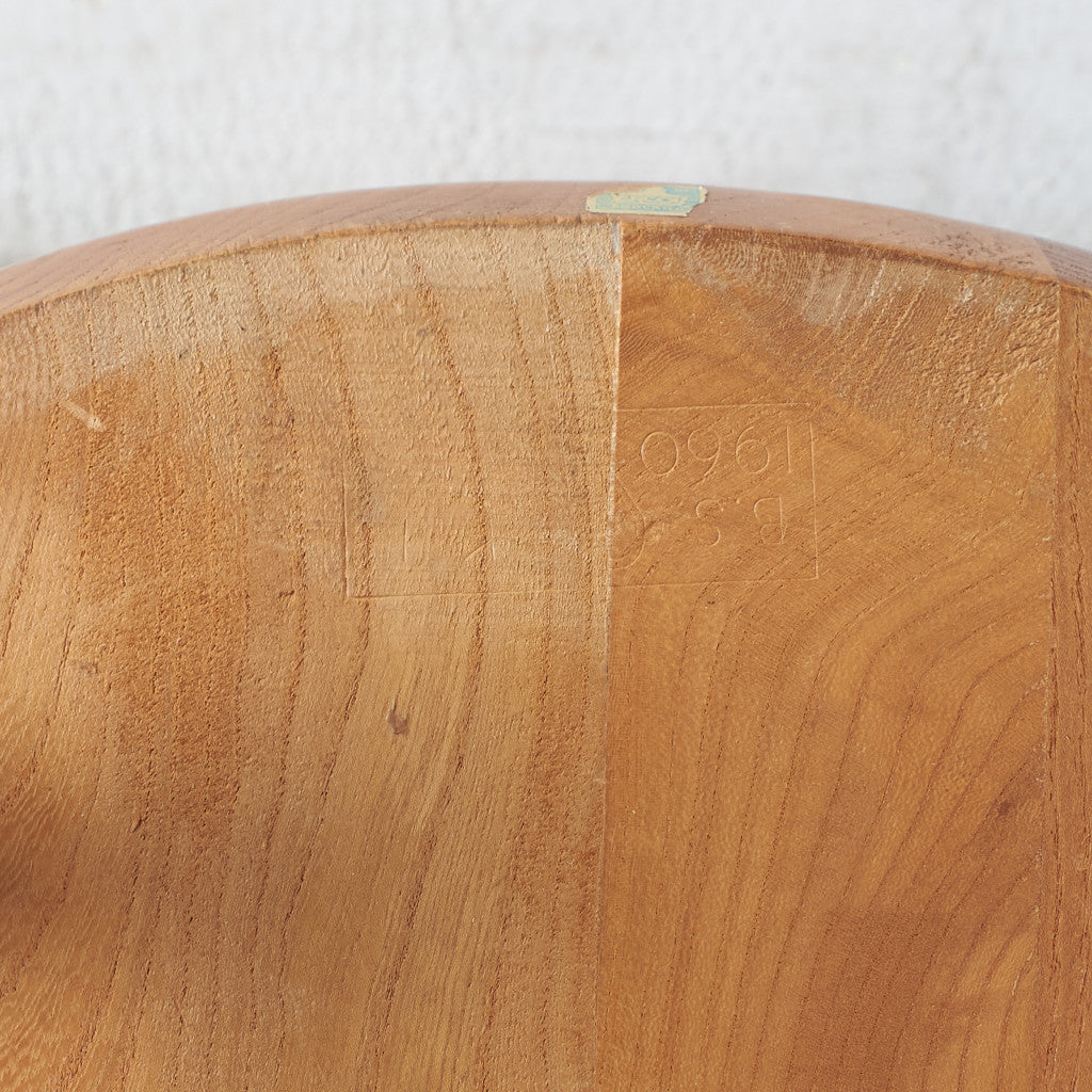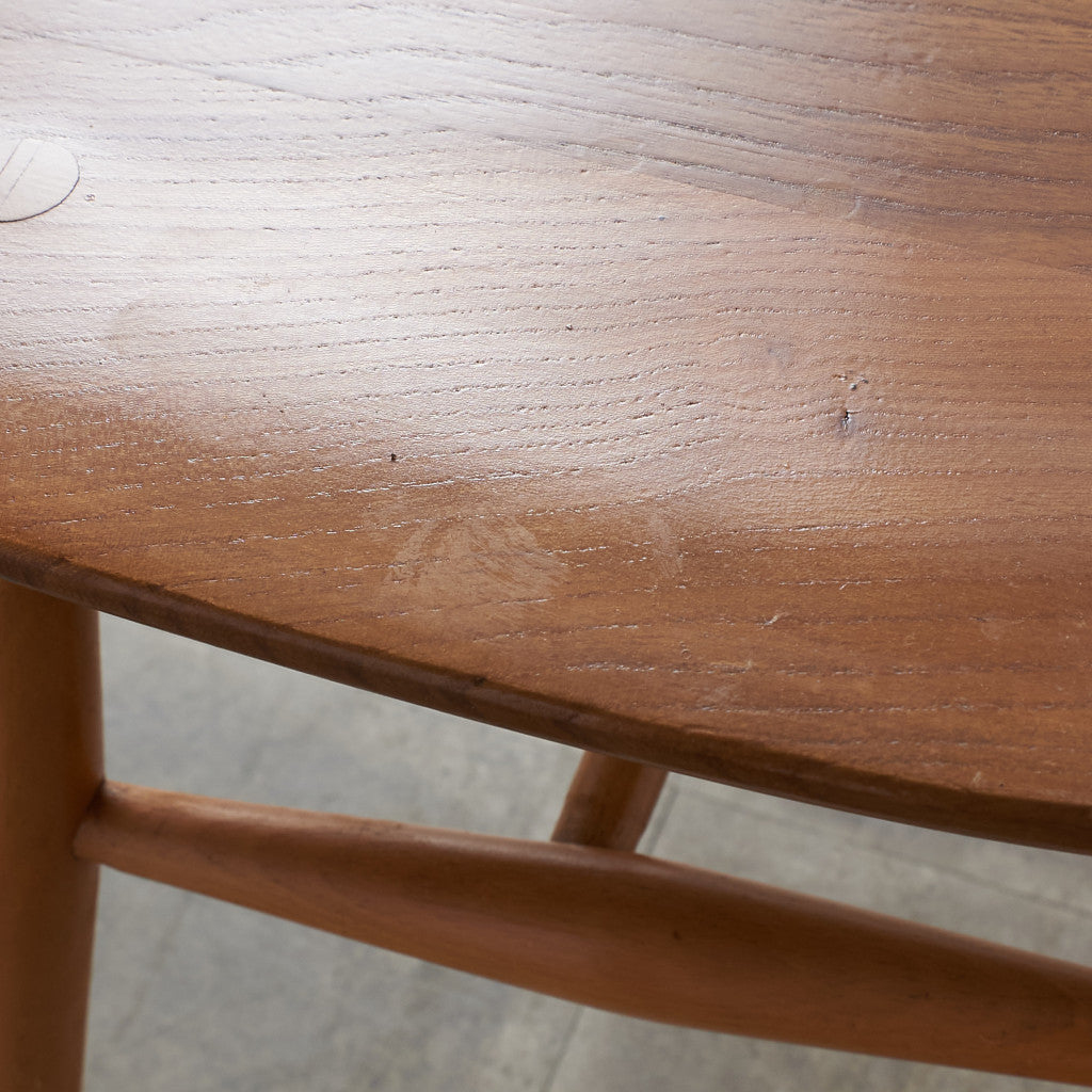 アーコール社は現存するイギリスの老舗家具メーカー。新品家具としてもアンティーク品としても同一のモデルで同様に高い支持を受け続けている稀有なブランドです。20世紀初頭にイギリスに移住してきたイタリア生まれの家具デザイナー "ルシアン・アーコラーニ"によって、1920年にハイ・ワイコムにアーコールファニチャーは設立されました。ERCOL社の成功のポイントとして当時乾燥が難しく歪みが生じるため家具材としては不適格として安価であったエルム材の乾燥方法を編み出したことがあります。ウィンザーチェアーに代表される伝統的な製法と、モダンデザインを融合させたコレクションは、さりげないデザインで軽やかでシンプル。1957年デザインのスタッキングチャイルドチェアーは、小学校などの施設で多く使用され一躍ベストセラーブランドとなりました。近年マーガレット・ハウエル(英国の服飾デザイナー)は、アーコール社スタッキングチャイルドチェアーのヴィンテージ品をロンドンショップで展示し、アーコールチェアーは大好評を得ることになりました。それをきっかけにアーコール社は2002年から同商品の復刻版の製造を開始するまでになります。 その後マーガレット・ハウエルのショップでもこの復刻版は販売されることとなり、たちまち人気が高まりました。イエロー×ゴールドの通称ゴールドラベルがついた1960年代〜70年代頃アーコール全盛期の品物は以前よりプレミアム的に価値で取引されておりましたが、近年ではそれ以前のヴィンテージ品ブルーラベルのお品物も含めてイギリス現地で一昔前の倍近くの取引相場にまで高騰しています。
