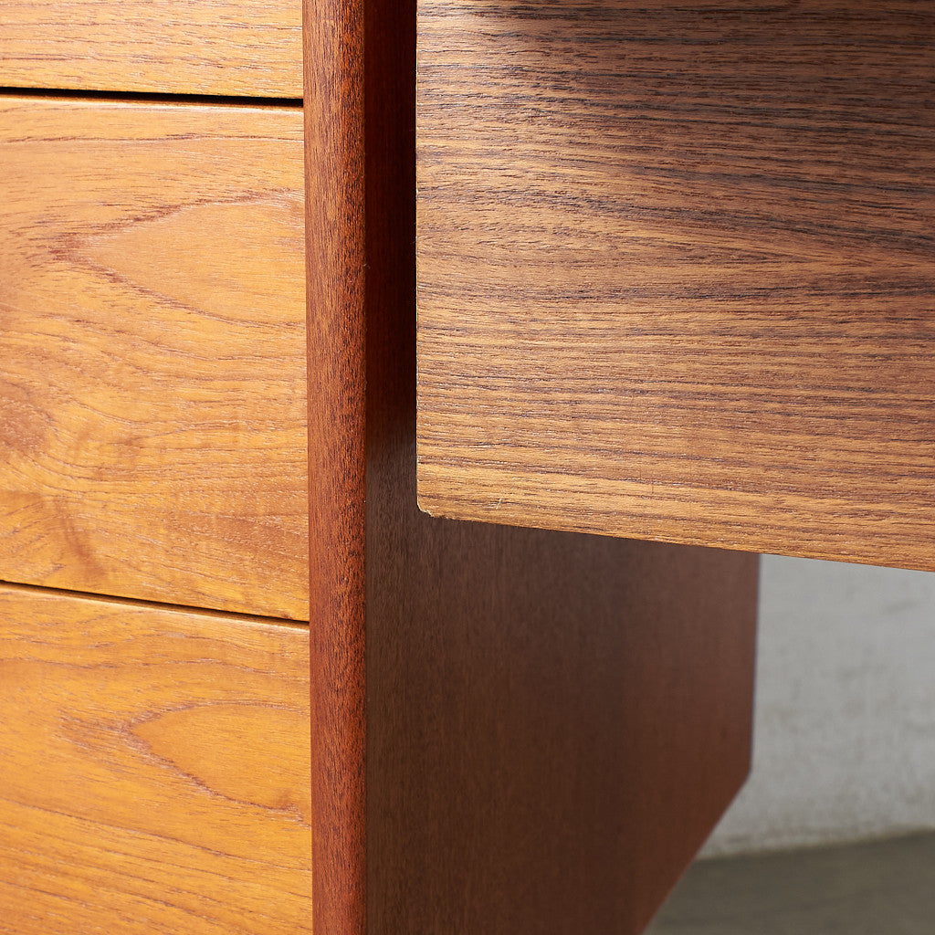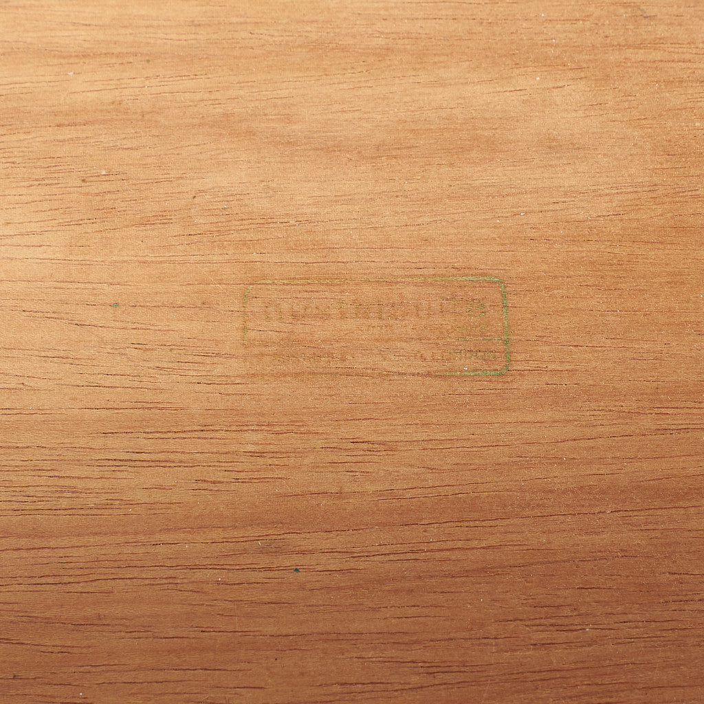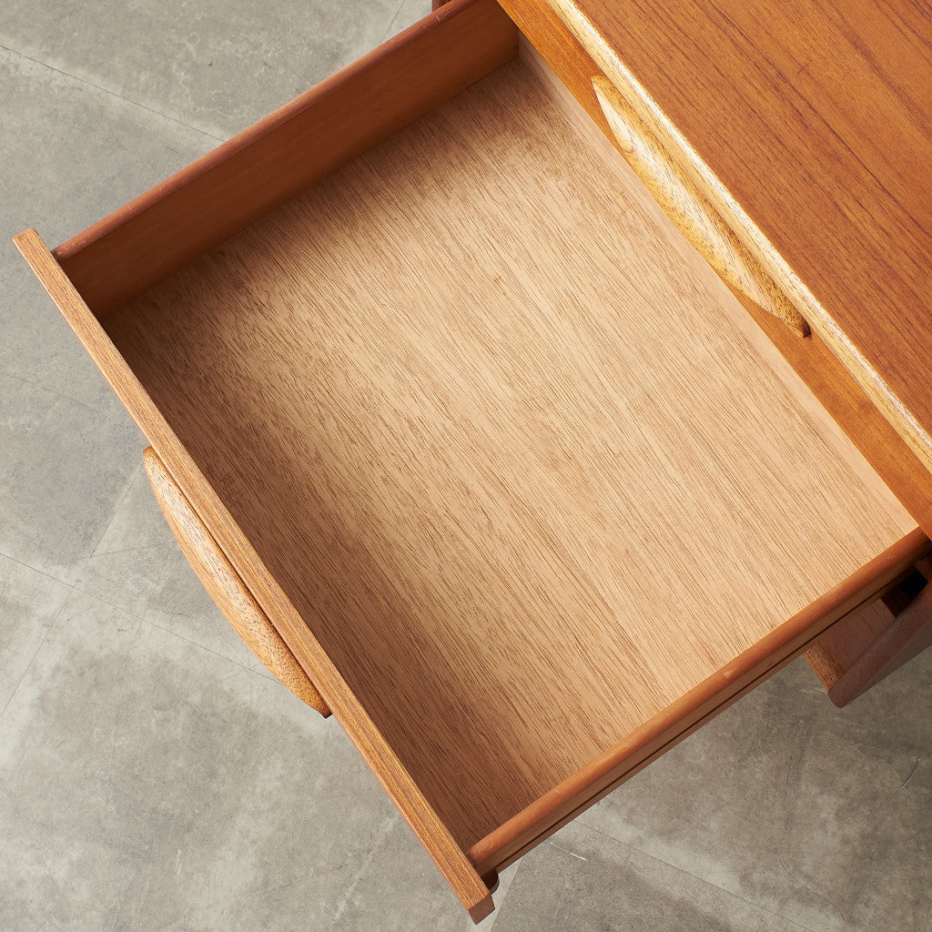 今では希少な高級材であるチーク材を使用した温かみのある褐色の木肌が印象的。研ぎ出された滑らかな取っ手など、実用的でありながらも作り手のこだわりを感じさせるヴィンテージファニチャーです。