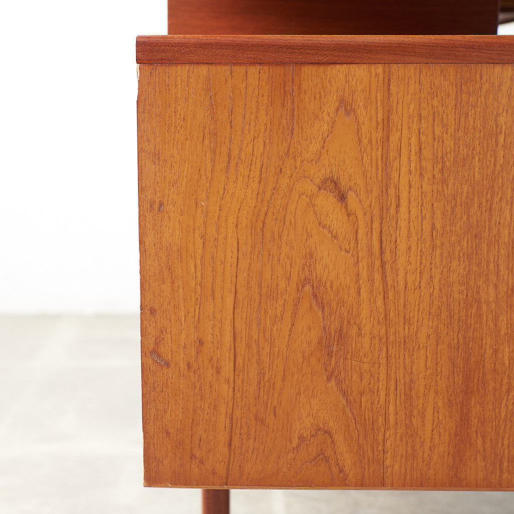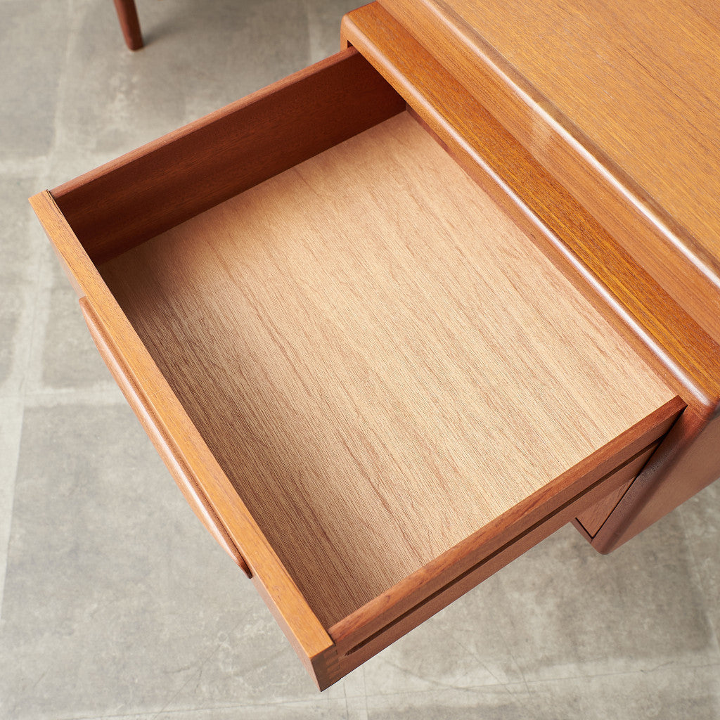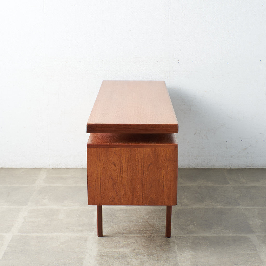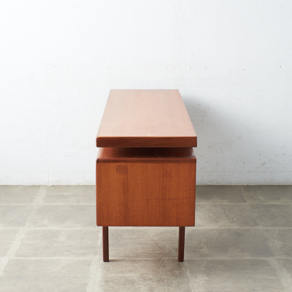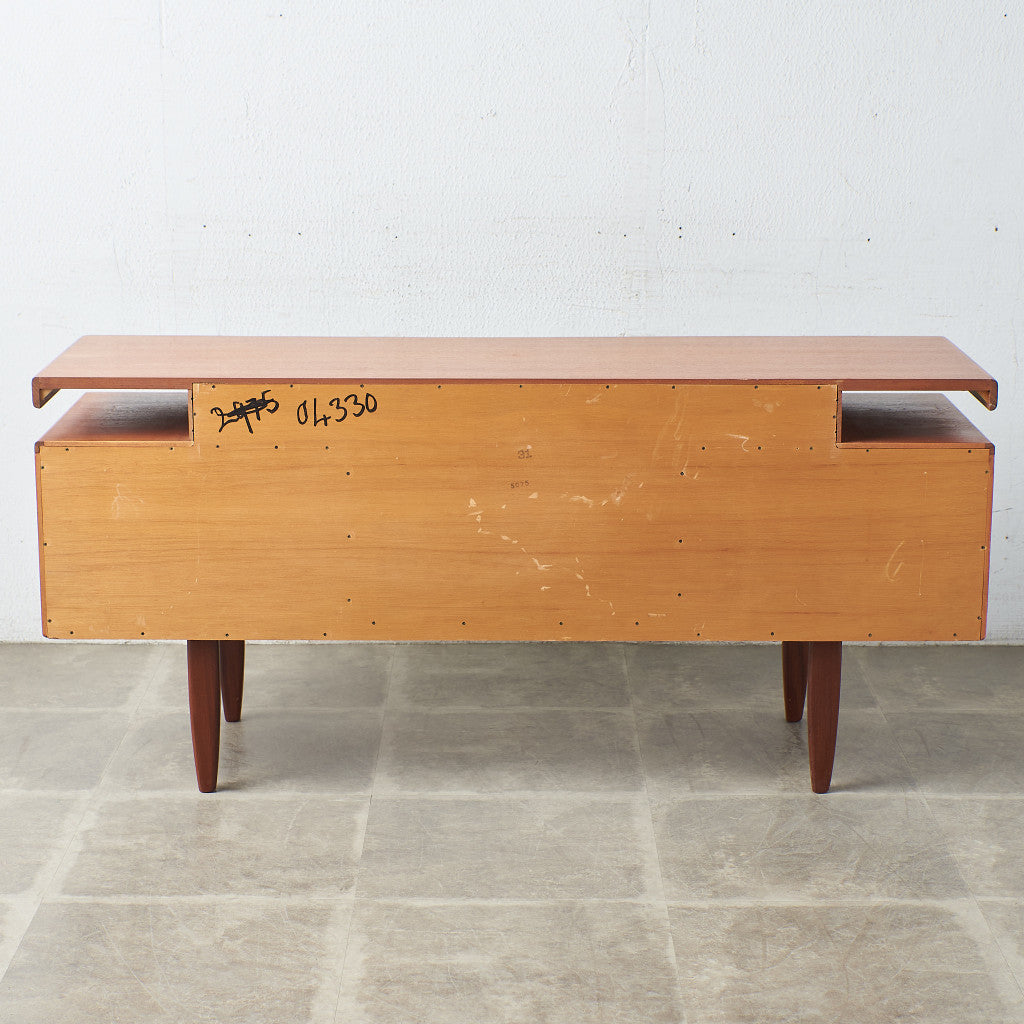 初期のフレスコシリーズドレッサーから脚が変更されたリファイン版、本来は可動式のミラーを備えたドレッサーとしてデザインされていますがミラーを排してデスクとしても利用されています。充実した収納スペースとバランスの取れたデザインが美しい一品です。