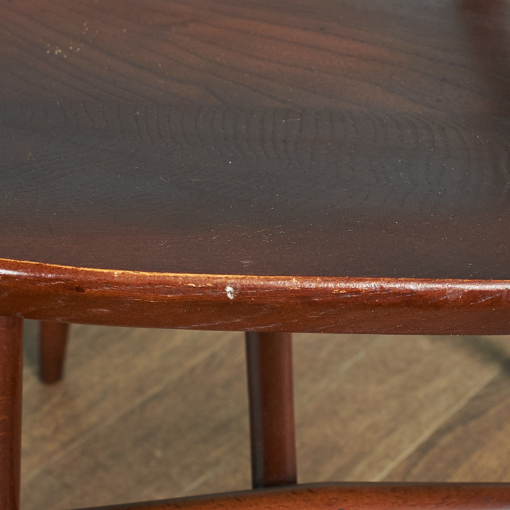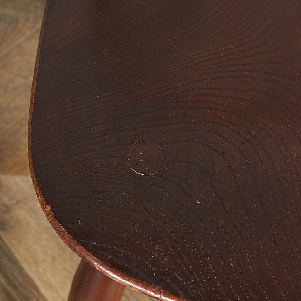 伝統的なウィンザーボウバックチェアをリデザインしたシャープな背面のシルエットが印象的なクエーカーチェア。曲げ木加工による美しい一本の曲線が形作る独特のフォルム。背もたれが高く、ゆったりと寛げる座り心地のよい設計で、アーコールの中でもロングセラーのデザインです。復刻品とヴィンテージ品で背もたれのスポークや材質が異なり、ヴィンテージ品は“スポーク5本でエルム材xブナ材”、現行仕様の一つ前一時期のみ“背もたれ6本仕様エルム材xブナ材“のヴィンテージと現行の中庸に当たるモデルが製造されていました。