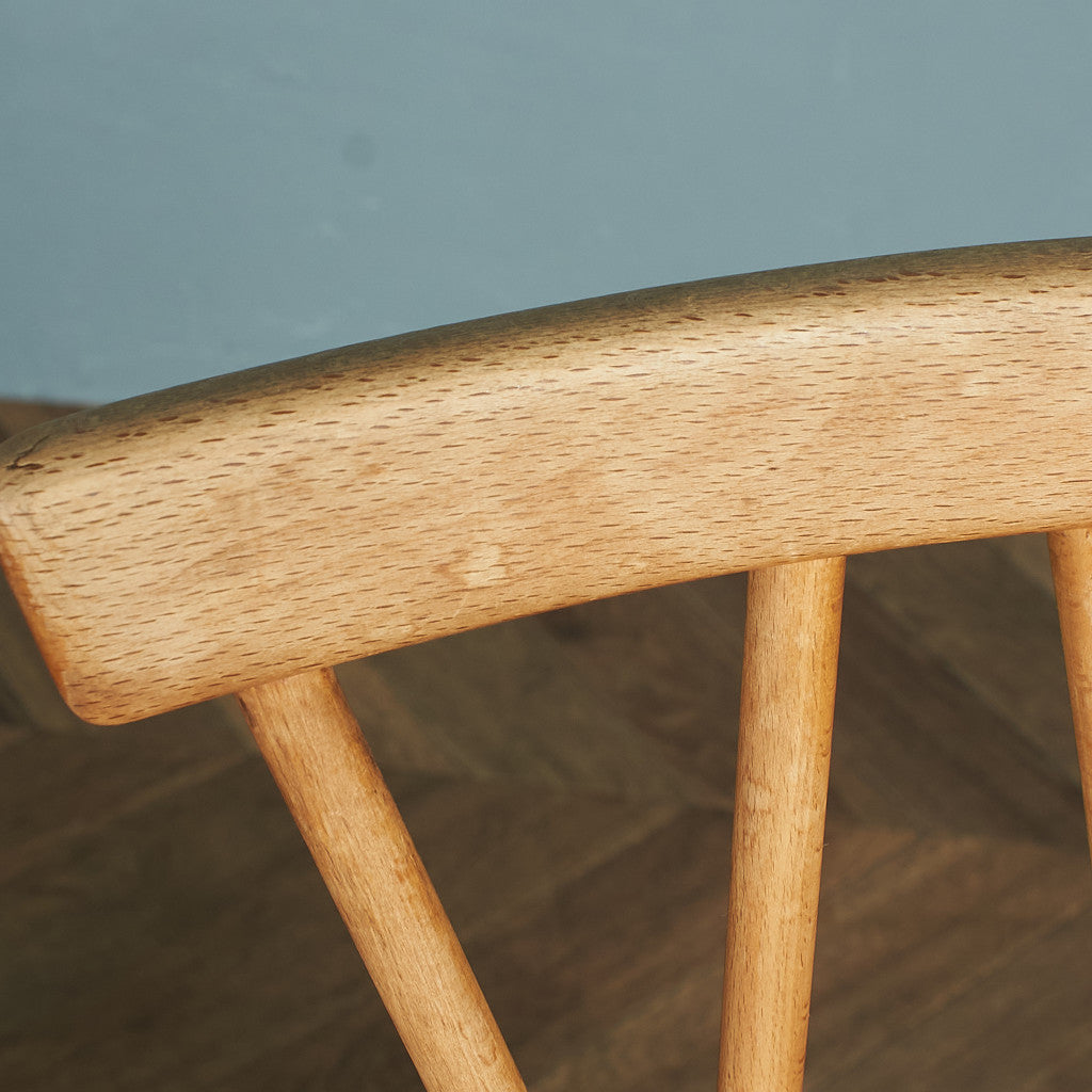 アーコール社のチェアの中でも希少性の高い一品。ラティスドチェアとはしなやかに組まれたスピンドルのフォルムが、庭のラティスフェンスに似ていることに因みます。この椅子にはクロスバックチェア、キャンドルメイカーズチェアの別称もあります。また、脚の貫部分までクロスになっていて、優雅なシルエットが際立っています。8本のスポークが座板に差し込まれていますが、その1本ずつの角度も深さも異なっているため、大変難しい作業となりますが、熟達の鮮やかな手仕事が伺えます。笠木部分にはブナの木を弓状に曲げるウィンザーボウーの技術が息づき、エルム材を使った座面も緩やかな座刳りが施されるなど、随所に職人の丁寧な技巧が凝縮した一脚です。