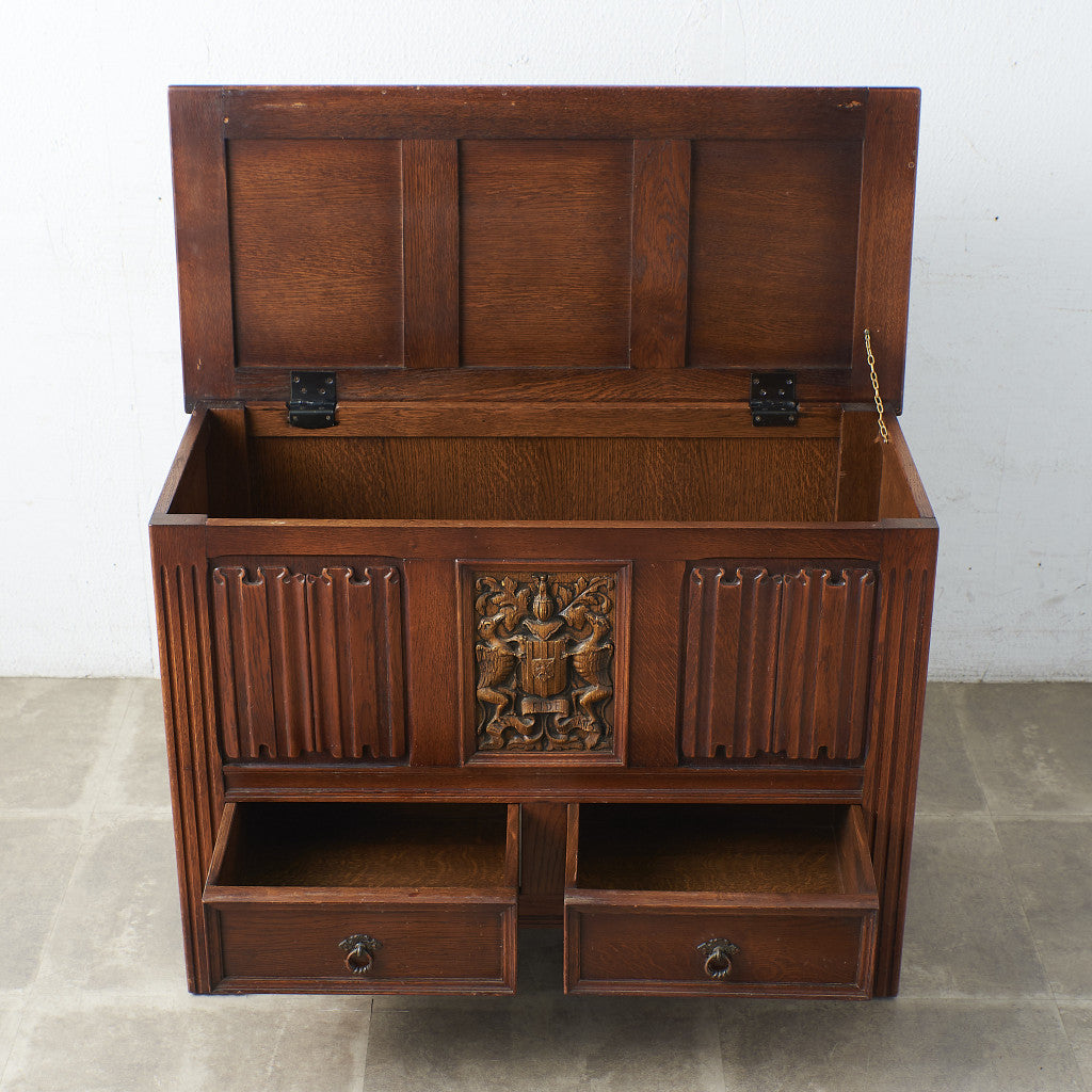 力強い木目を持つオークを用い、英国伝統様式を忠実に再現。布物の収納やおもちゃ箱としての使用はもちろん、センターテーブルとしても活躍します。木彫装飾がアクセントとなったシックなデザインが魅力的。オーク材ならではの心地よい温もり、風合いが素朴で優しい雰囲気を演出します。