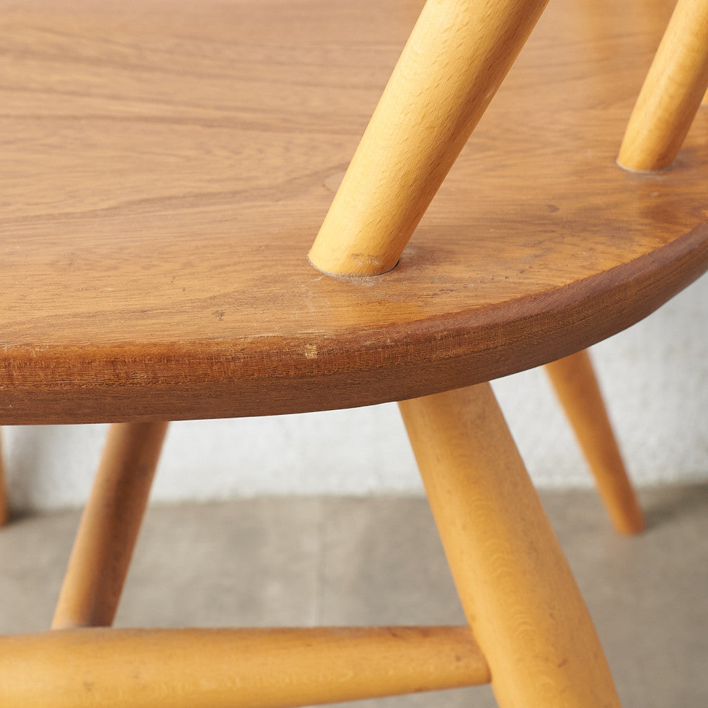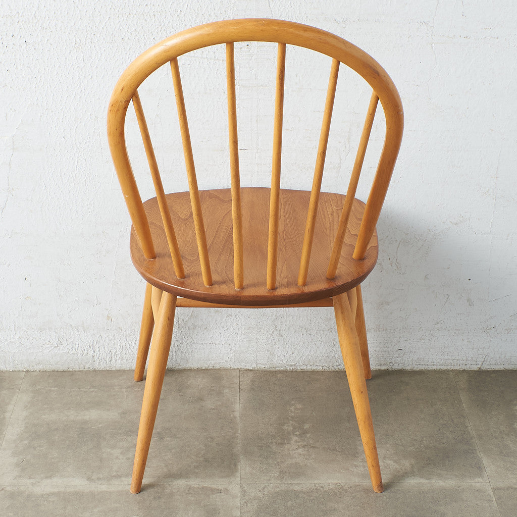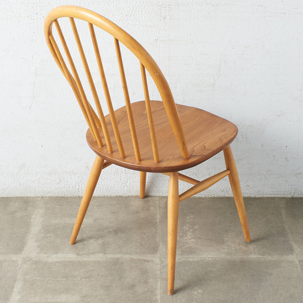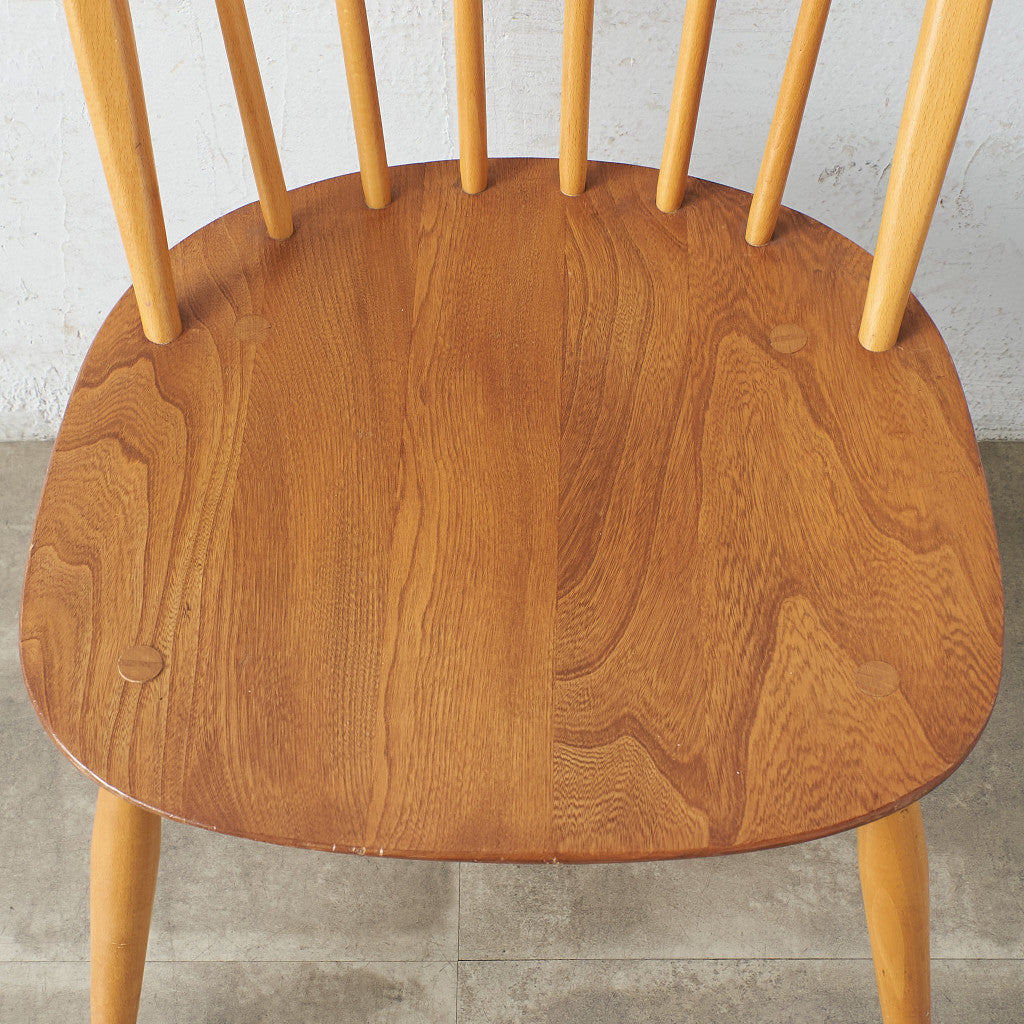 ERCOLのアイコン的存在であるウィンザーチェアシリーズの中で、最もオーソドックスなスタイルのフープバックチェアは「ボウバック(弓型の背もたれ)」という、クラシカルなデザインをベースに作られています。様々なバージョンがあり、背もたれのスポーク数が4本、5本、6本の3タイプ、座面はノーマル型とバイオリン型の2タイプ、大きさはノーマルサイズとラージサイズがあり、さらに6本スポークのチェアにはストレートレッグやアーム付きなどが存在し、その種類の豊富さもコレクター心をくすぐる大きな魅力となっています。