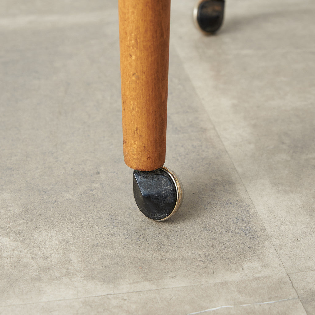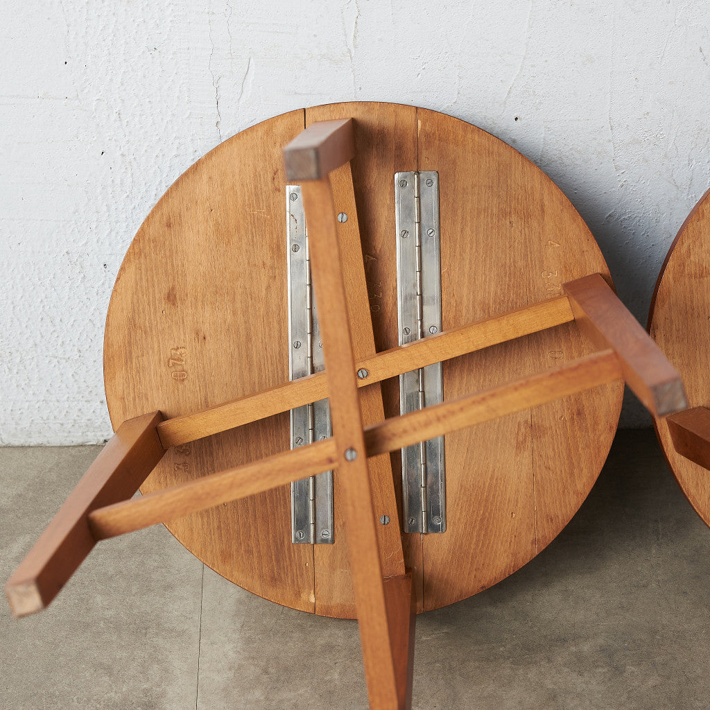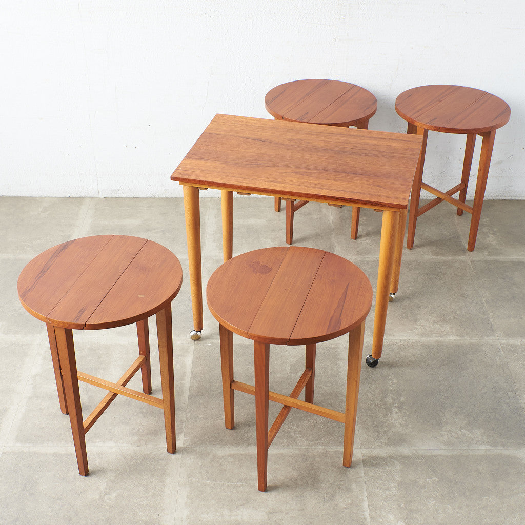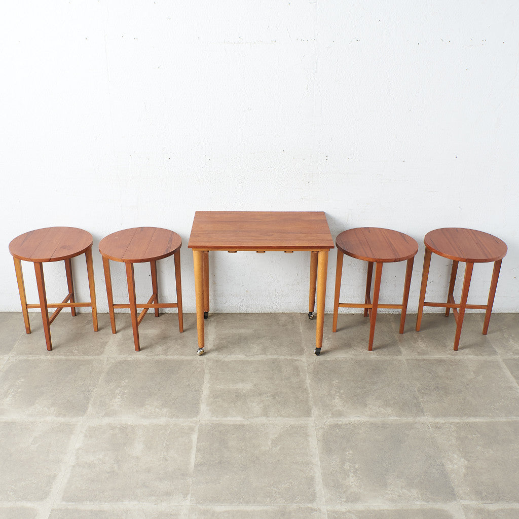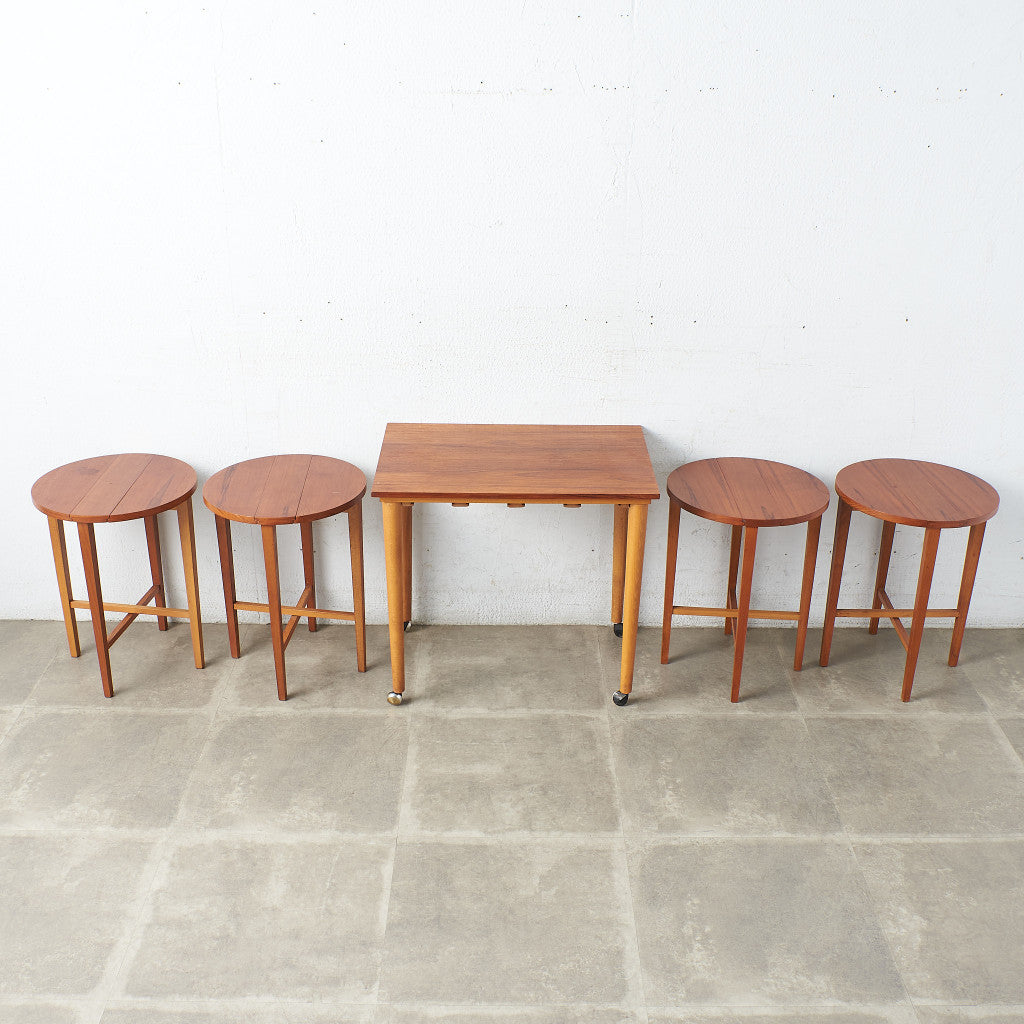 正方形のキャスター付きテーブルの下に、折りたたみの小さいラウンドテーブルを複数収納している変則タイプのユニークなデザイン。市場でもかなり希少なお品です。