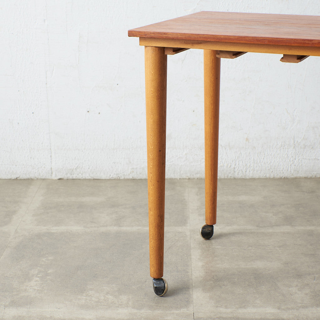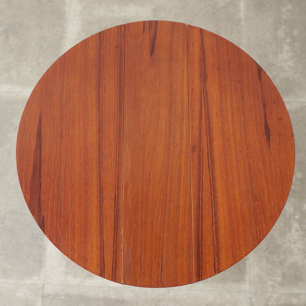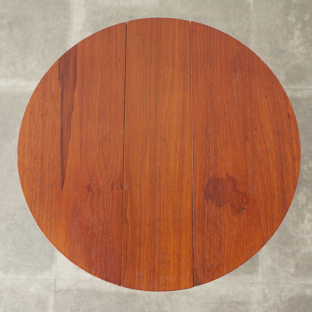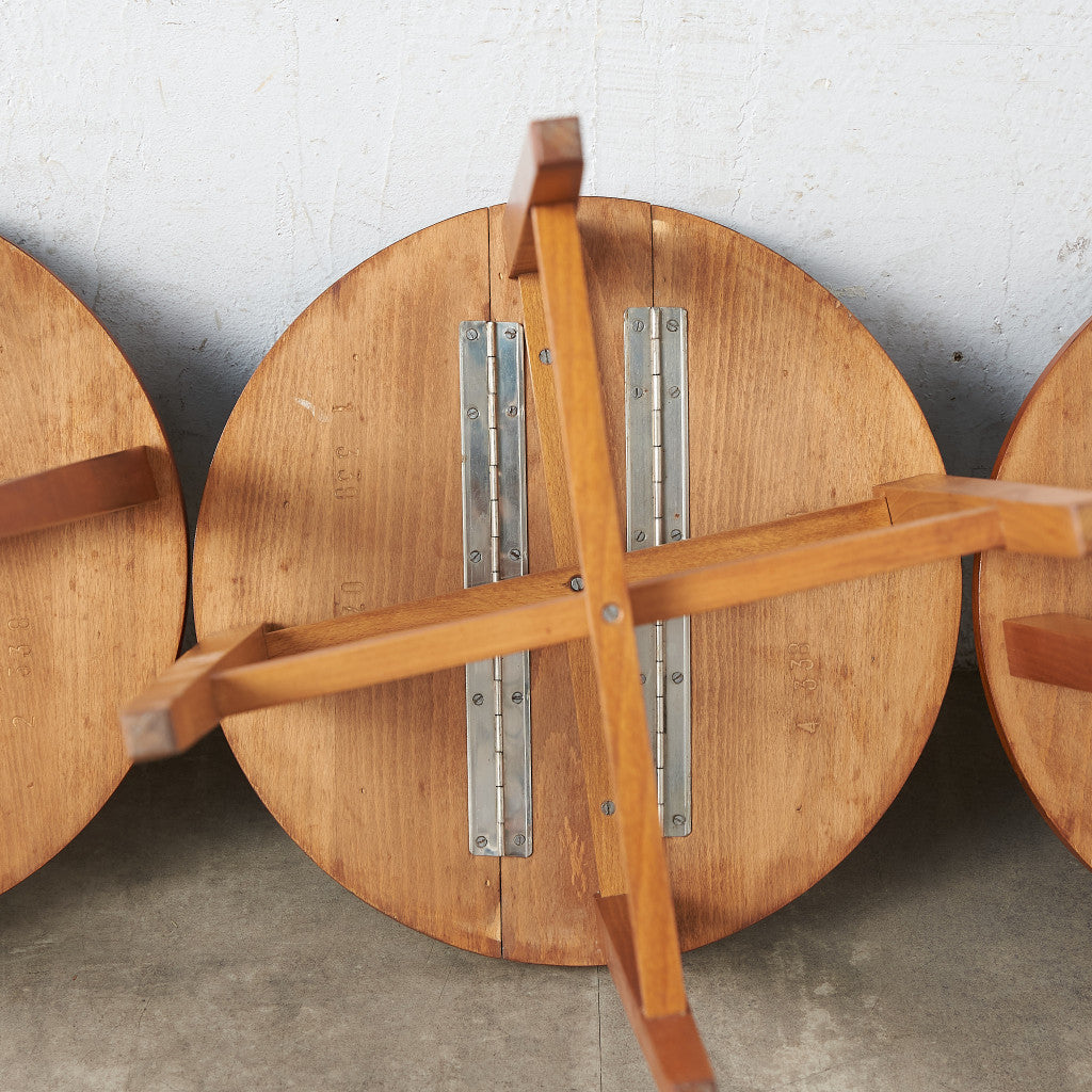 正方形のキャスター付きテーブルの下に、折りたたみの小さいラウンドテーブルを複数収納している変則タイプのユニークなデザイン。市場でもかなり希少なお品です。