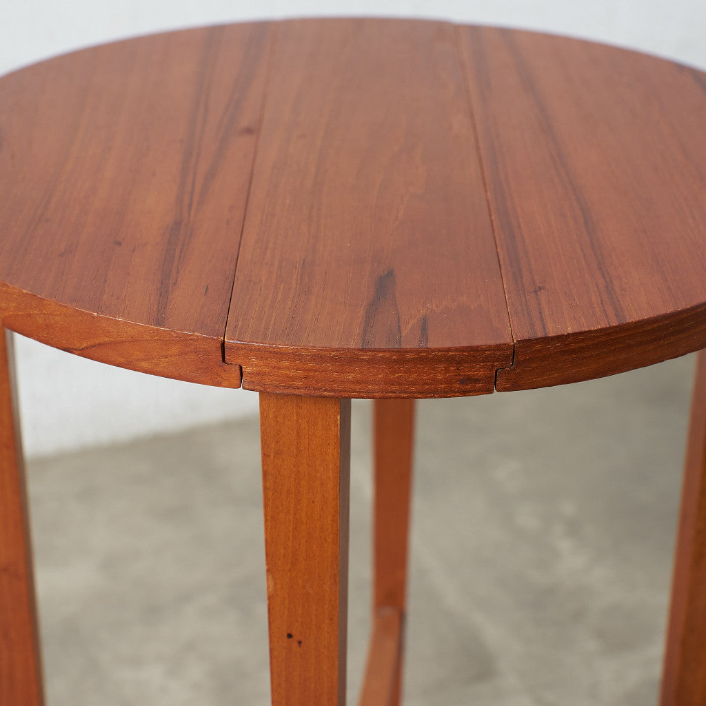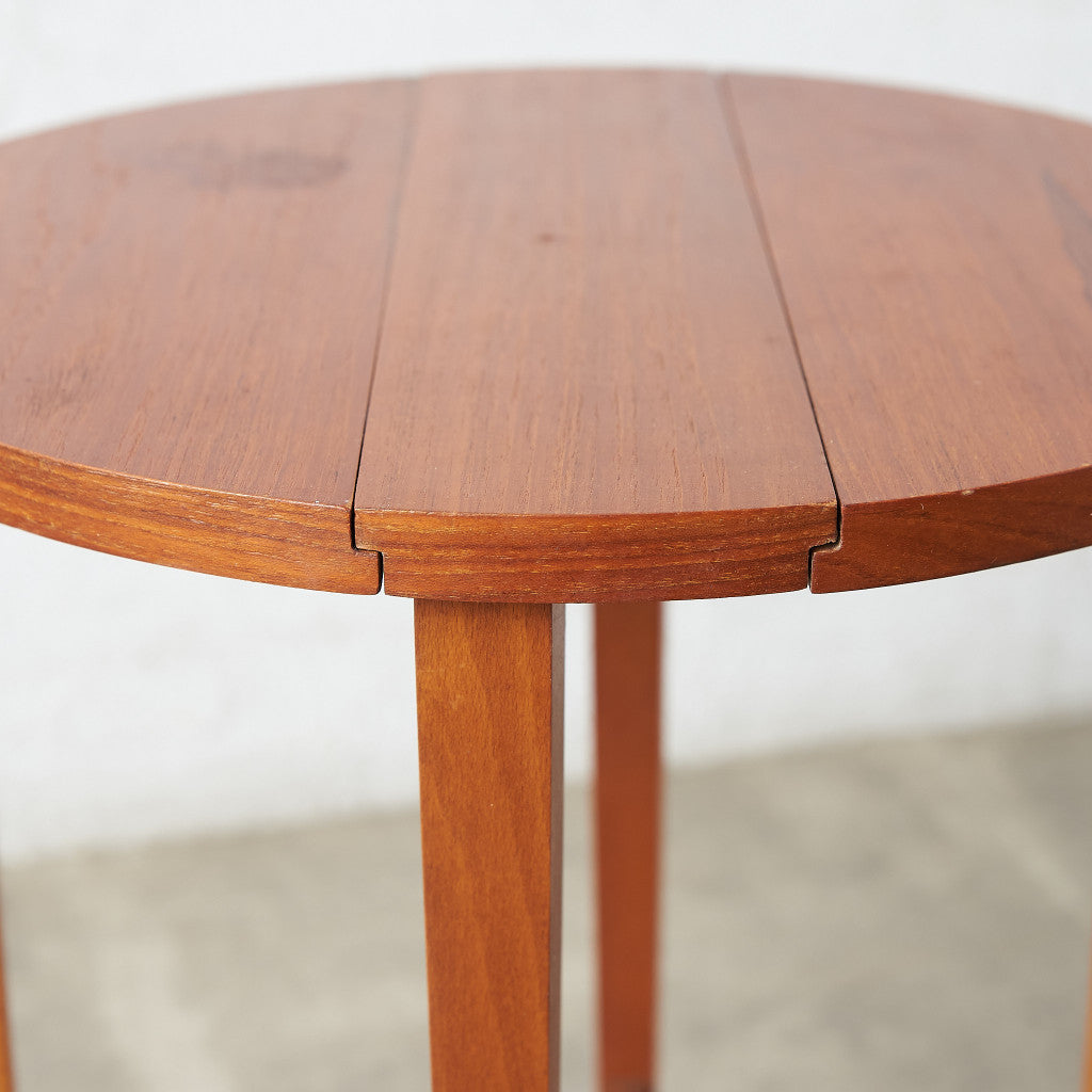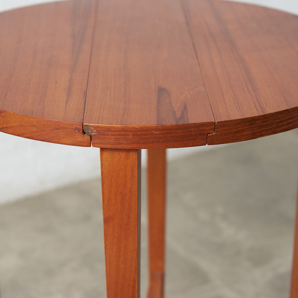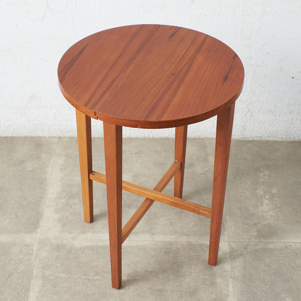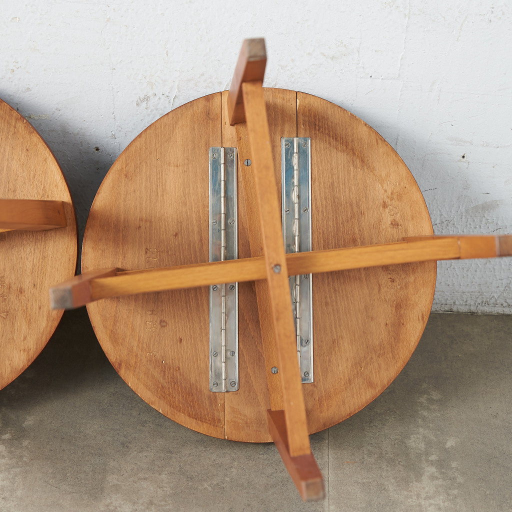 正方形のキャスター付きテーブルの下に、折りたたみの小さいラウンドテーブルを複数収納している変則タイプのユニークなデザイン。市場でもかなり希少なお品です。