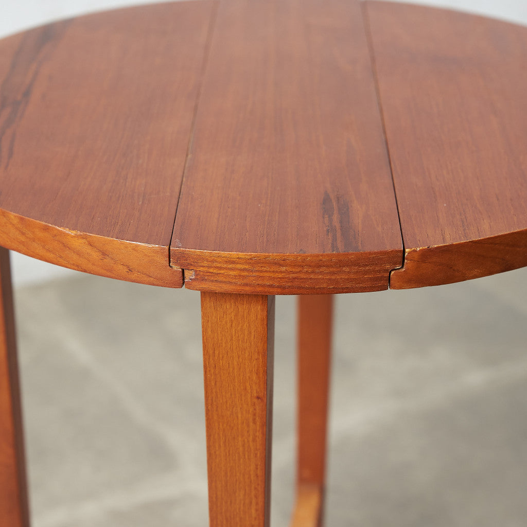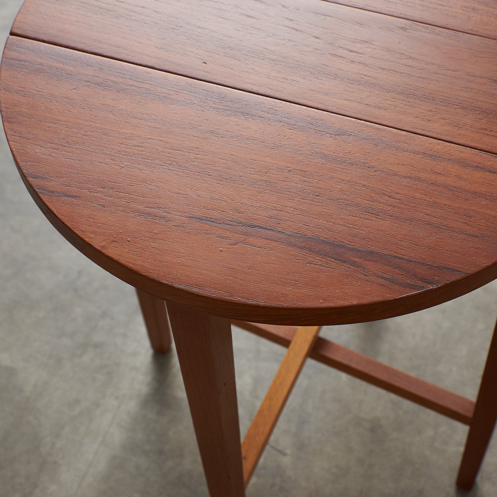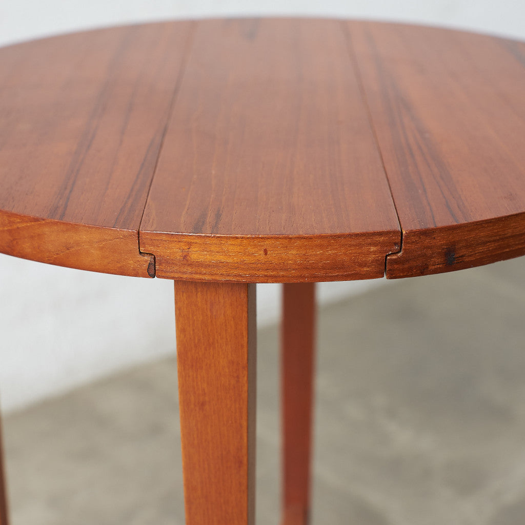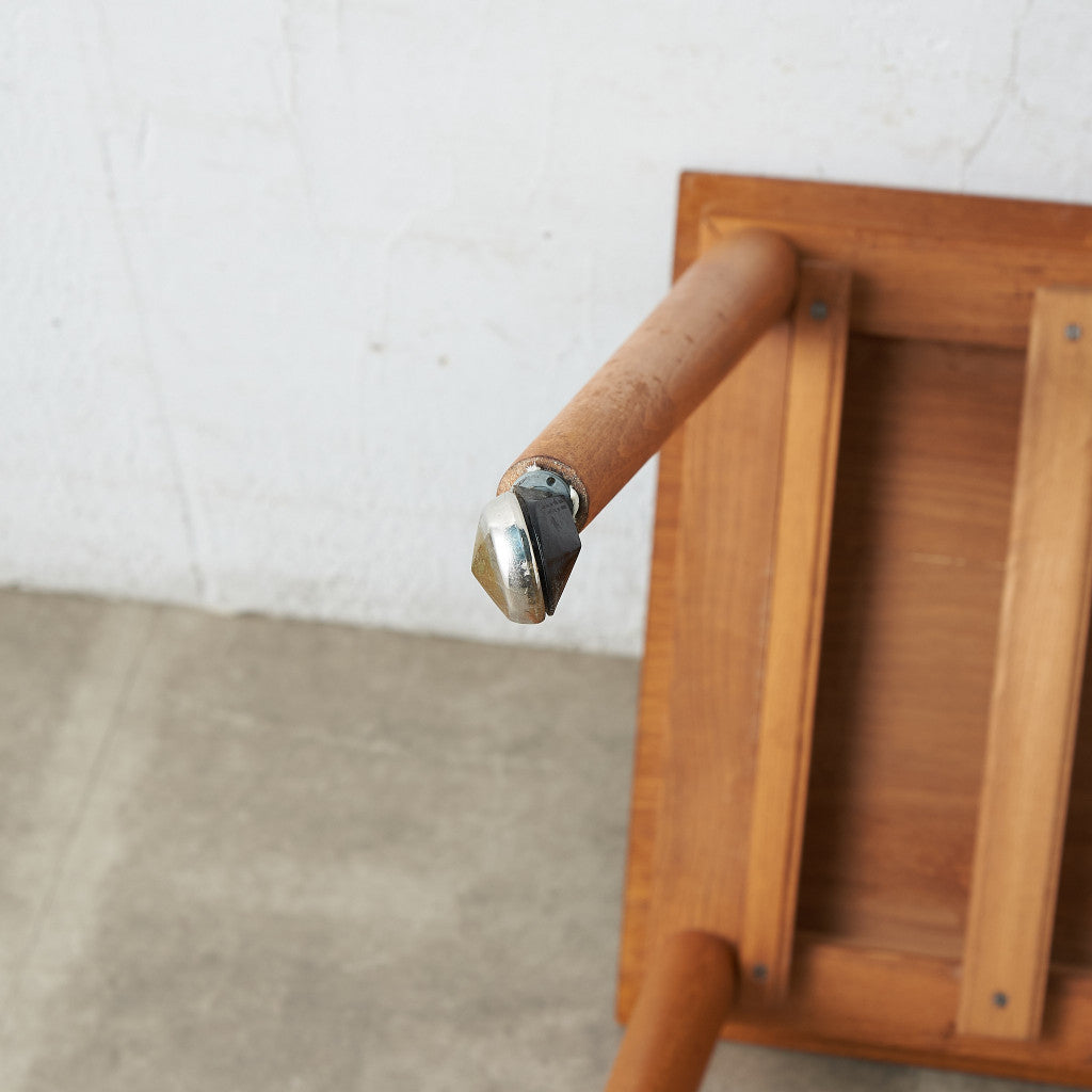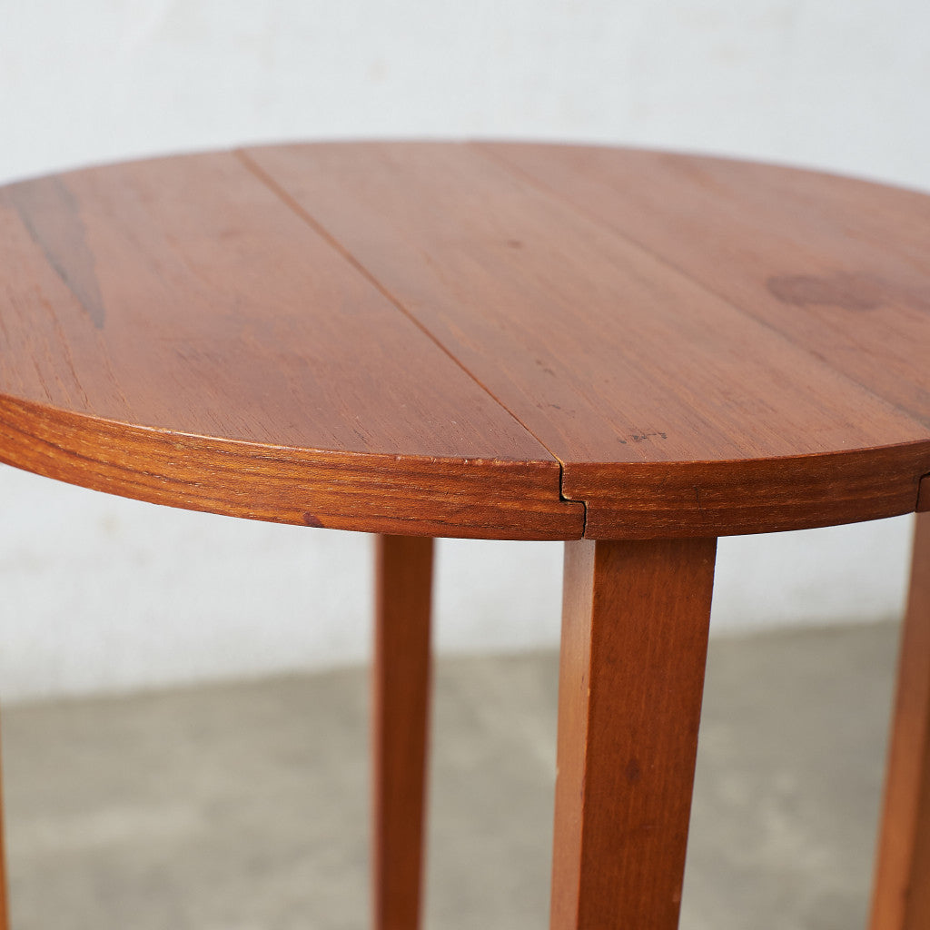 正方形のキャスター付きテーブルの下に、折りたたみの小さいラウンドテーブルを複数収納している変則タイプのユニークなデザイン。市場でもかなり希少なお品です。