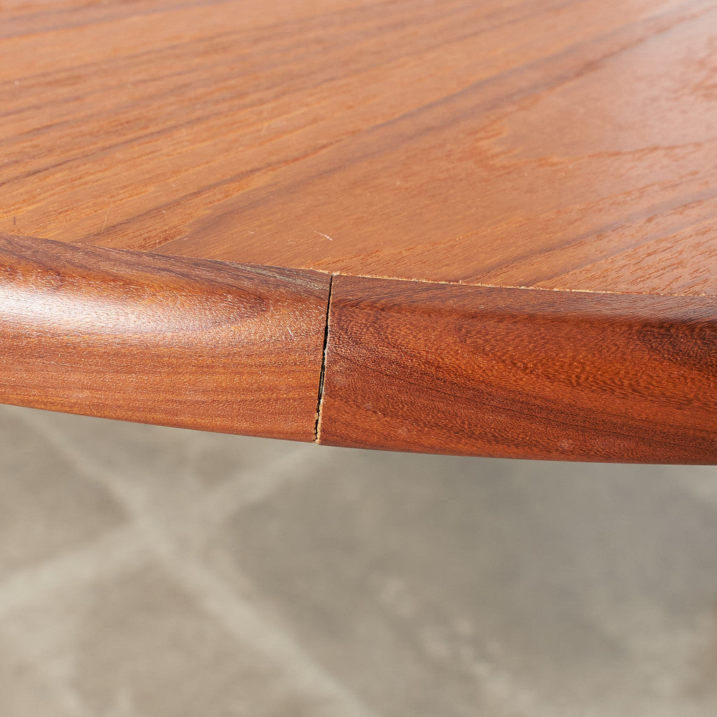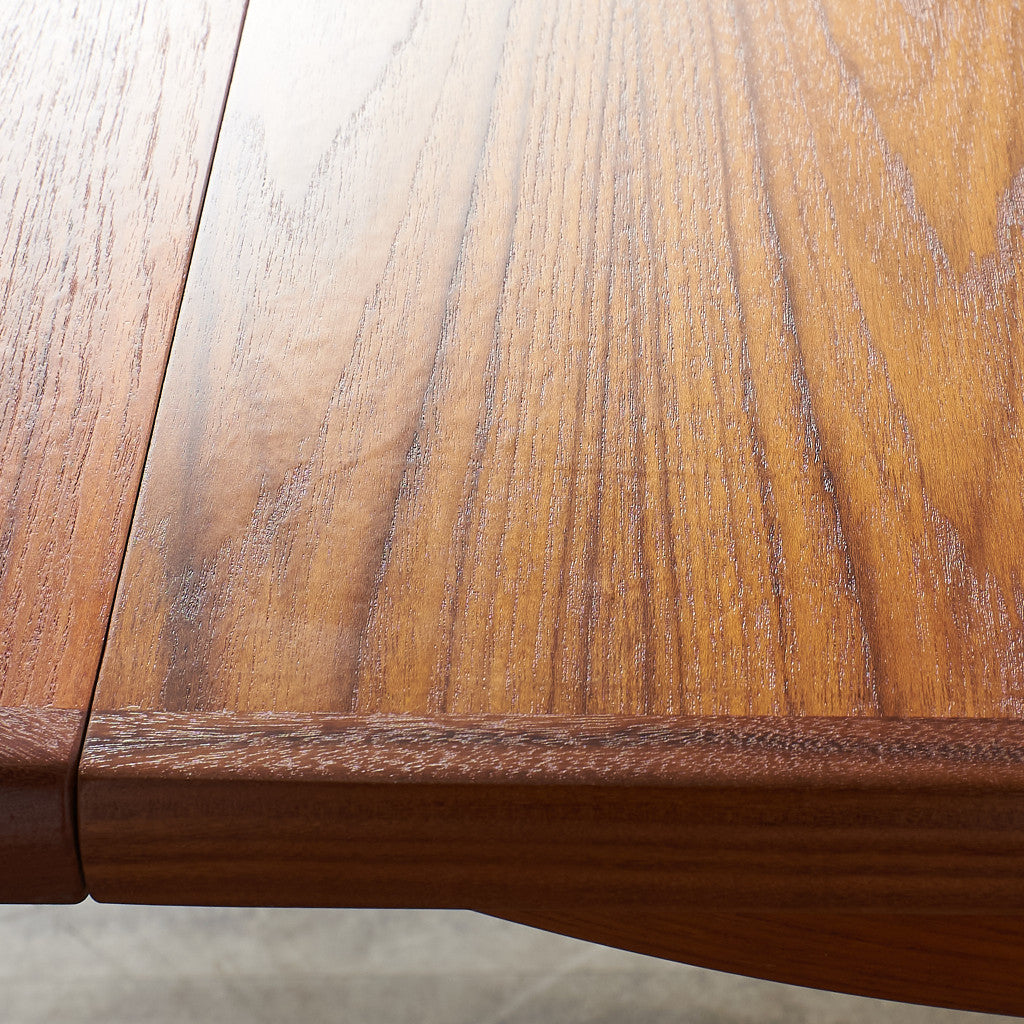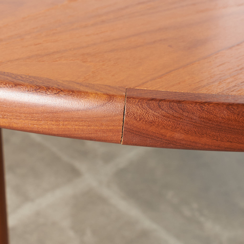 ミッドセンチュリーG-PLANコレクションの中心とも言える定番モデルのラウンドエクステンションテーブル。G-PLANのカタログにおいてもフレスコ、シエラ、ダニッシュ等のチーク材を用いたシリーズで横断的に組み合わせられるベーシックかつ汎用性の高いテーブルです。トップにはチーク、脚と縁には濃色の材を用いたバイカラー仕様。天板下に収納された拡張天板を中央に展開させることでテーブルの上はそのままに簡単にサイズの拡張が可能なエクステンションテーブルです。普段は2人〜4人用、来客時などは天板をさっと広げて6人用としてお使いいただけます。