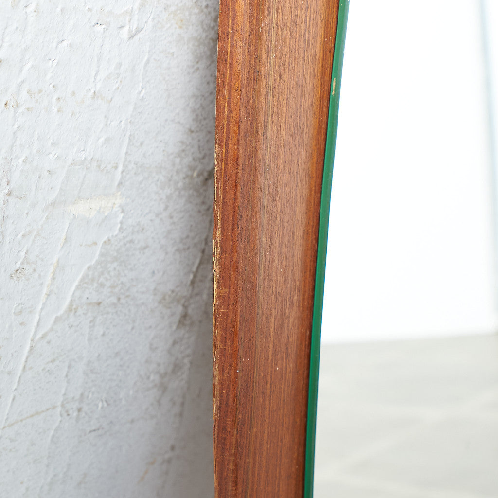 あたたかみのある褐色の木肌や、北欧スタイルのデザインが美しいヴィンテージミラー。デンマークの年代物やミッドセンチュリーインテリアとも相性の良いお品です。