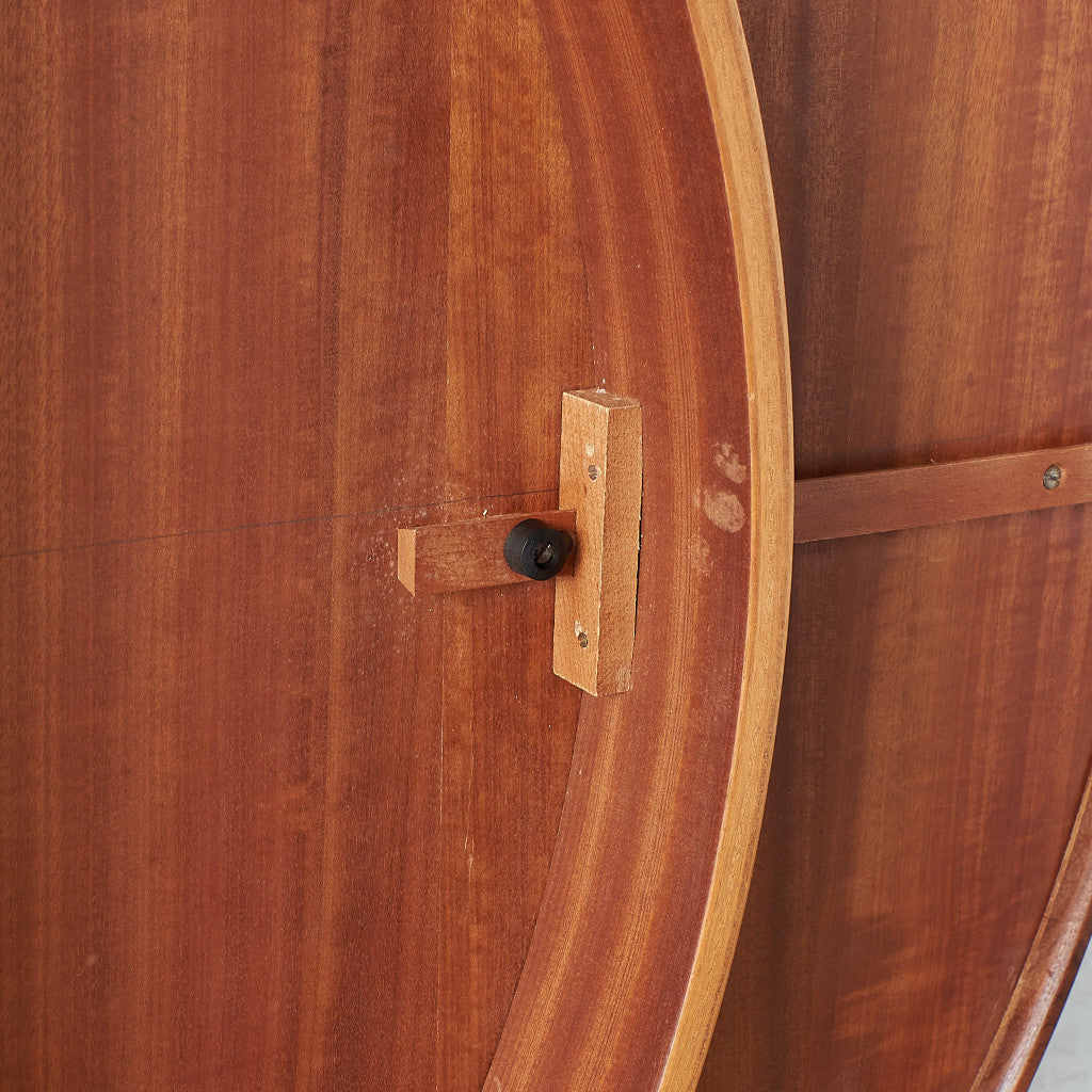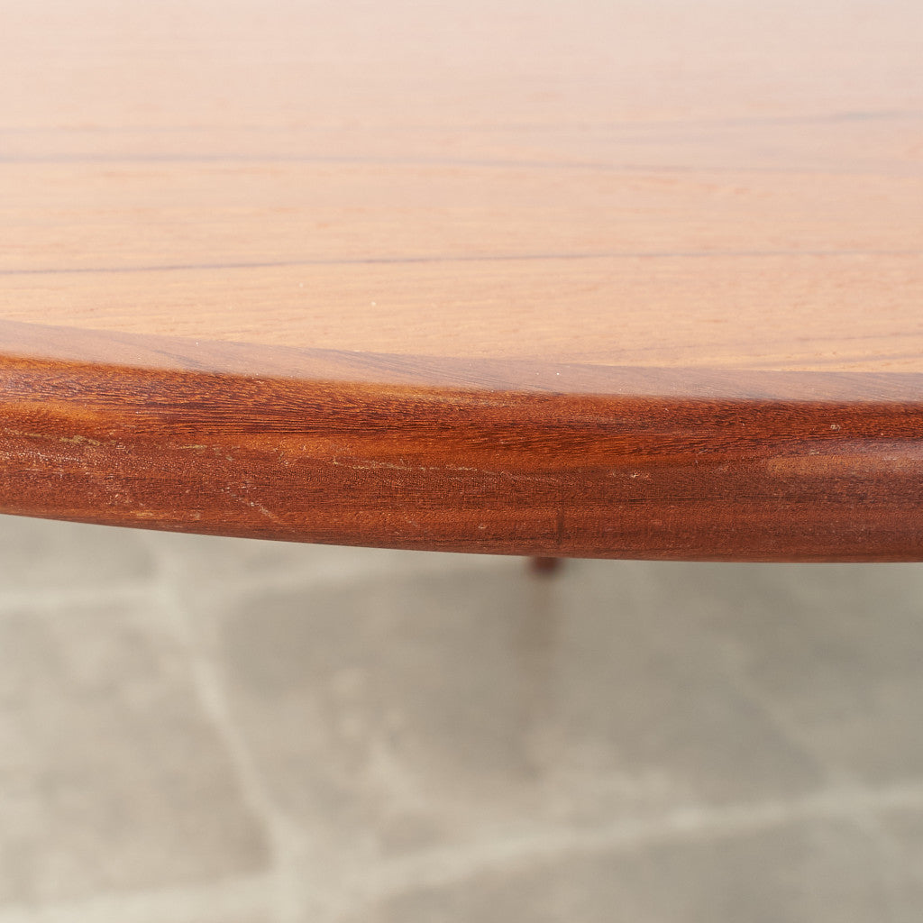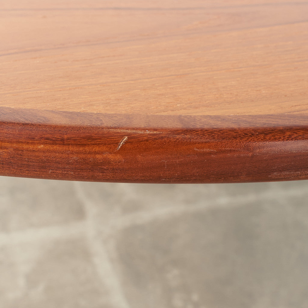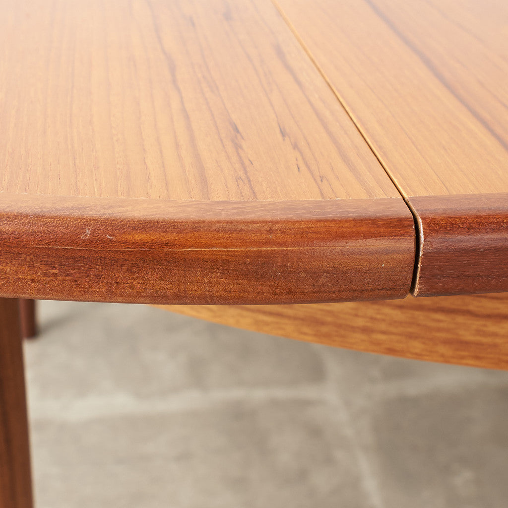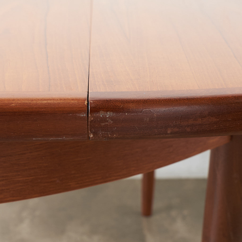 ミッドセンチュリーG-PLANコレクションの中心とも言える定番モデルのラウンドエクステンションテーブル。G-PLANのカタログにおいてもフレスコ、シエラ、ダニッシュ等のチーク材を用いたシリーズで横断的に組み合わせられるベーシックかつ汎用性の高いテーブルです。トップにはチーク、脚と縁には濃色の材を用いたバイカラー仕様。天板下に収納された拡張天板を中央に展開させることでテーブルの上はそのままに簡単にサイズの拡張が可能なエクステンションテーブルです。普段は2人〜4人用、来客時などは天板をさっと広げて6人用としてお使いいただけます。