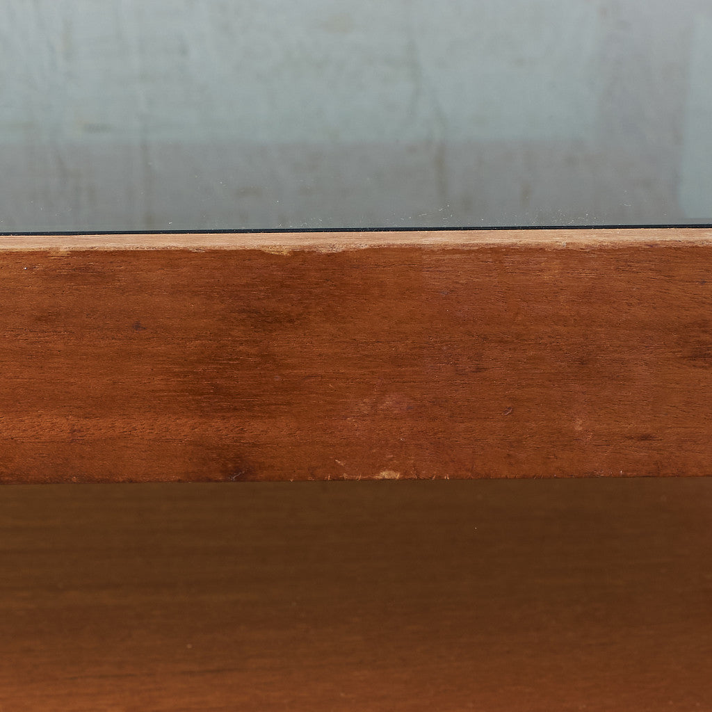 ガラスコーナーが若干浮遊しているように見えるデザインや、湾曲した脚フレームなど手の込んだ仕上がりが印象的。洗練された美しい佇まいが目を惹く、イギリスミッドセンチュリー黄金期のヴィンテージファニチャーです。