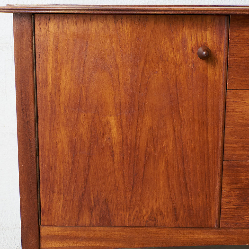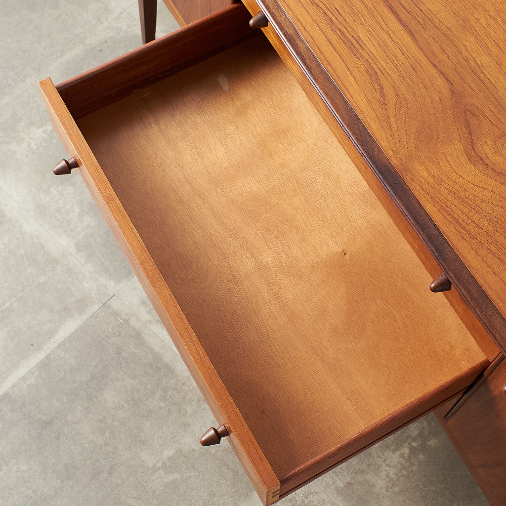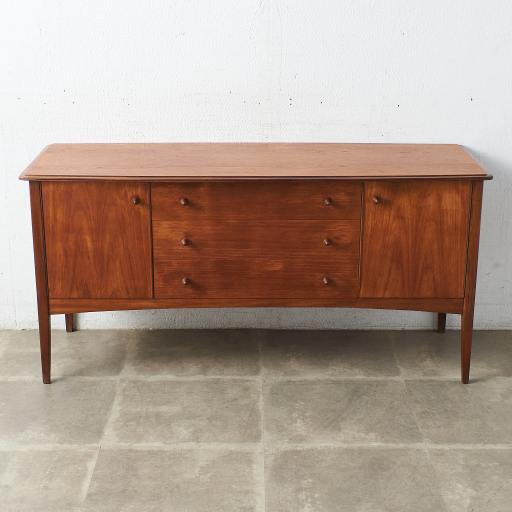 デンマークスタイルのデザインに独自のアレンジが施された個性的なサイドボード。シンプルなフォルムに特徴あるハンドルの意匠が目を惹く、遊び心とかっこよさを併せ持つデザインが魅力です。実用的でありながらも作り手のこだわりを感じさせるヴィンテージファニチャーです。