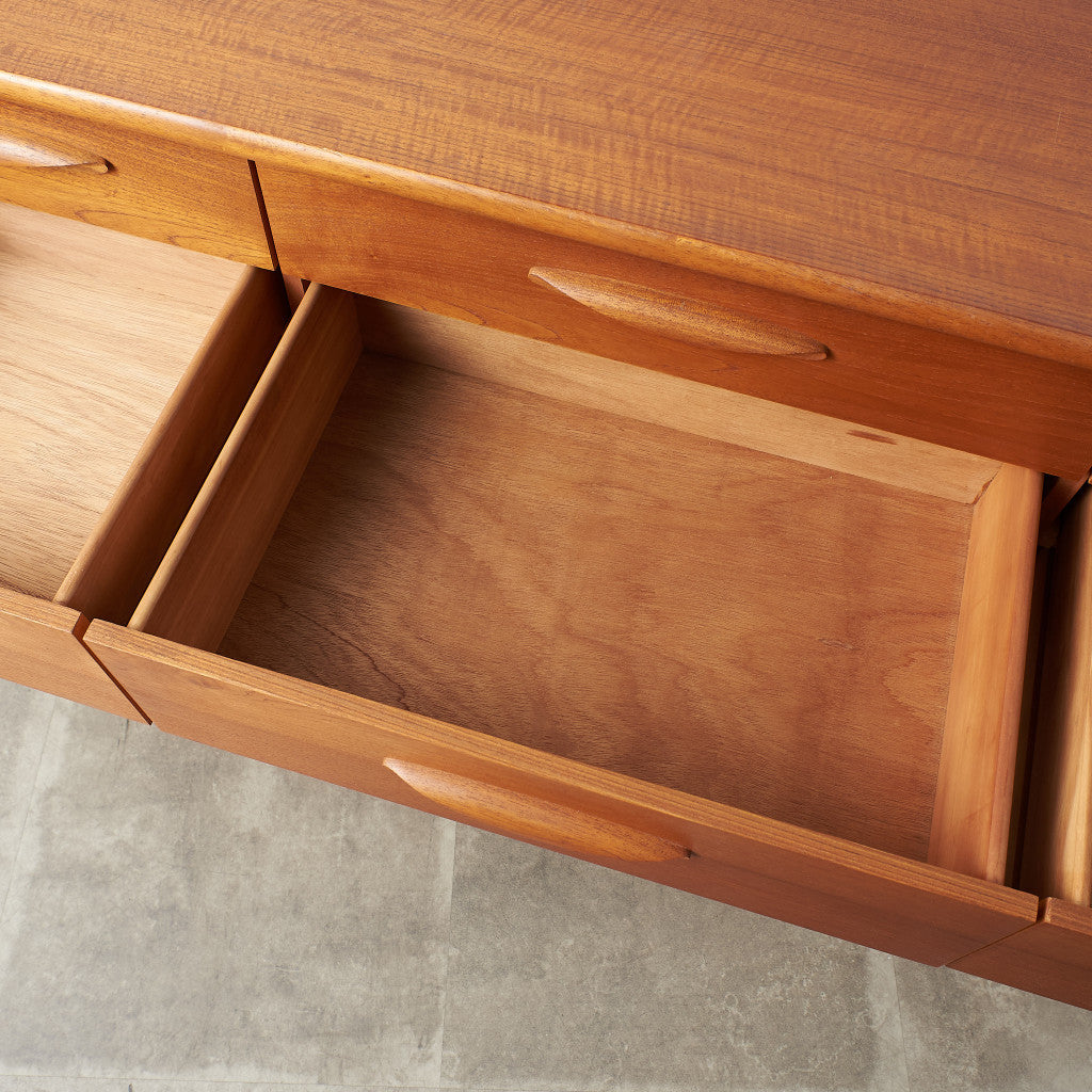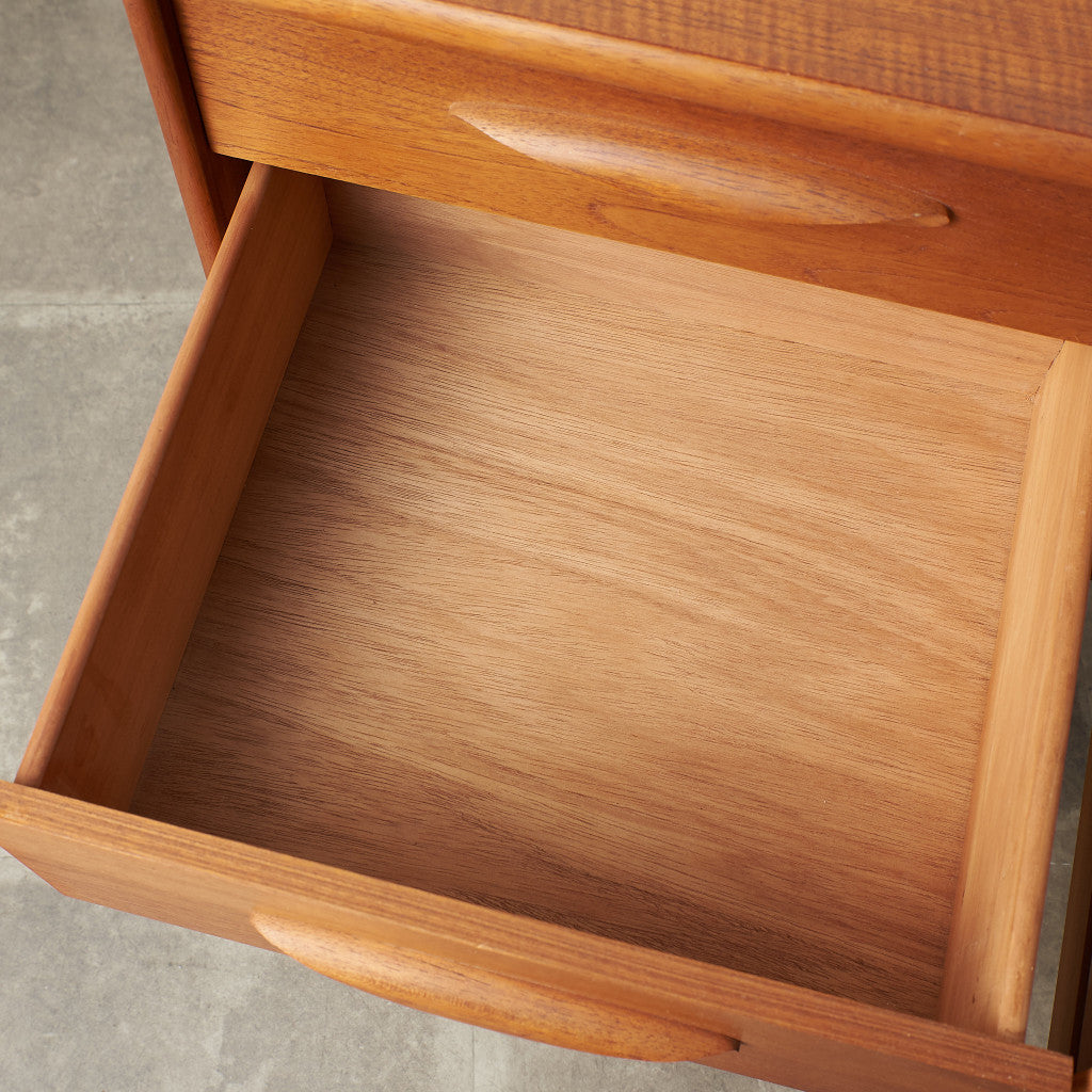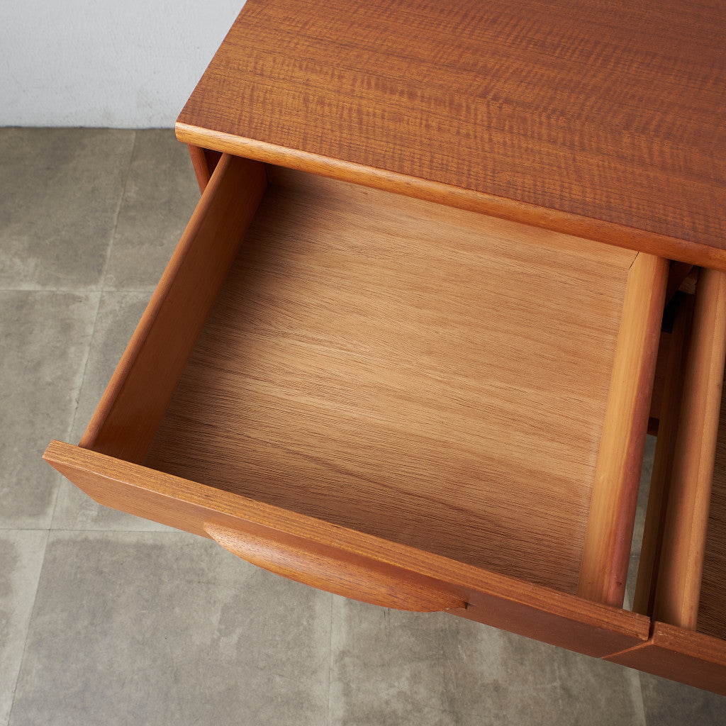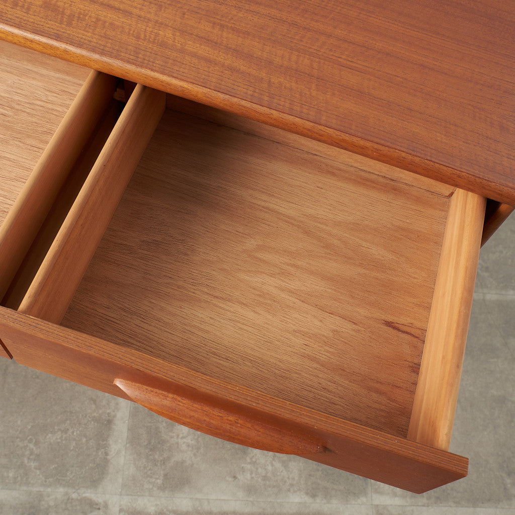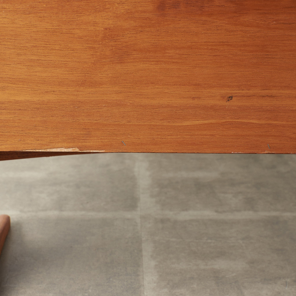 今では希少な高級材であるチーク材を使用した温かみのある褐色の木肌、ペーパーナイフのように研ぎ出された滑らかな取っ手等実用的でありながらも作り手のこだわりを感じさせるヴィンテージファニチャーです。