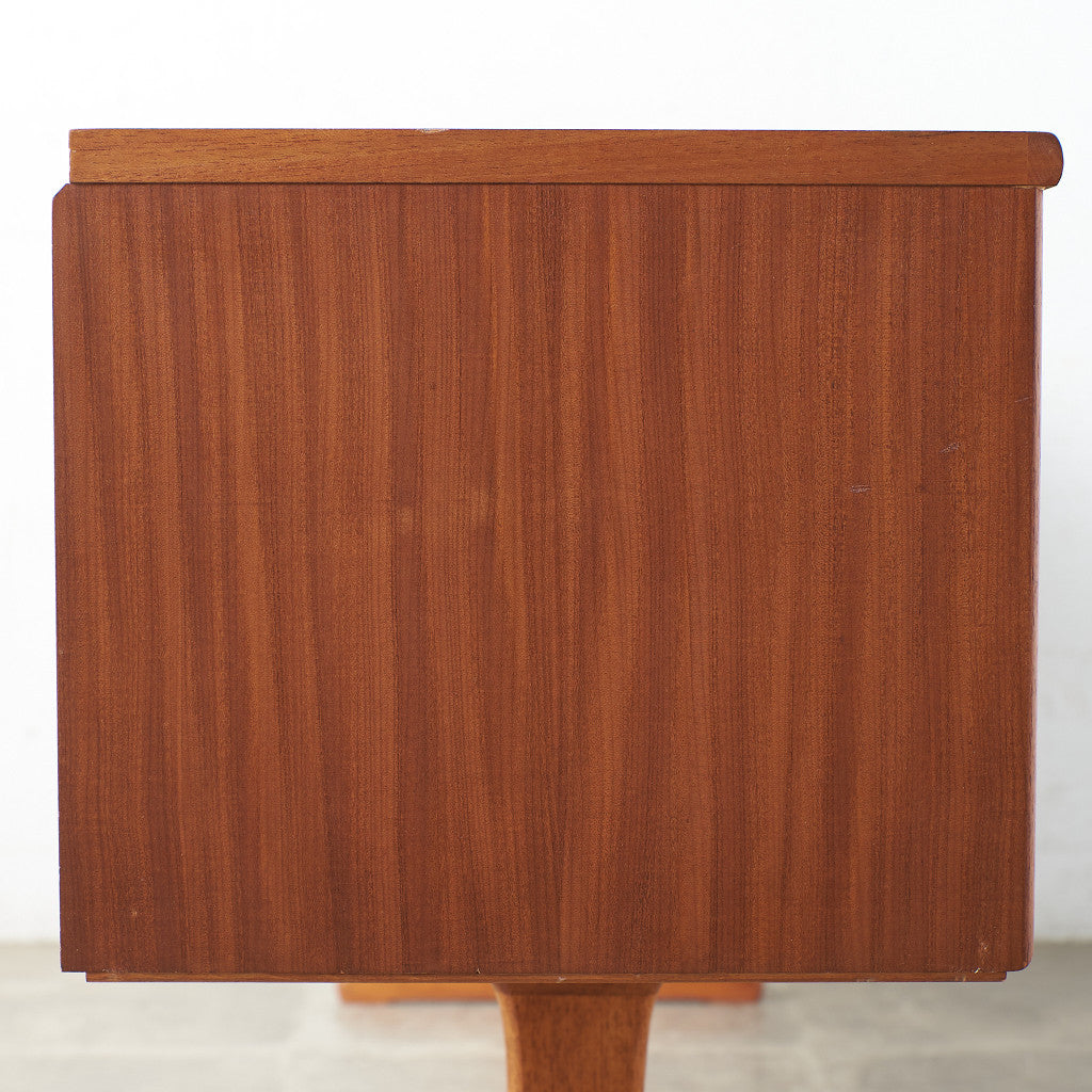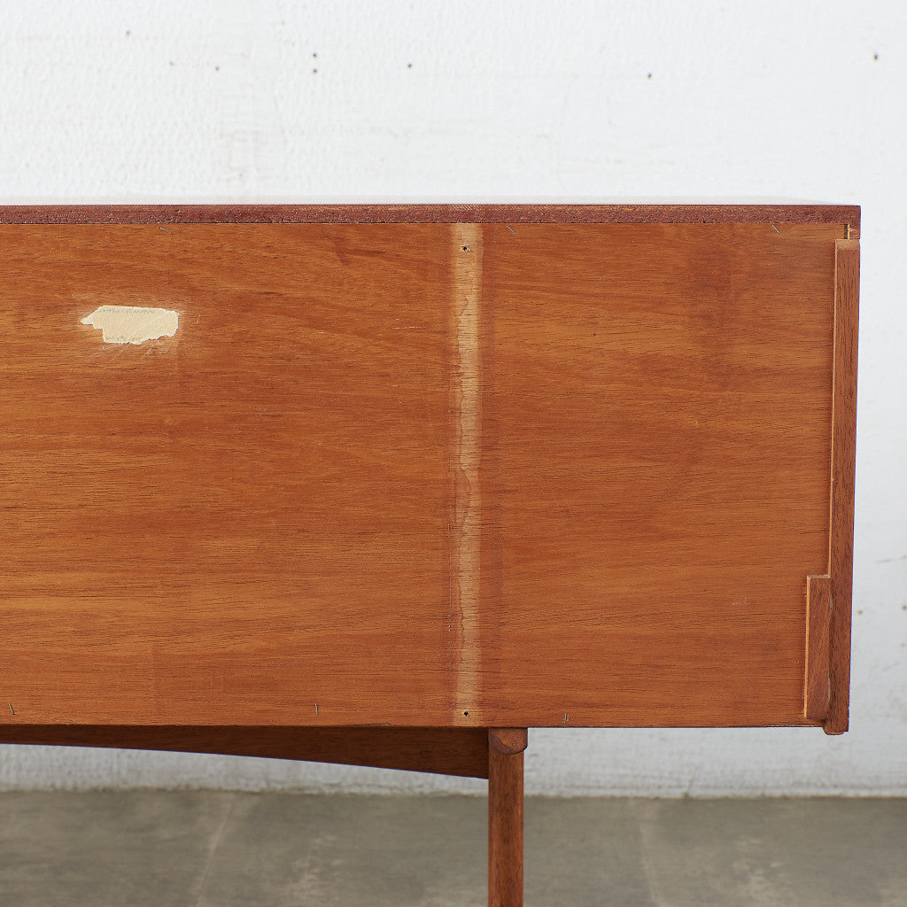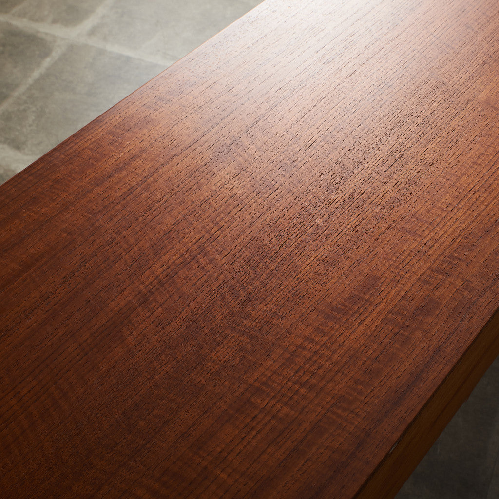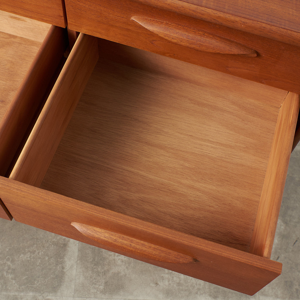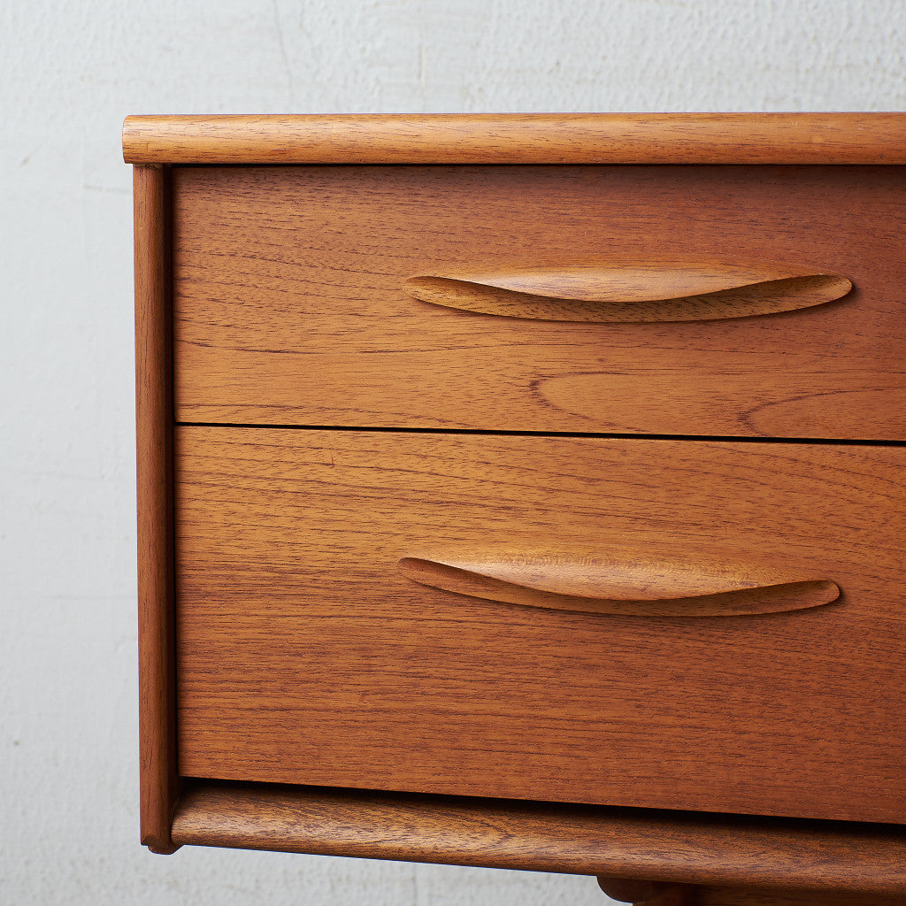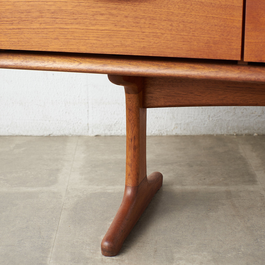 今では希少な高級材であるチーク材を使用した温かみのある褐色の木肌、ペーパーナイフのように研ぎ出された滑らかな取っ手等実用的でありながらも作り手のこだわりを感じさせるヴィンテージファニチャーです。