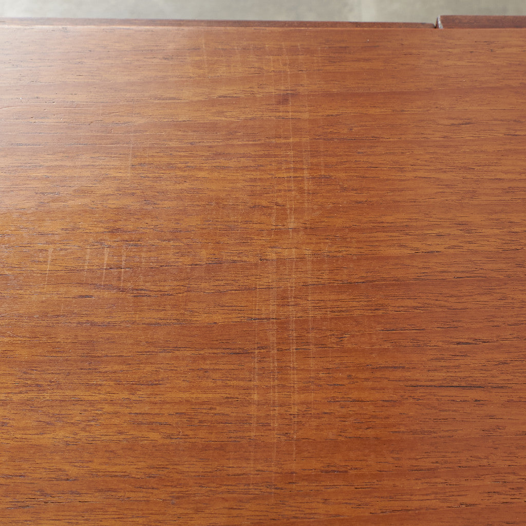 今では希少な高級材であるチーク材を使用した、温かみのある褐色の木肌が印象的。実用的でありながらも作り手のこだわりを感じさせる、北欧家具黄金期のヴィンテージファニチャーです。