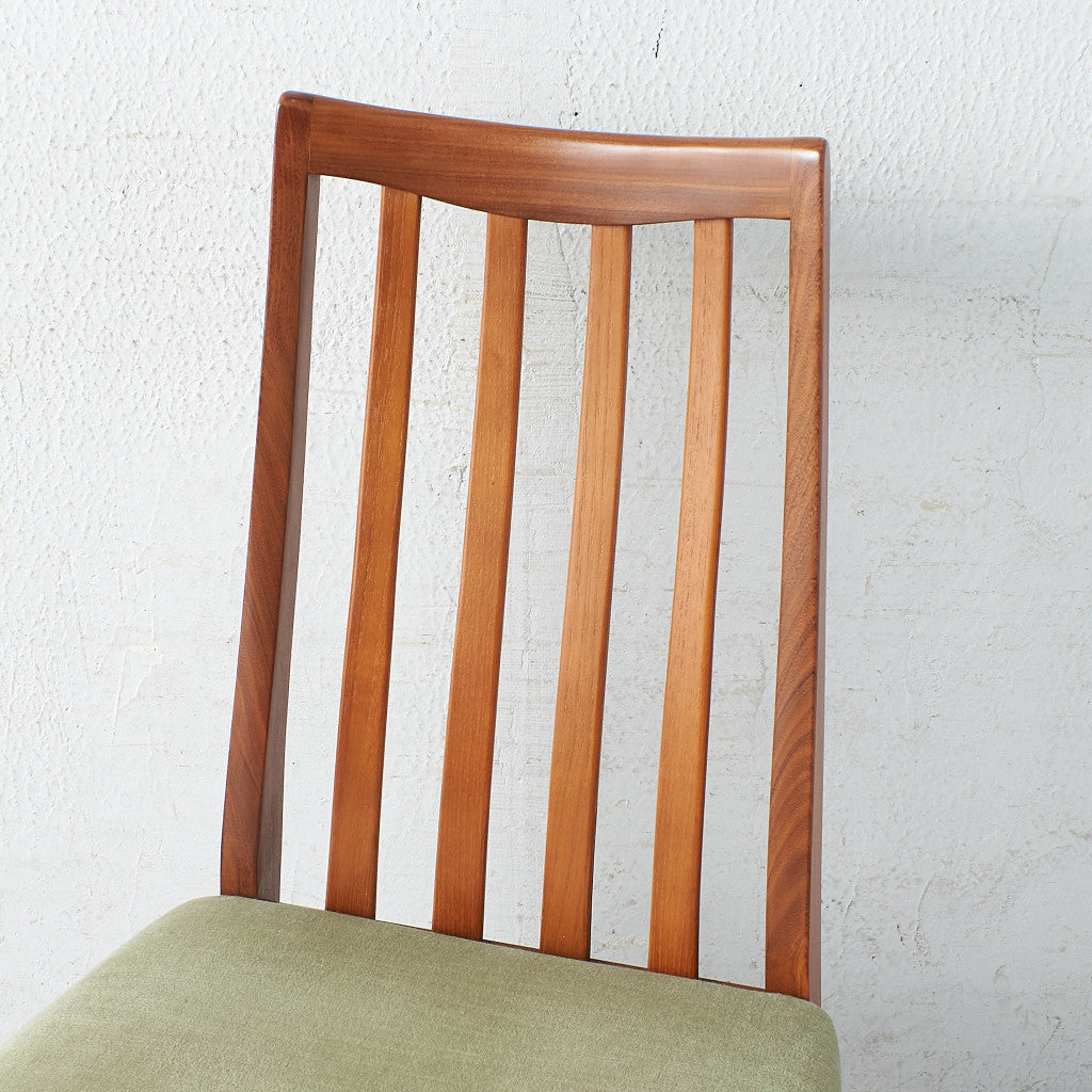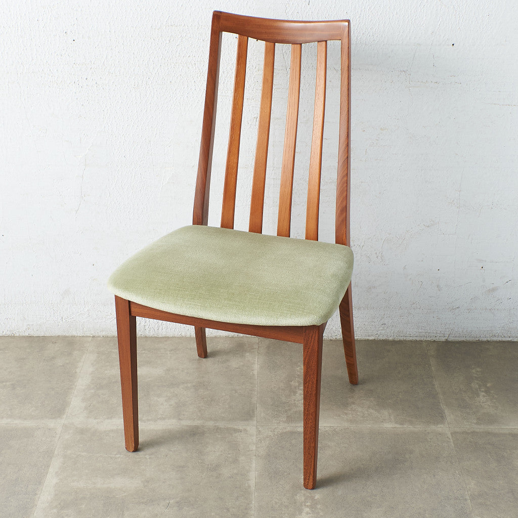Leslie・G・ Dandy(レスリー・G・ダンディ)デザインのダイニングチェア。G-PLANを代表するチェアのひとつで、当時大ヒットした作品です。1972年の発売から1987年までの間、毎週2,000脚も製造されていました。スラット部分に明るい褐色のチーク材を使用、緩めのカーブが繊細さを感じさせつつも、シャープな印象になりすぎない、特別な魅力のあるチェアです。