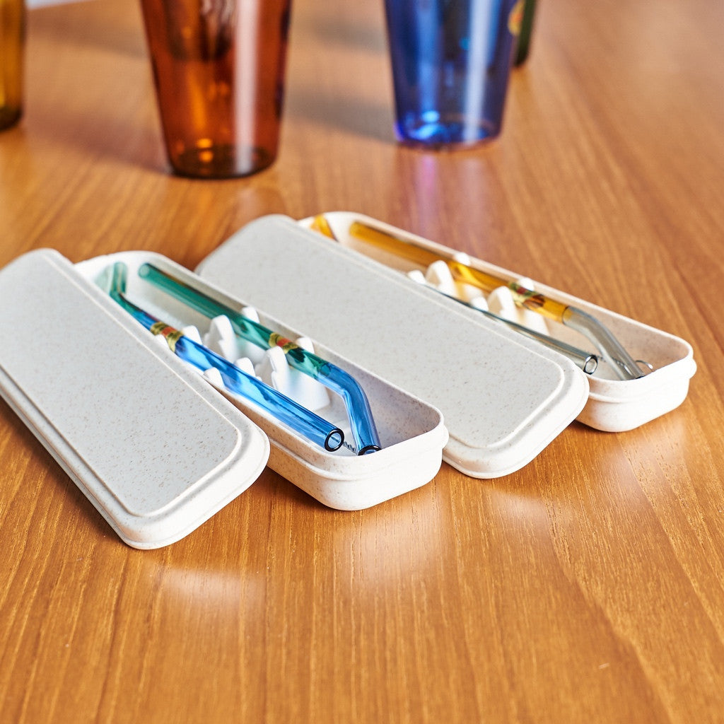 繰り返し使用することができる耐熱ガラスのストローです。ガラスのもつ上質で繊細な雰囲気とポップなバイカラーの組み合わせが印象的。天然の小麦からつくられた素材を採用した持ち運びケース付き。