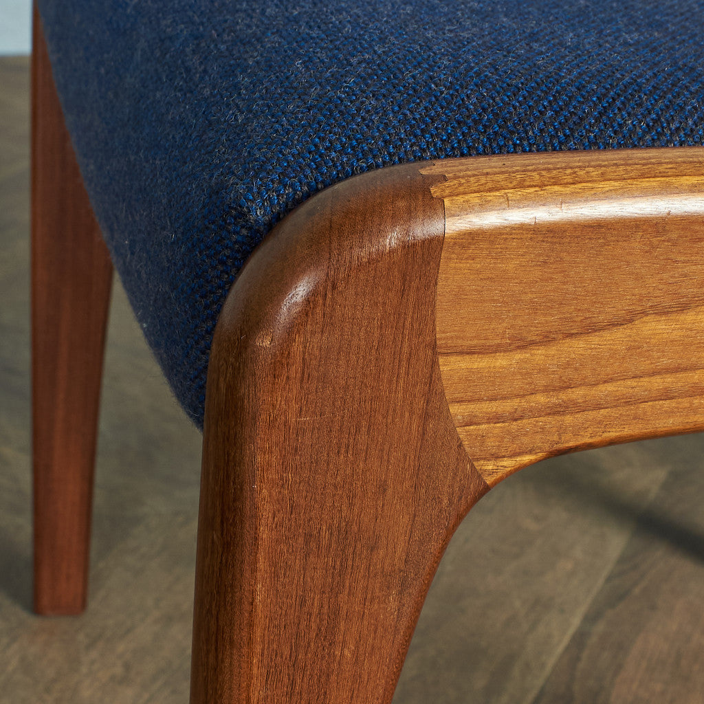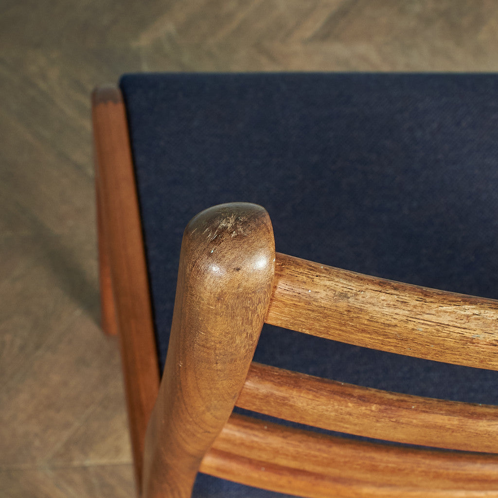 リージェンシー風の座面の左右を挟み込むようなフレームにはしご状の背もたれを備えた美しいフォルムのチェア、緩やかに曲線のついた背もたれは心地よく身体をホールドします。北欧デザインをルーツにクラシックのエッセンスを加えた独特のスタイルはG-PLANコレクションの中でも異彩。流通量も少ないレアモデルです。